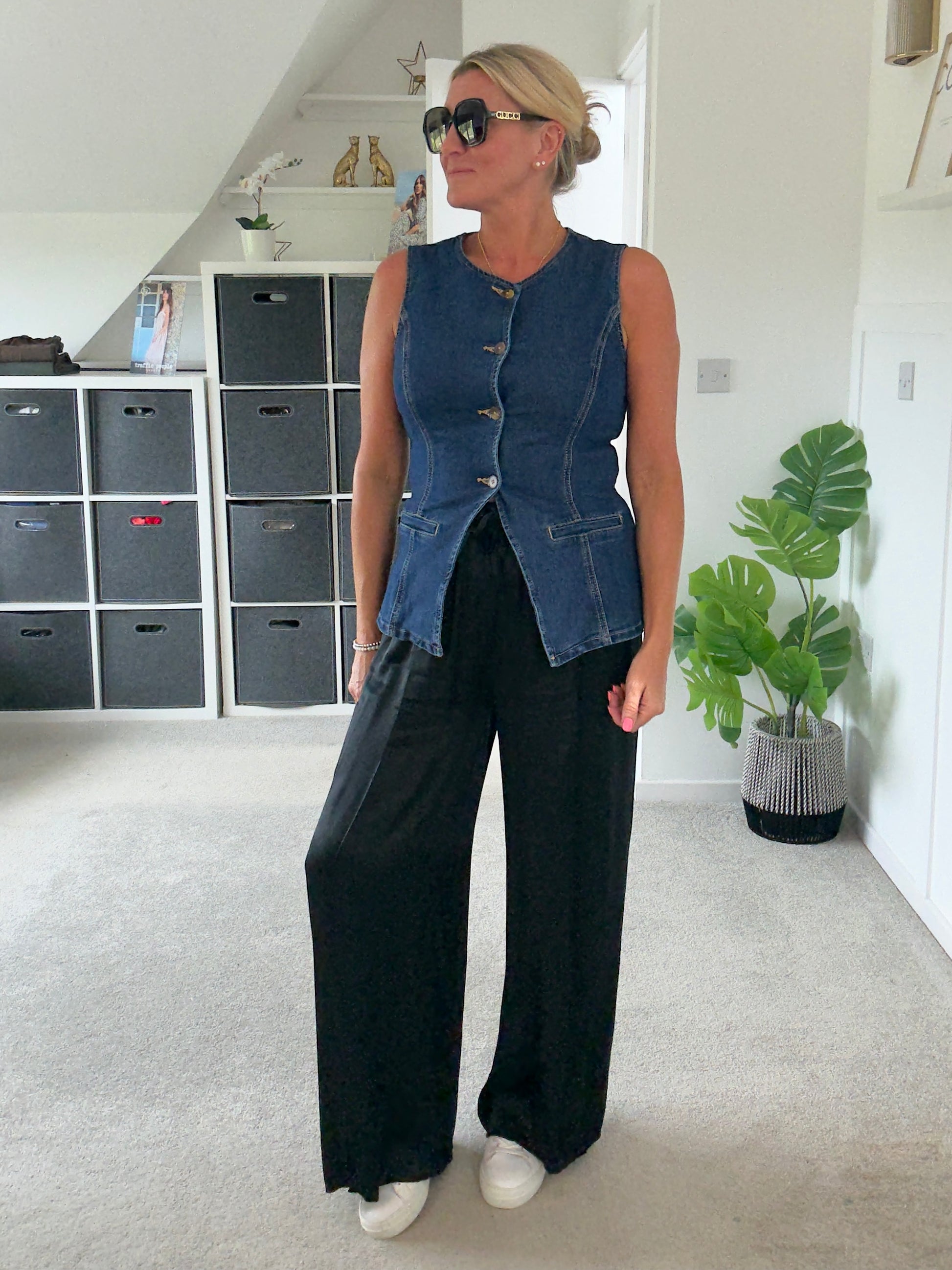 On trend denim waistcoat with 4 buttons and faux pocket detail on the front. A nice longer length with a lovely shape to it. It has a good stretch to it aswell...Style over trousers and skirts for a smart/casual look.