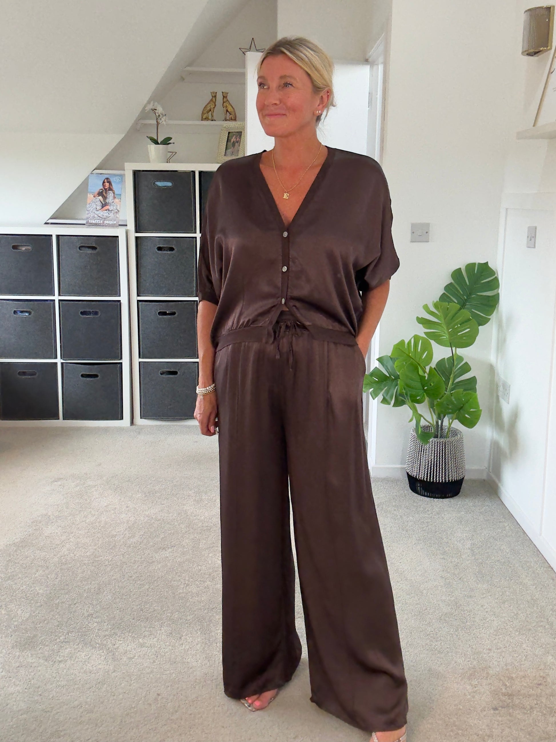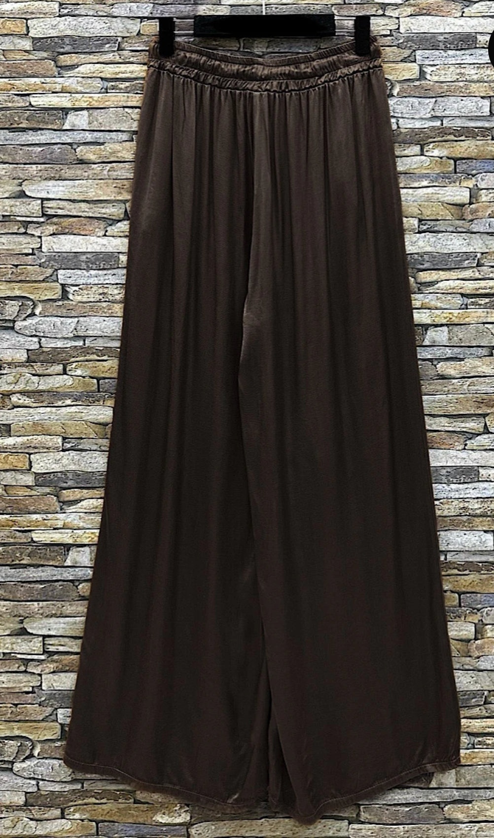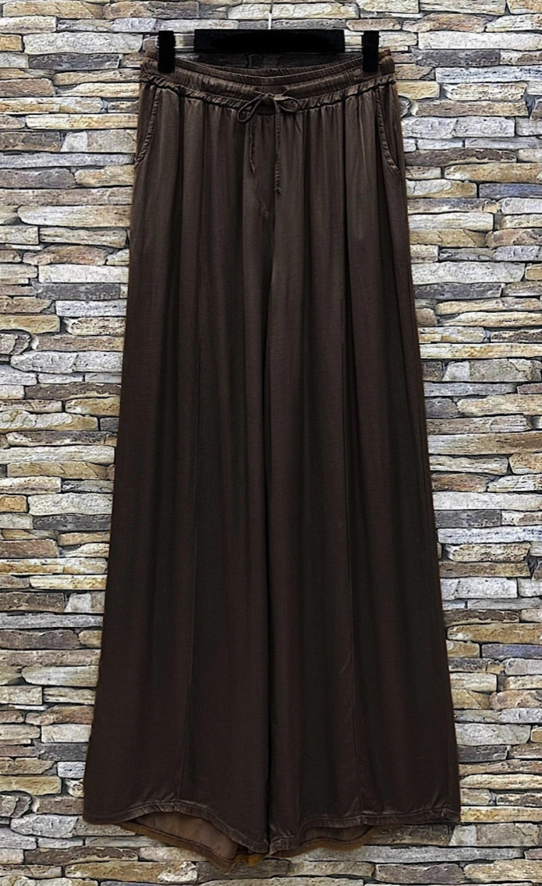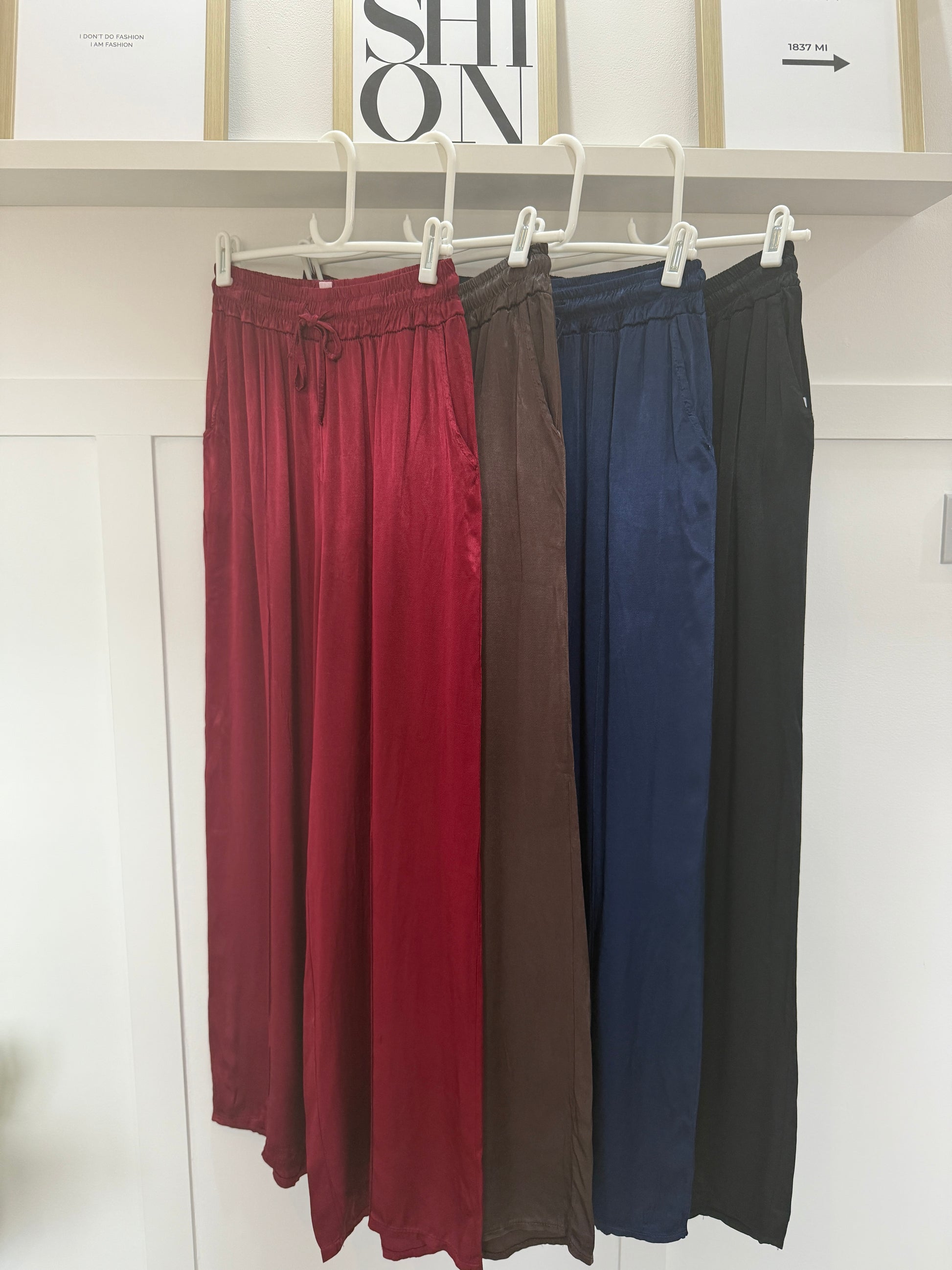 Easy, breezy, and endlessly wearable, these plain wide leg trousers are your go-to for effortless style. Made from soft, silky/satin viscose with a fluid drape and elasticated waistband and drawstring tie, they offer all-day comfort with a flattering, laid-back fit.