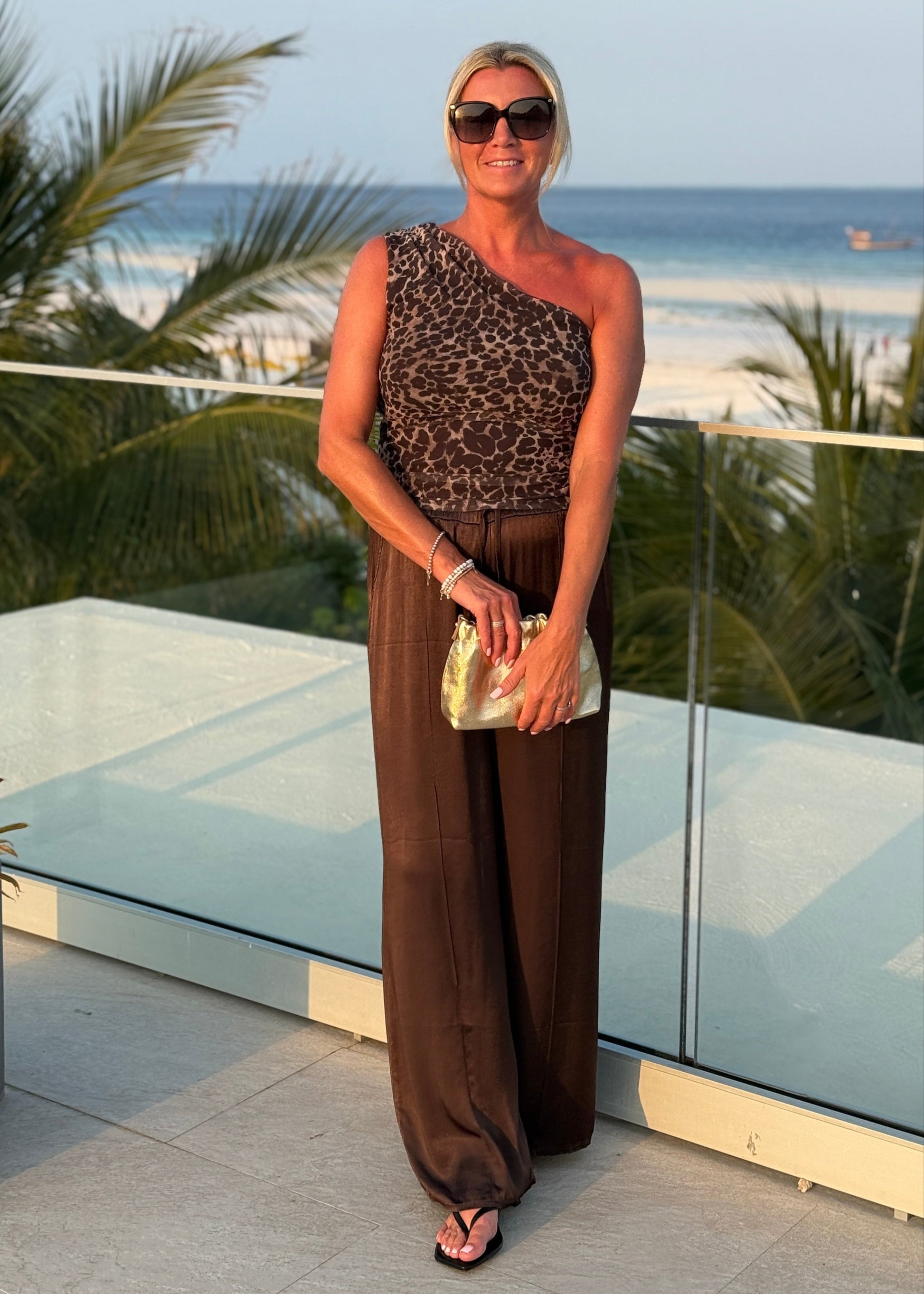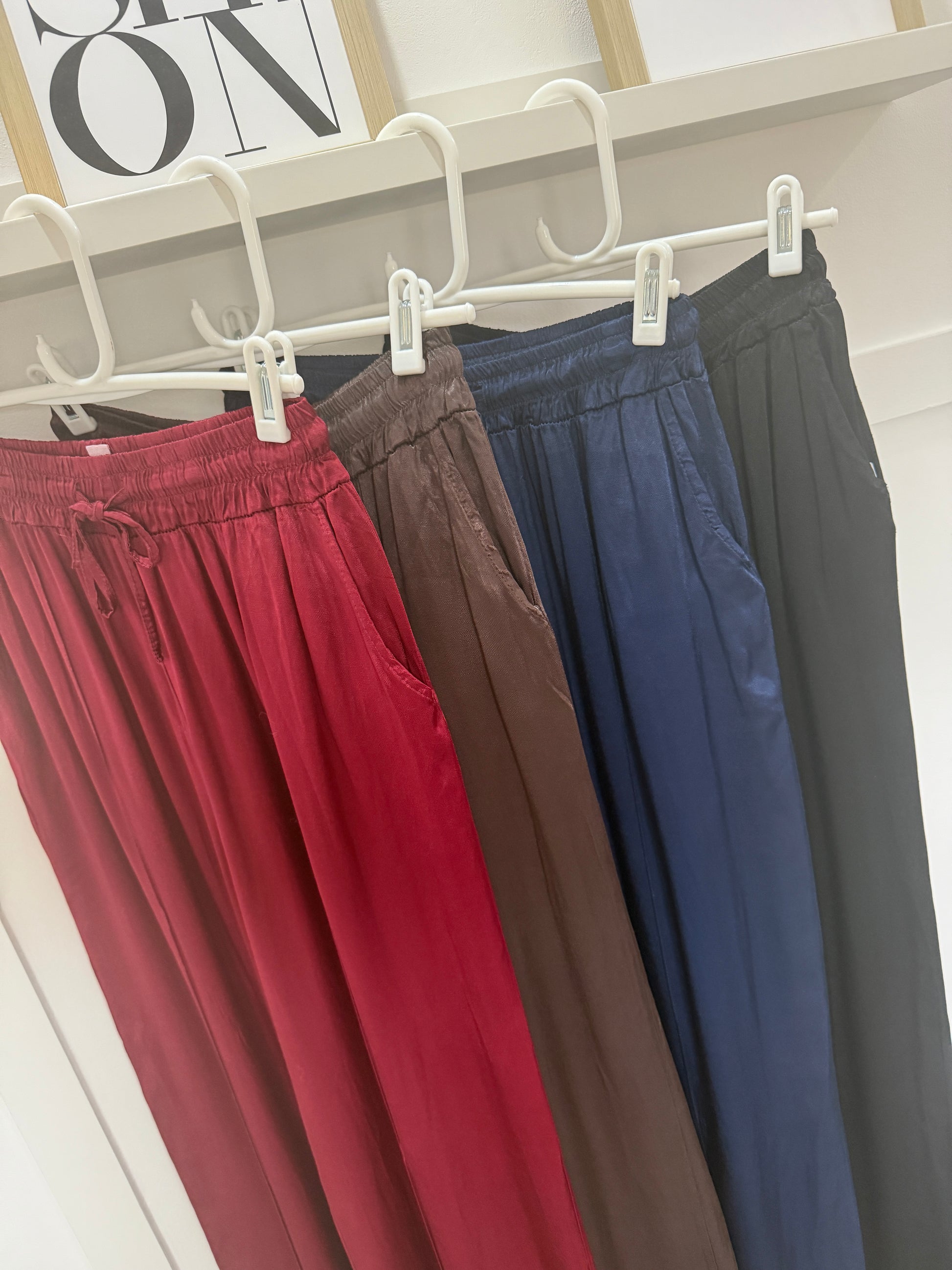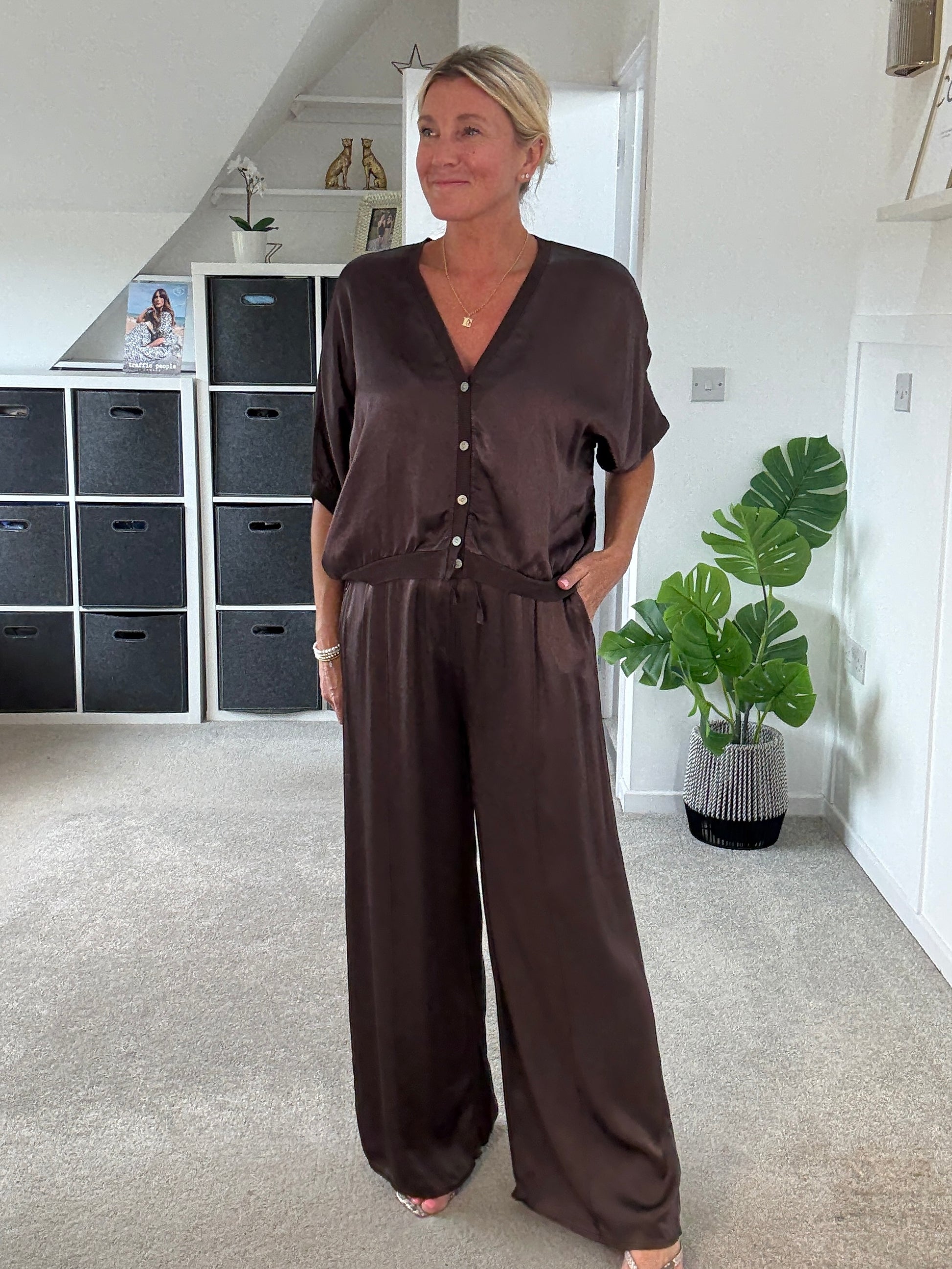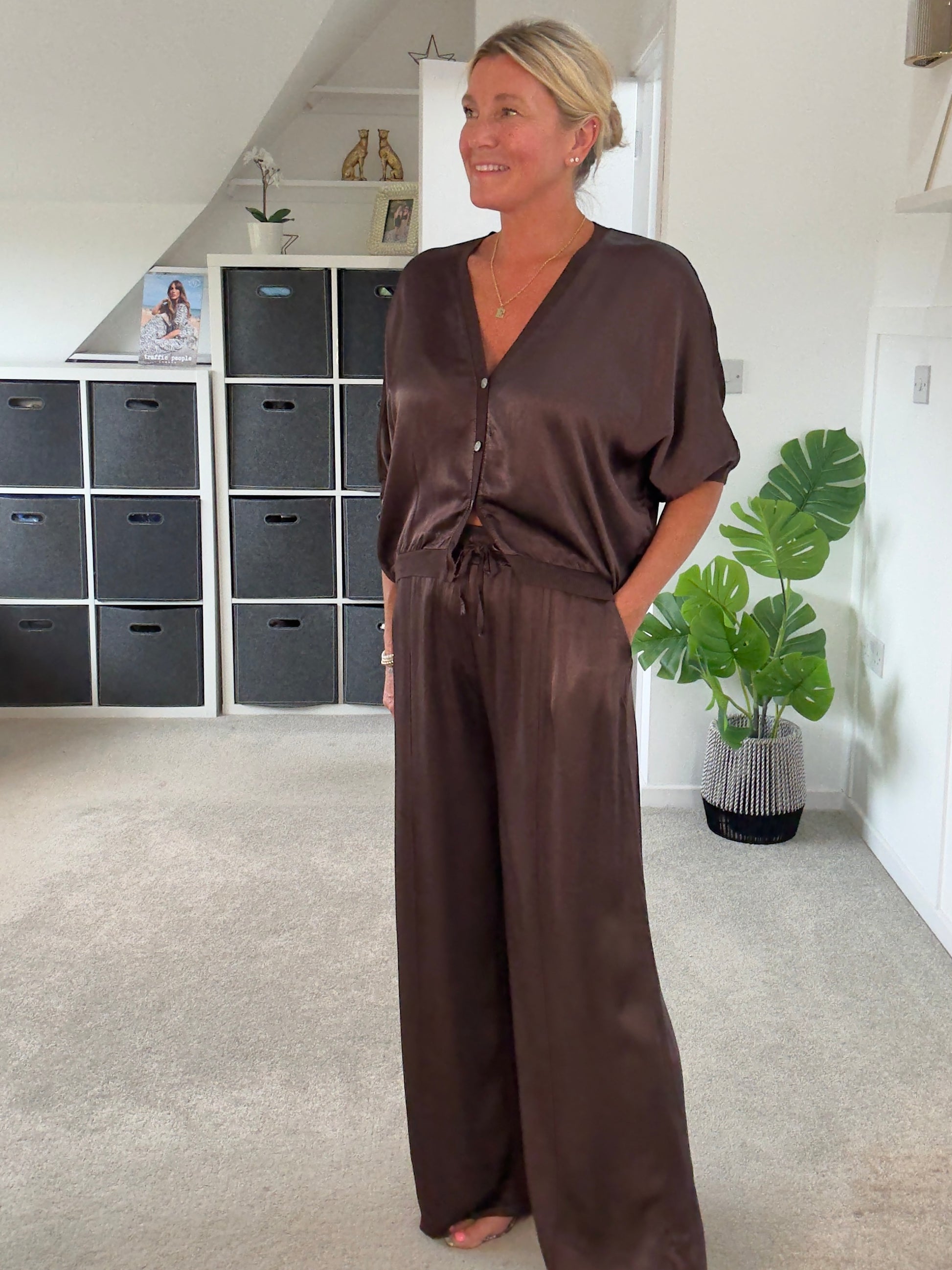 Easy, breezy, and endlessly wearable, these plain wide leg trousers are your go-to for effortless style. Made from soft, silky/satin viscose with a fluid drape and elasticated waistband and drawstring tie, they offer all-day comfort with a flattering, laid-back fit.