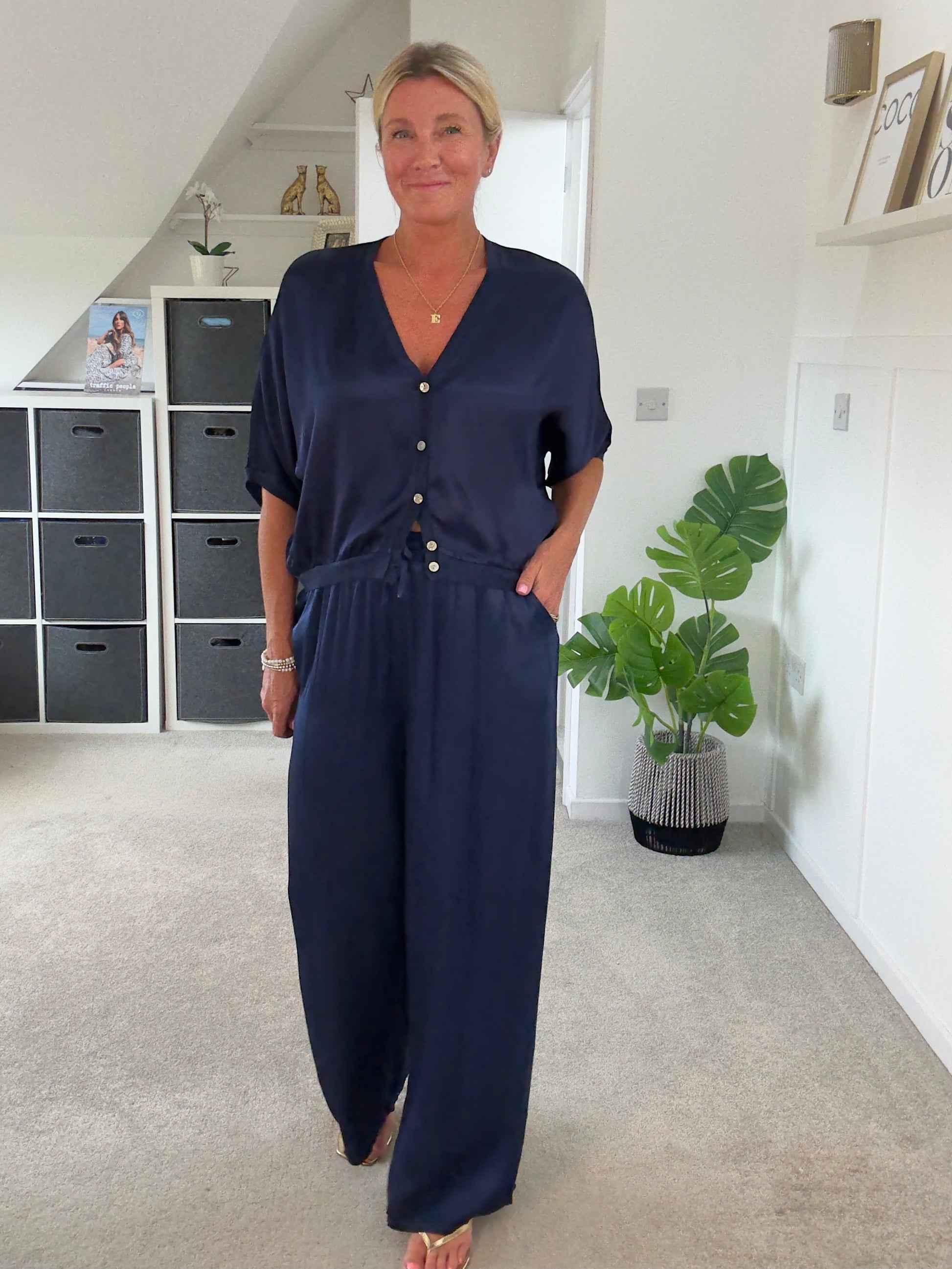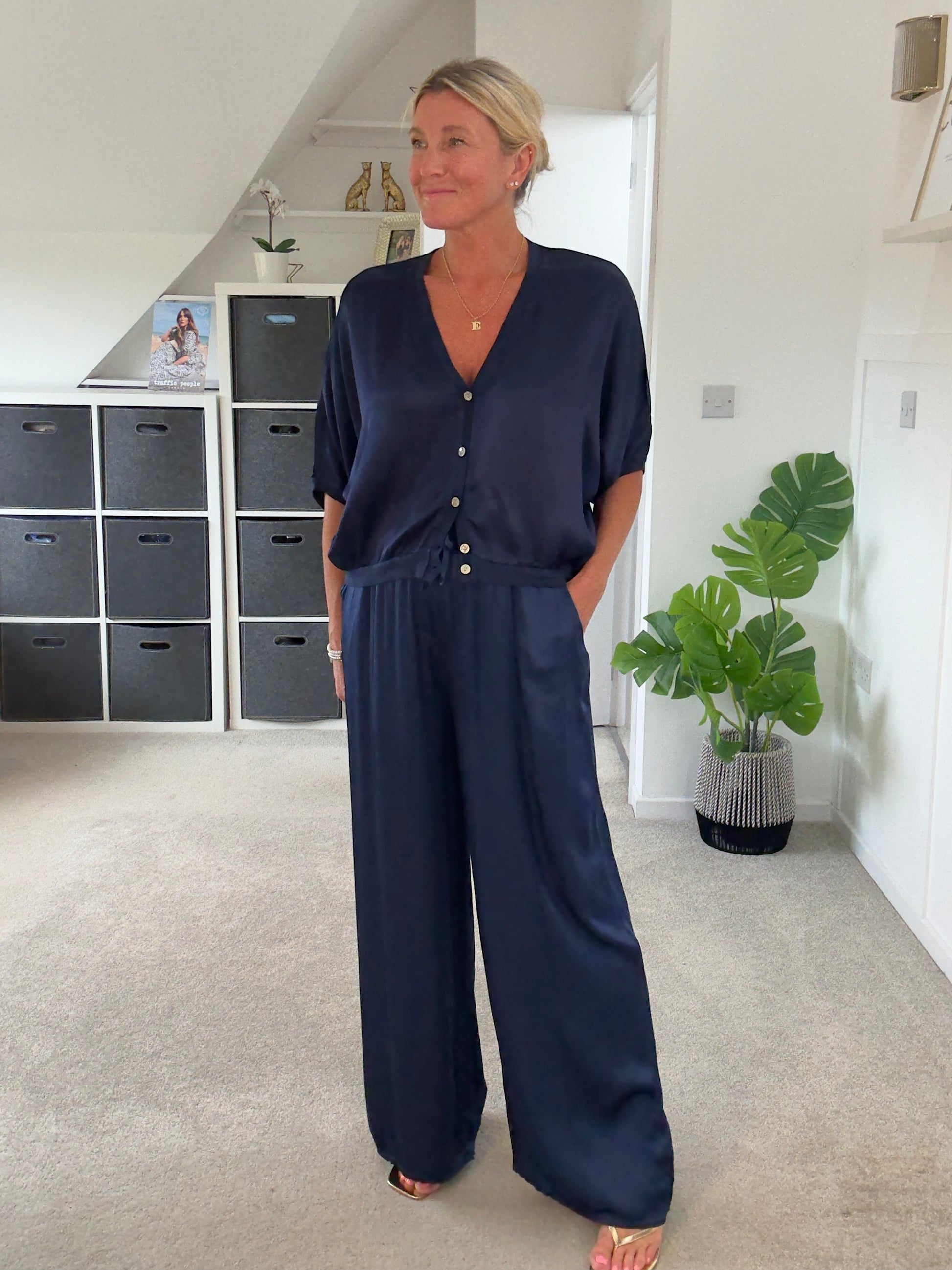Emy Navy Satin Wide Leg Trousers