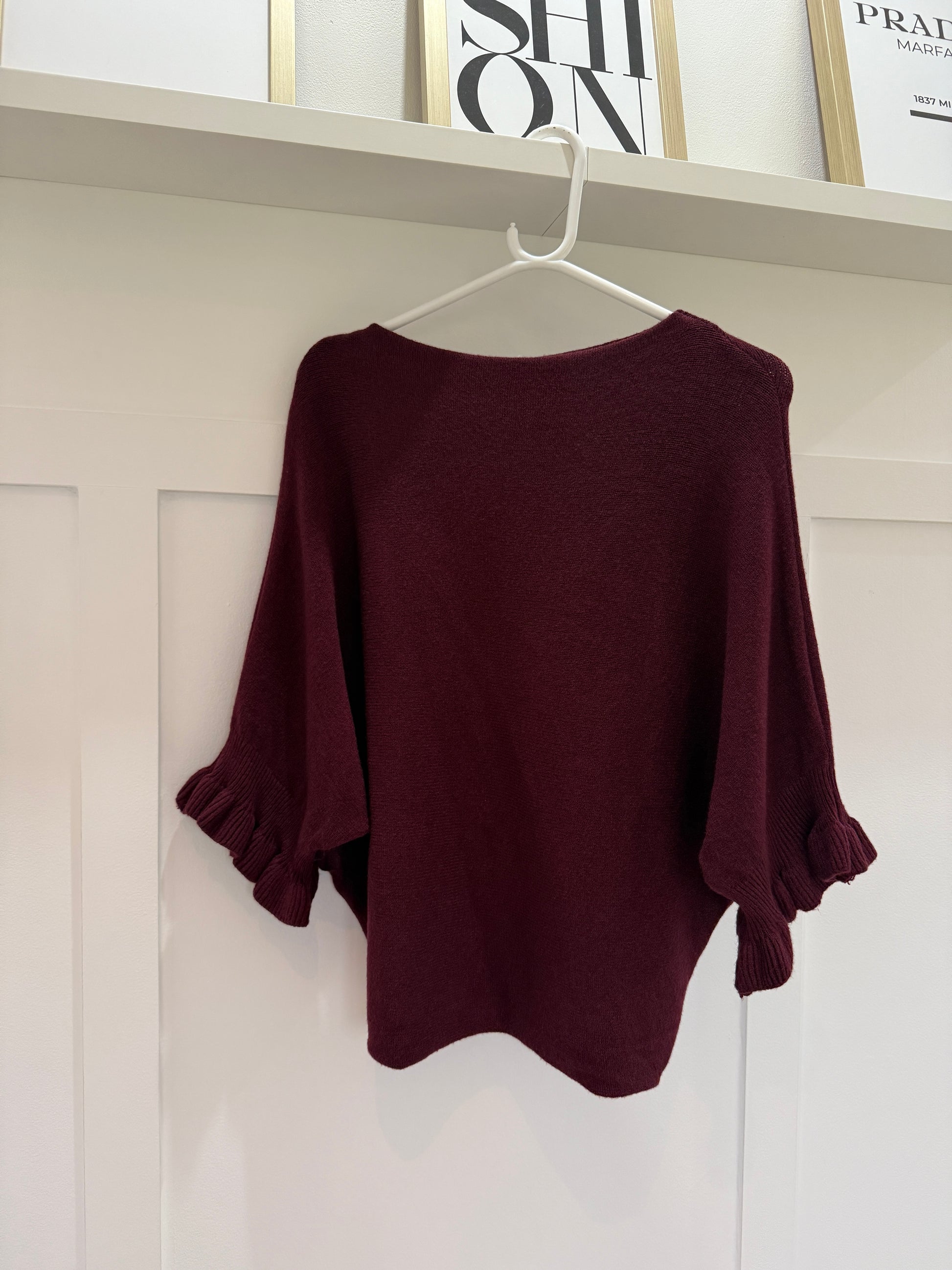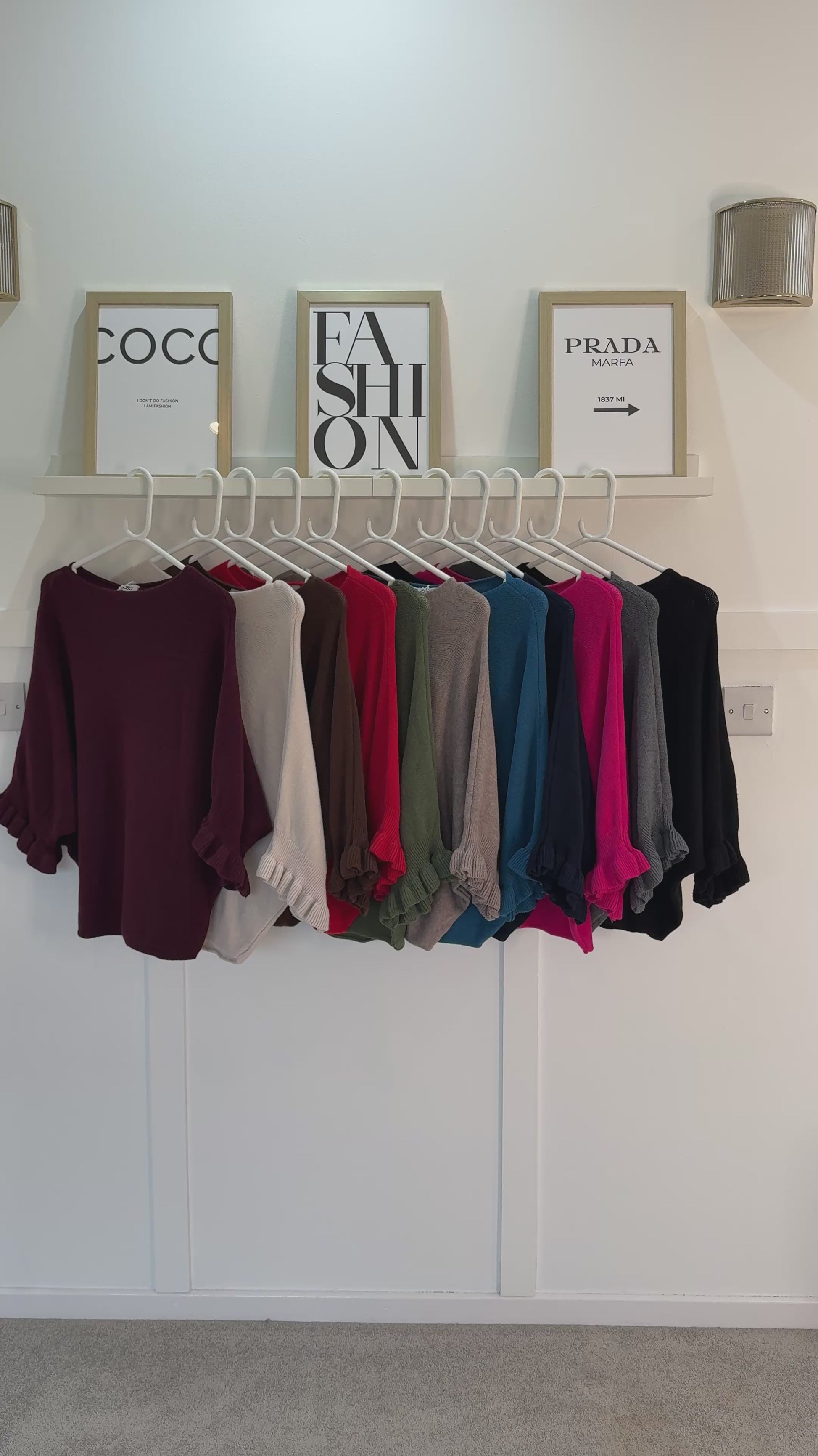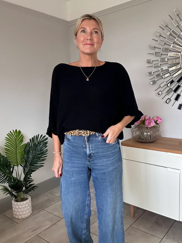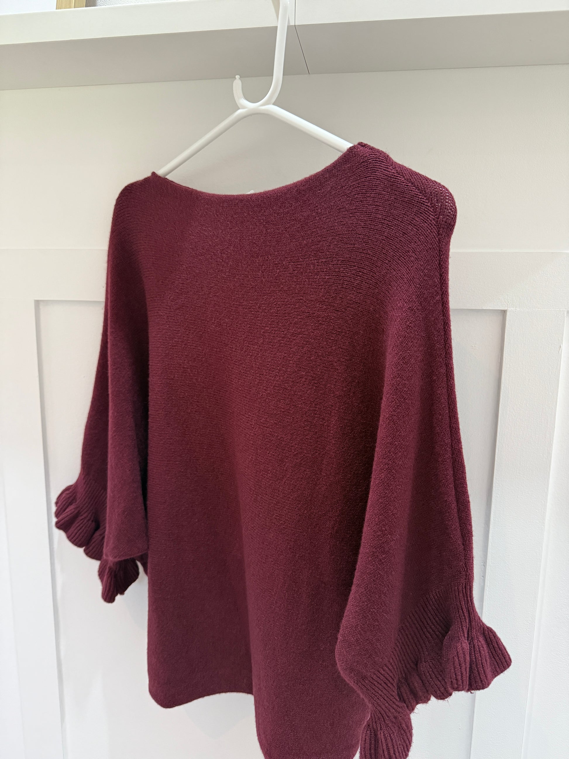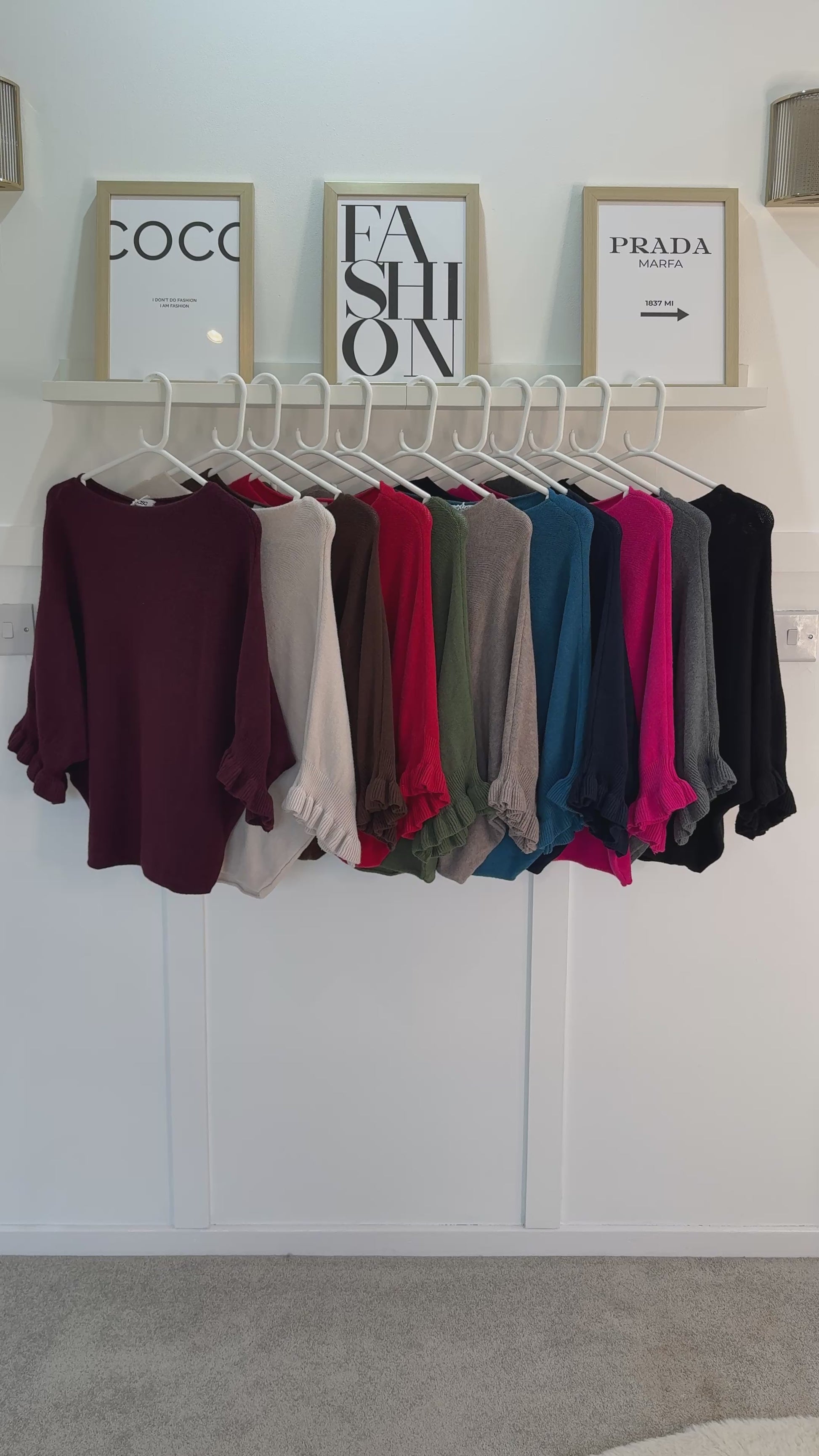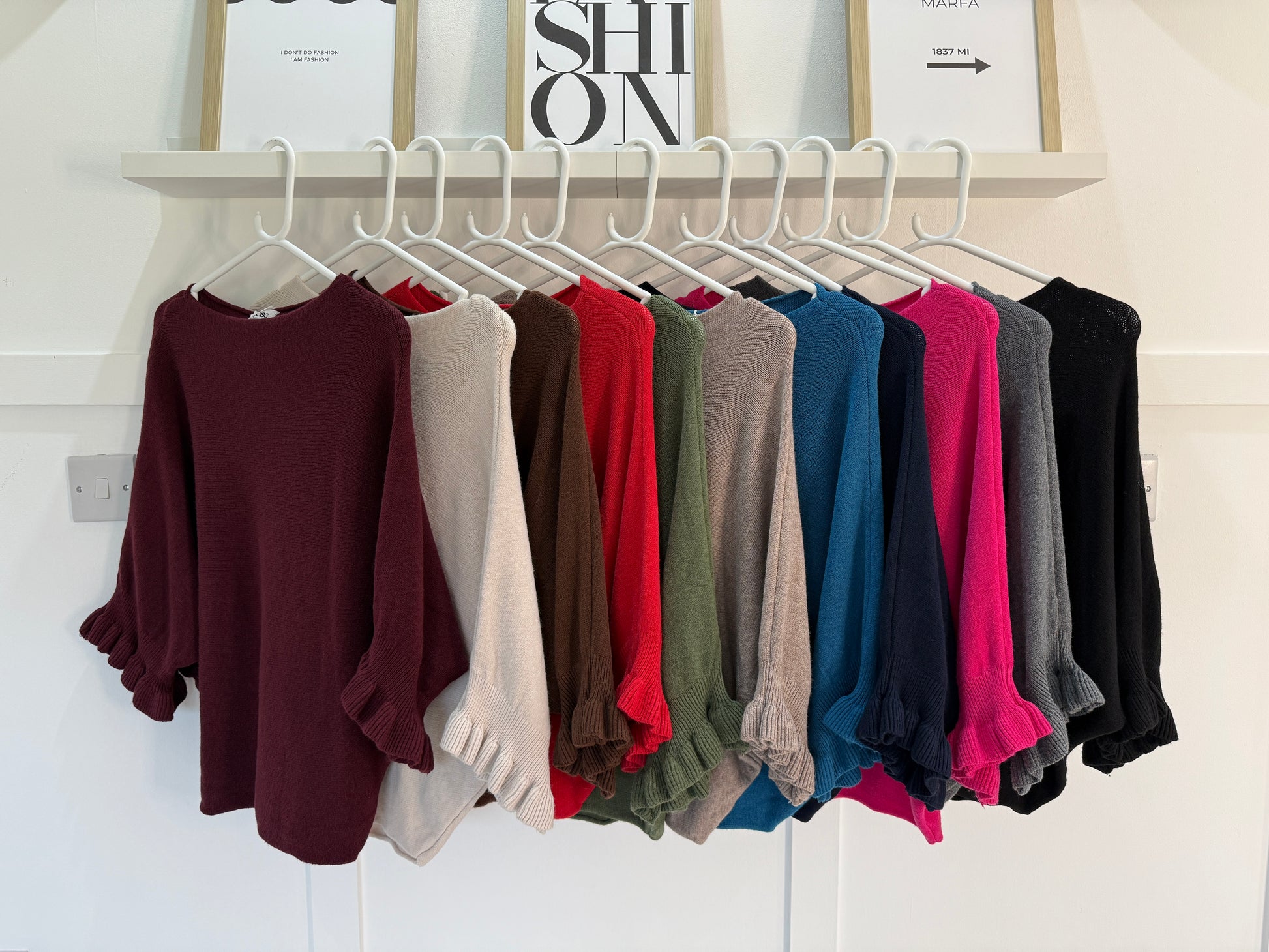 Absolutely gorgeous soft batwing jumper with cute 3/4 frill sleeves. Such a classic, flattering style. A nice one size relaxed fit that can be easily layered with a long sleeve top underneath.