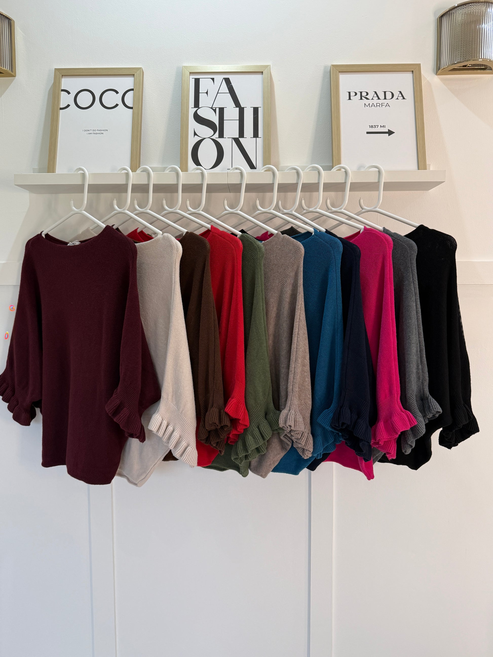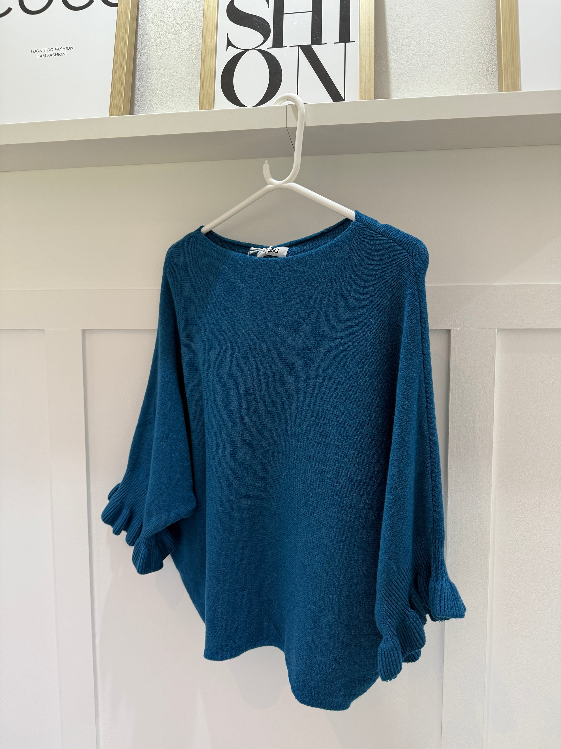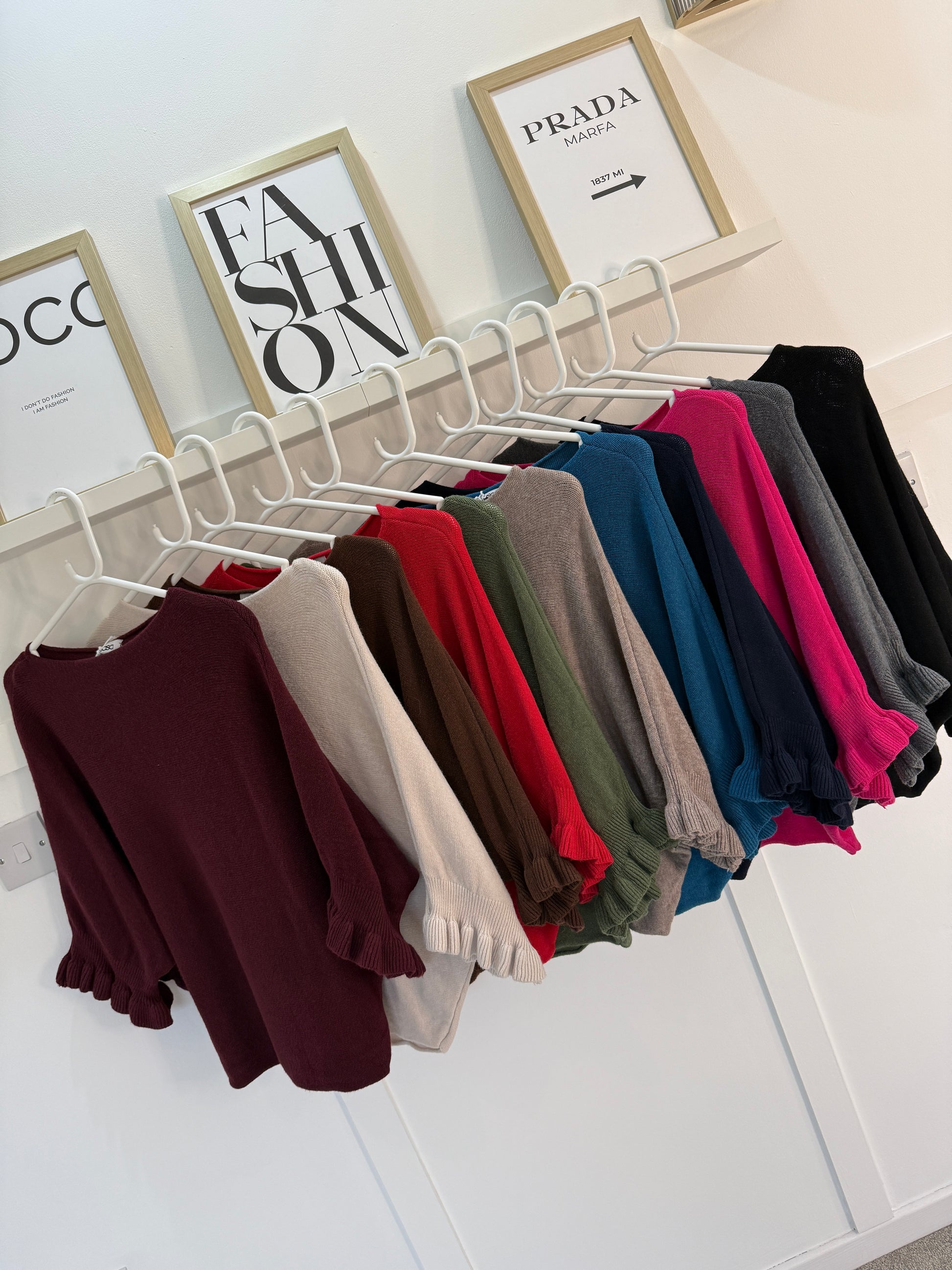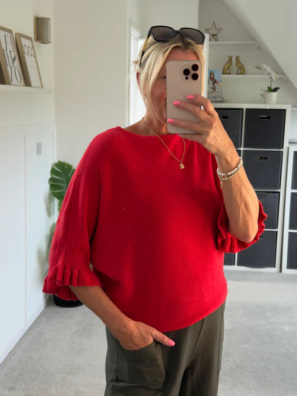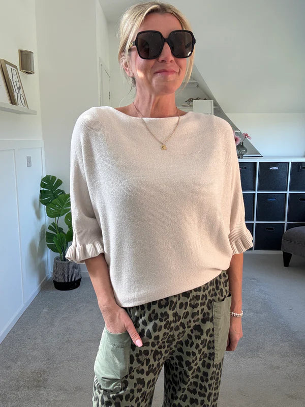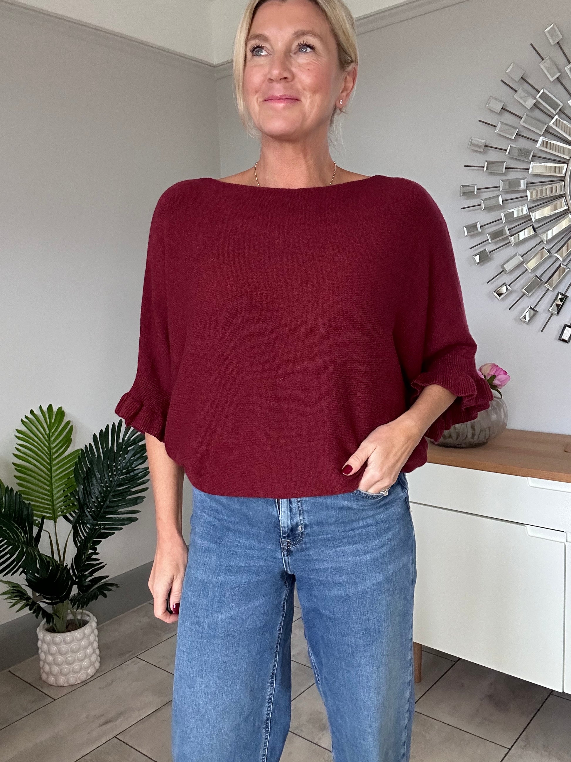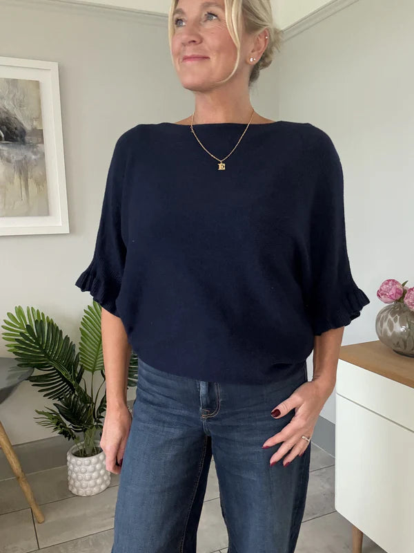 Absolutely gorgeous soft batwing jumper with cute 3/4 frill sleeves. Such a classic, flattering style. A nice one size relaxed fit that can be easily layered with a long sleeve top underneath.