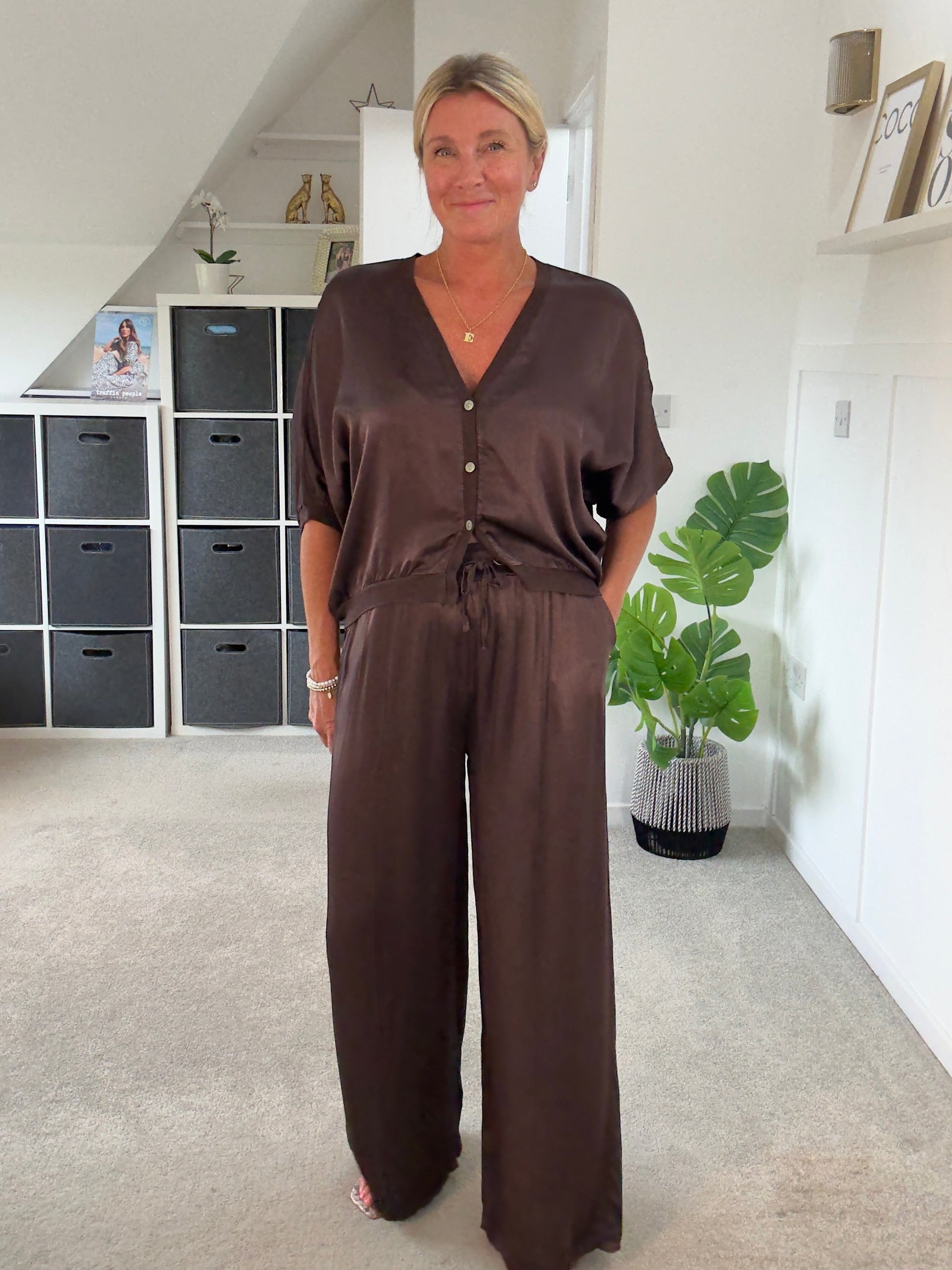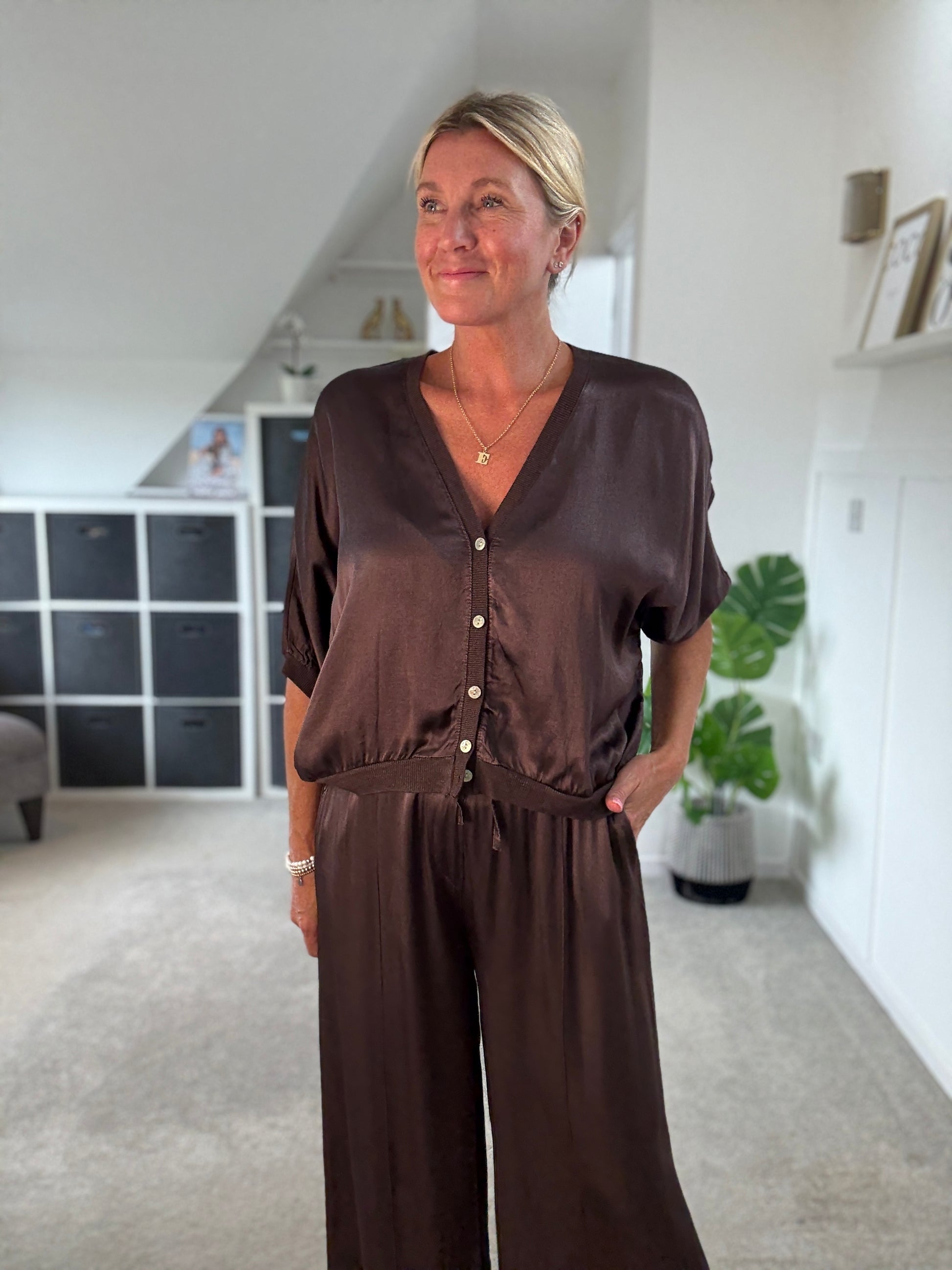 Super stylish cardi/jacket. Made from soft, silky/satin viscose, it drapes beautifully with a relaxed fit that layers effortlessly. Button it up and wear as a standout top over a cami, or leave it open over a Tee or for an easy, laid-back vibe.