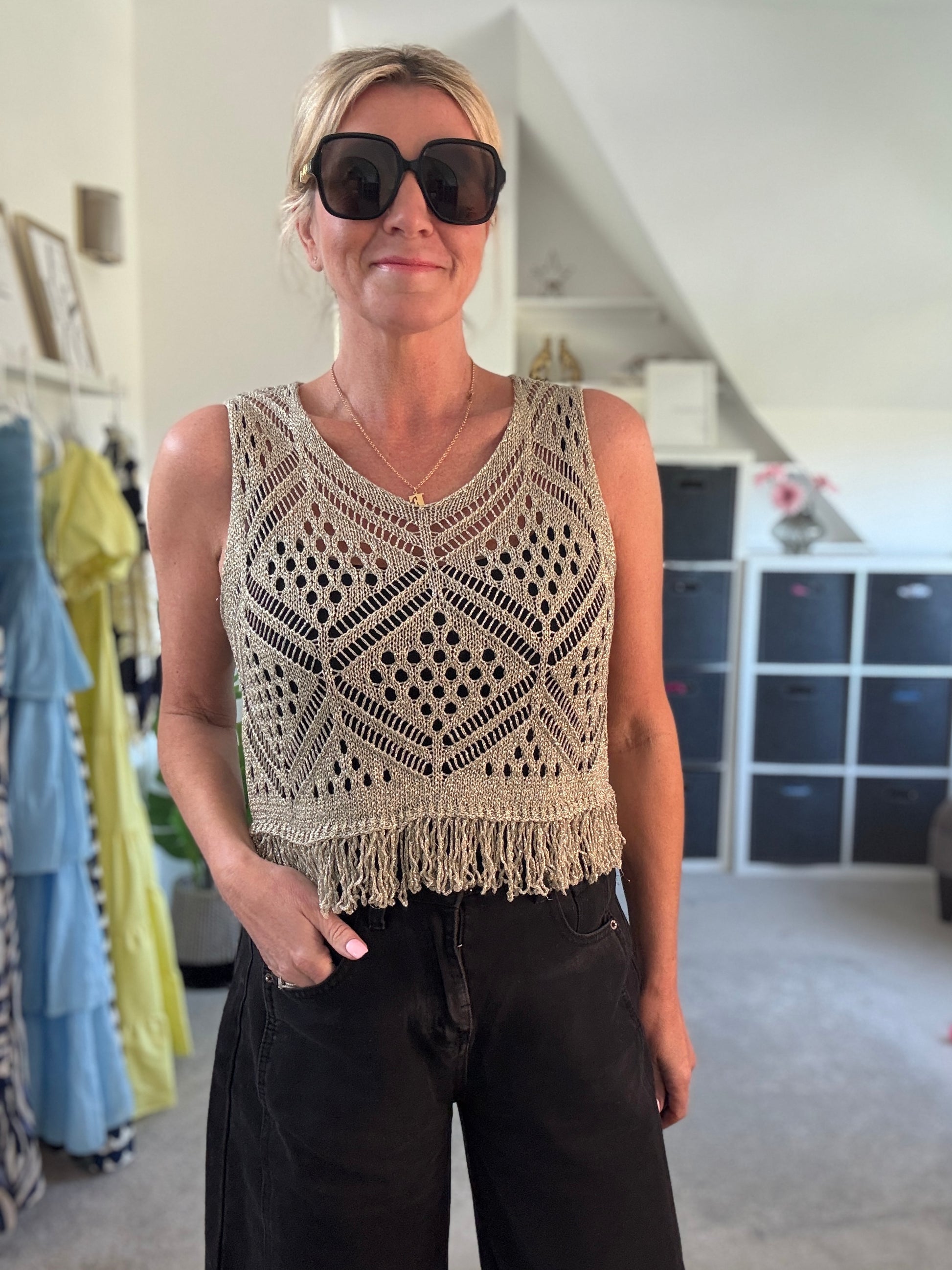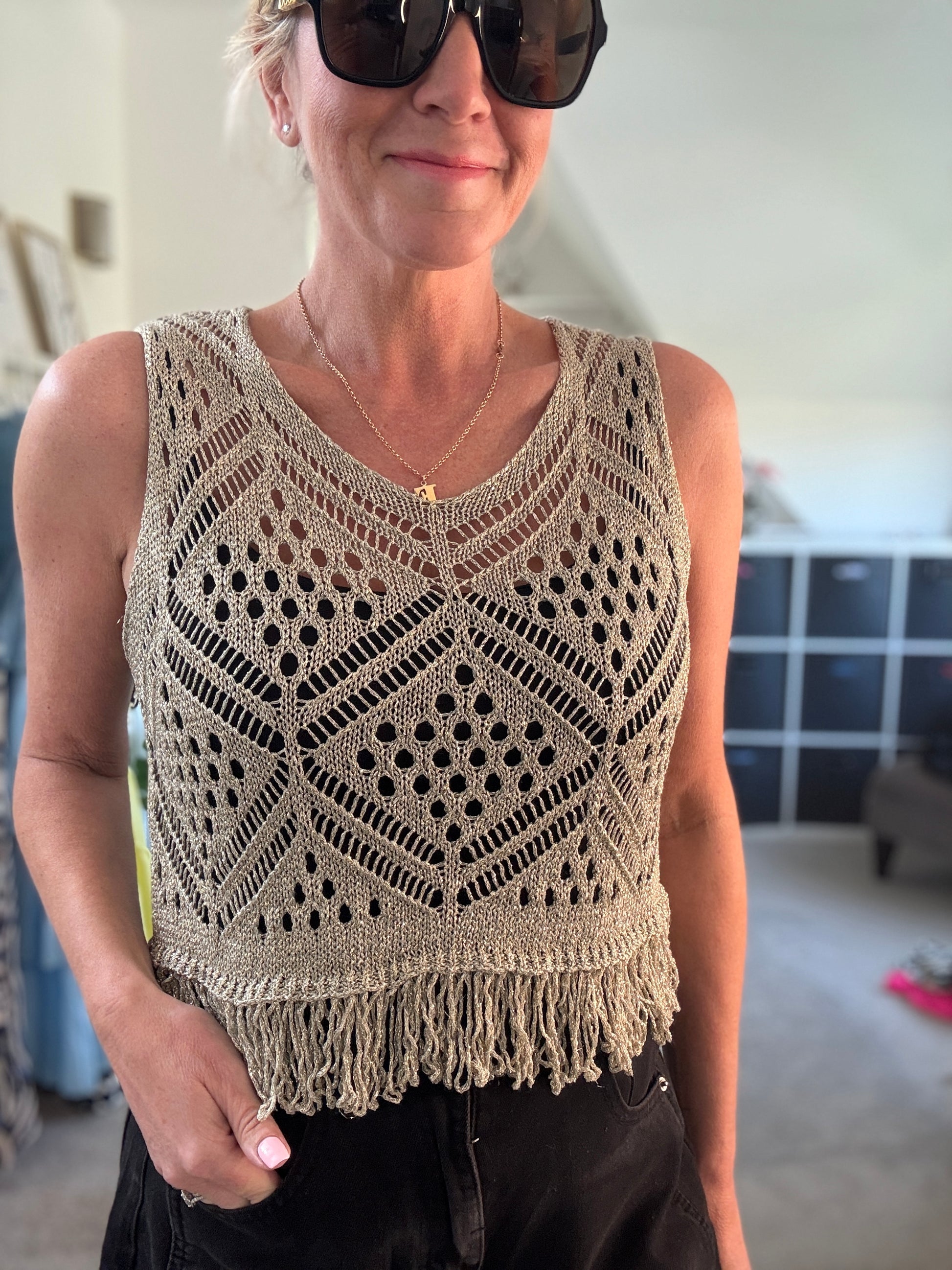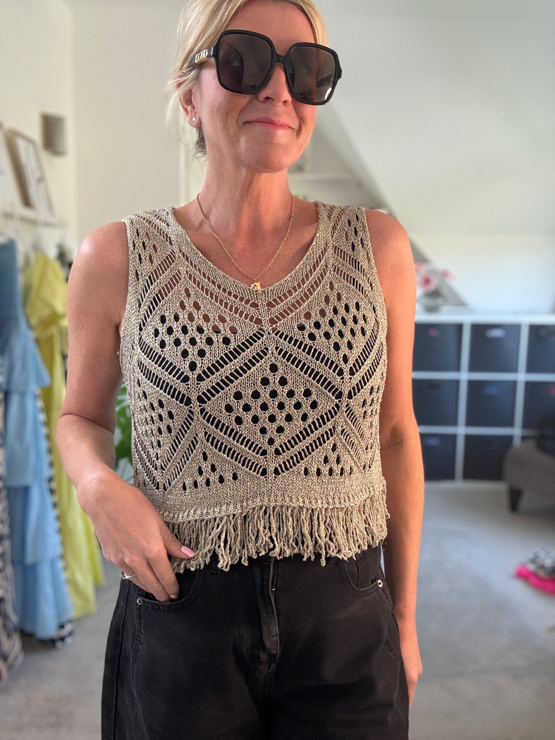 This stunning open weave metallic thread crochet top with fringe detailing will be a stunning glam addition to any summer or holiday wardrobe. Wear over vest tops and with jeans or shorts for a laid back vibe, or dress up with stain trousers or slip skirts!