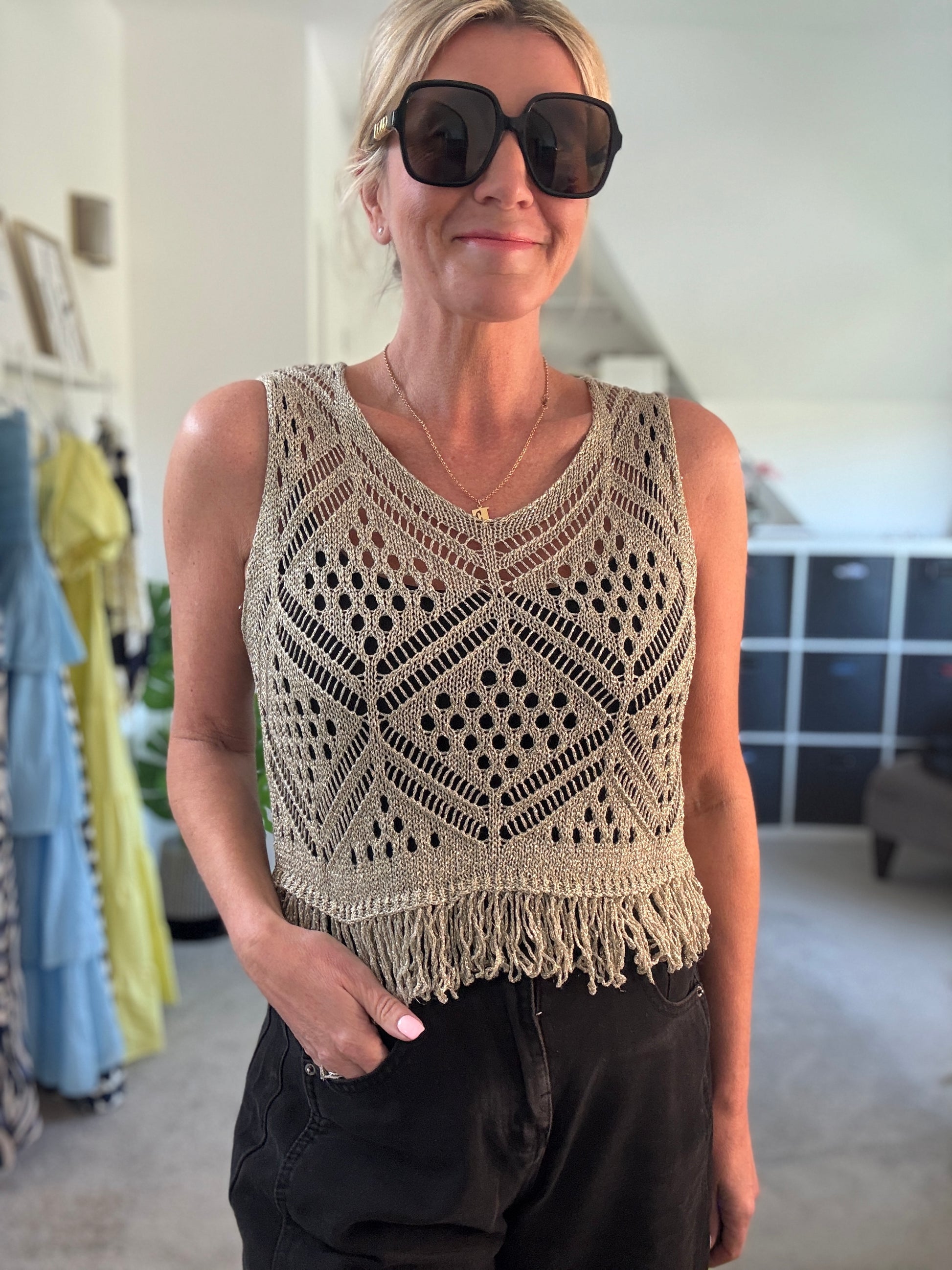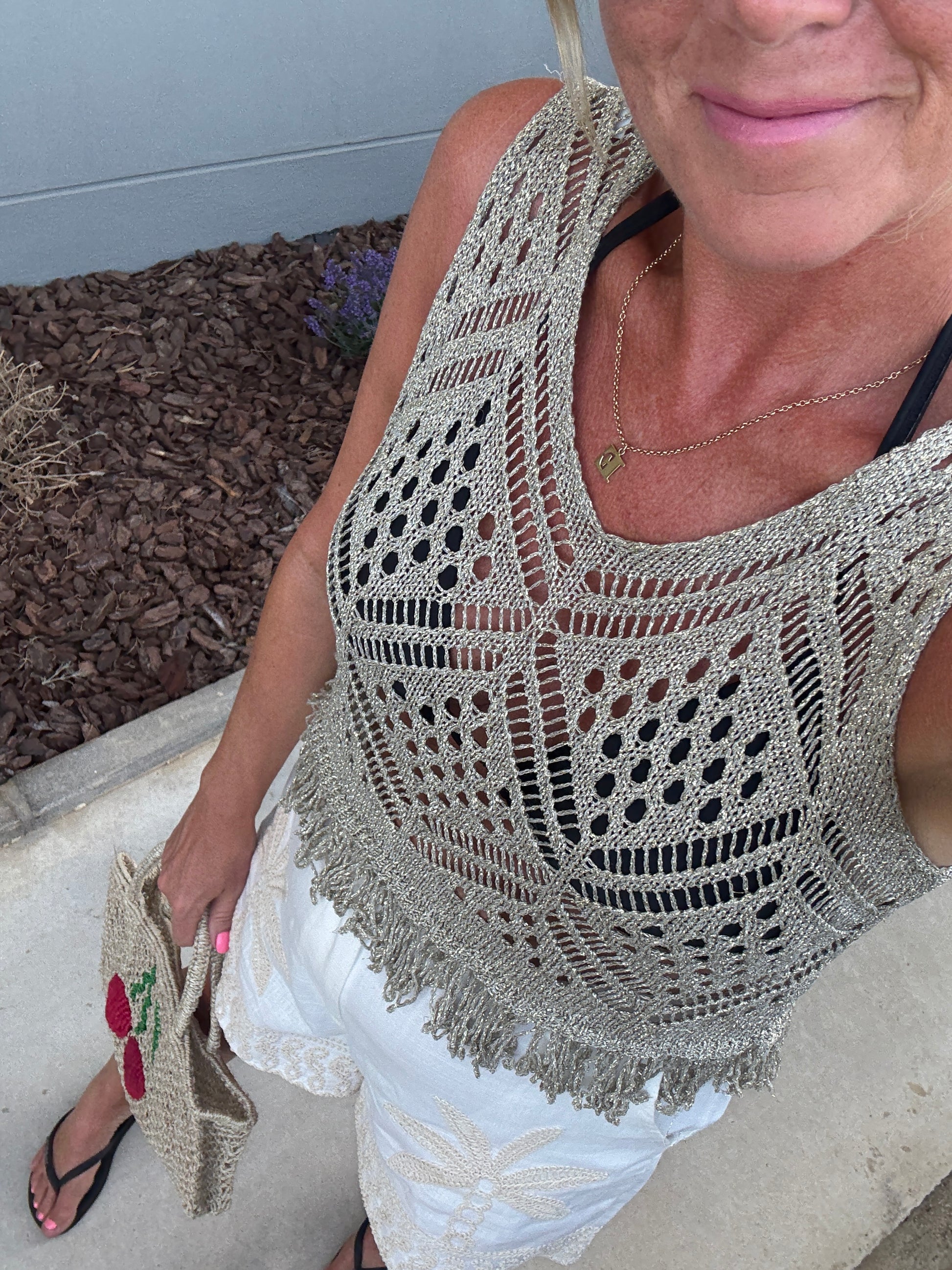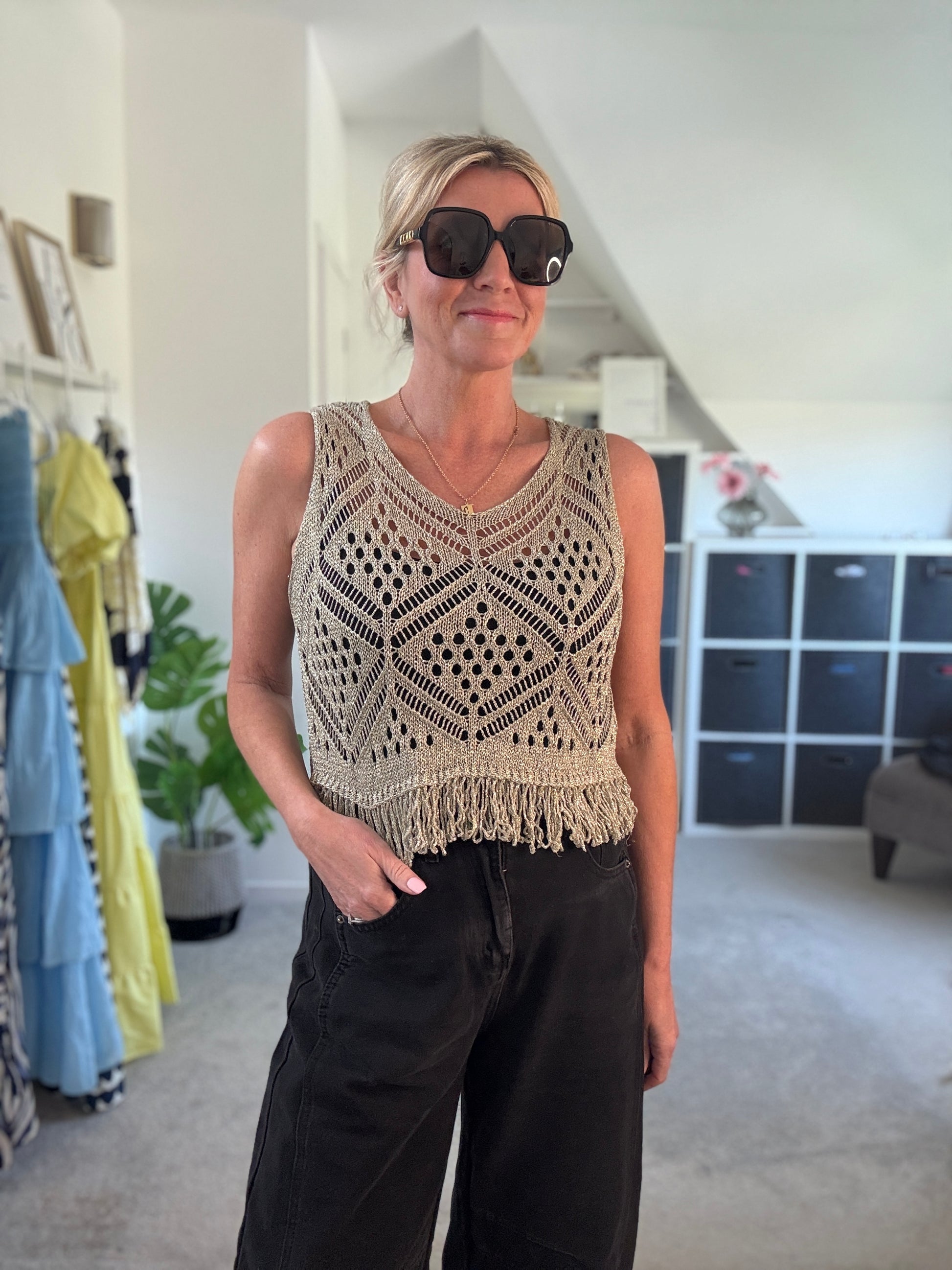 This stunning open weave metallic thread crochet top with fringe detailing will be a stunning glam addition to any summer or holiday wardrobe. Wear over vest tops and with jeans or shorts for a laid back vibe, or dress up with stain trousers or slip skirts!