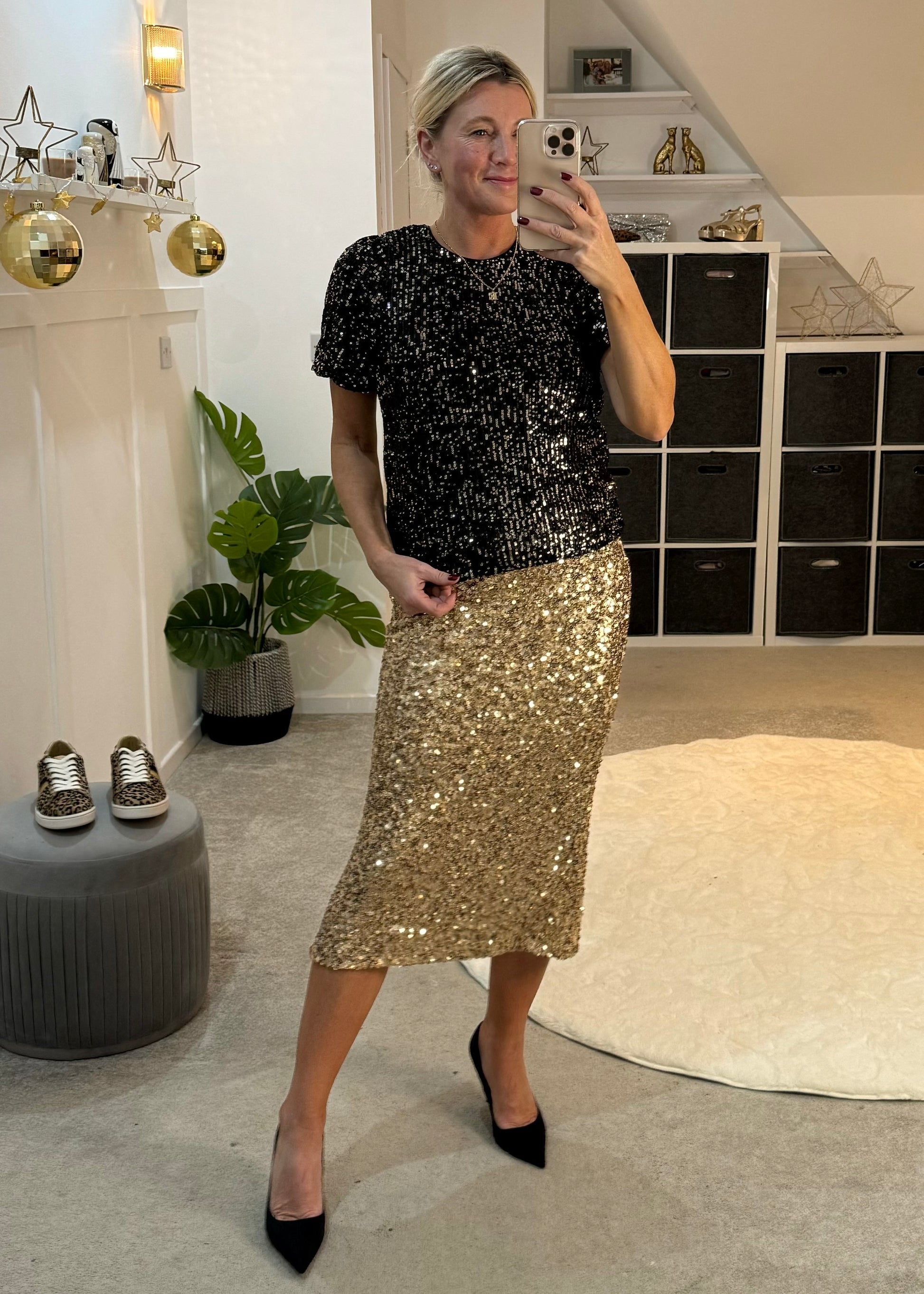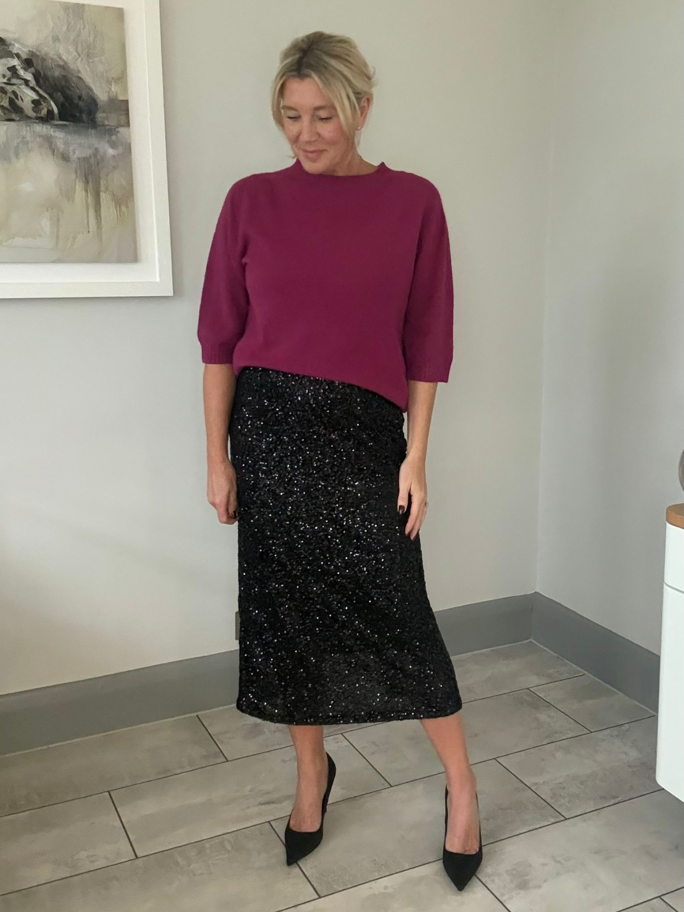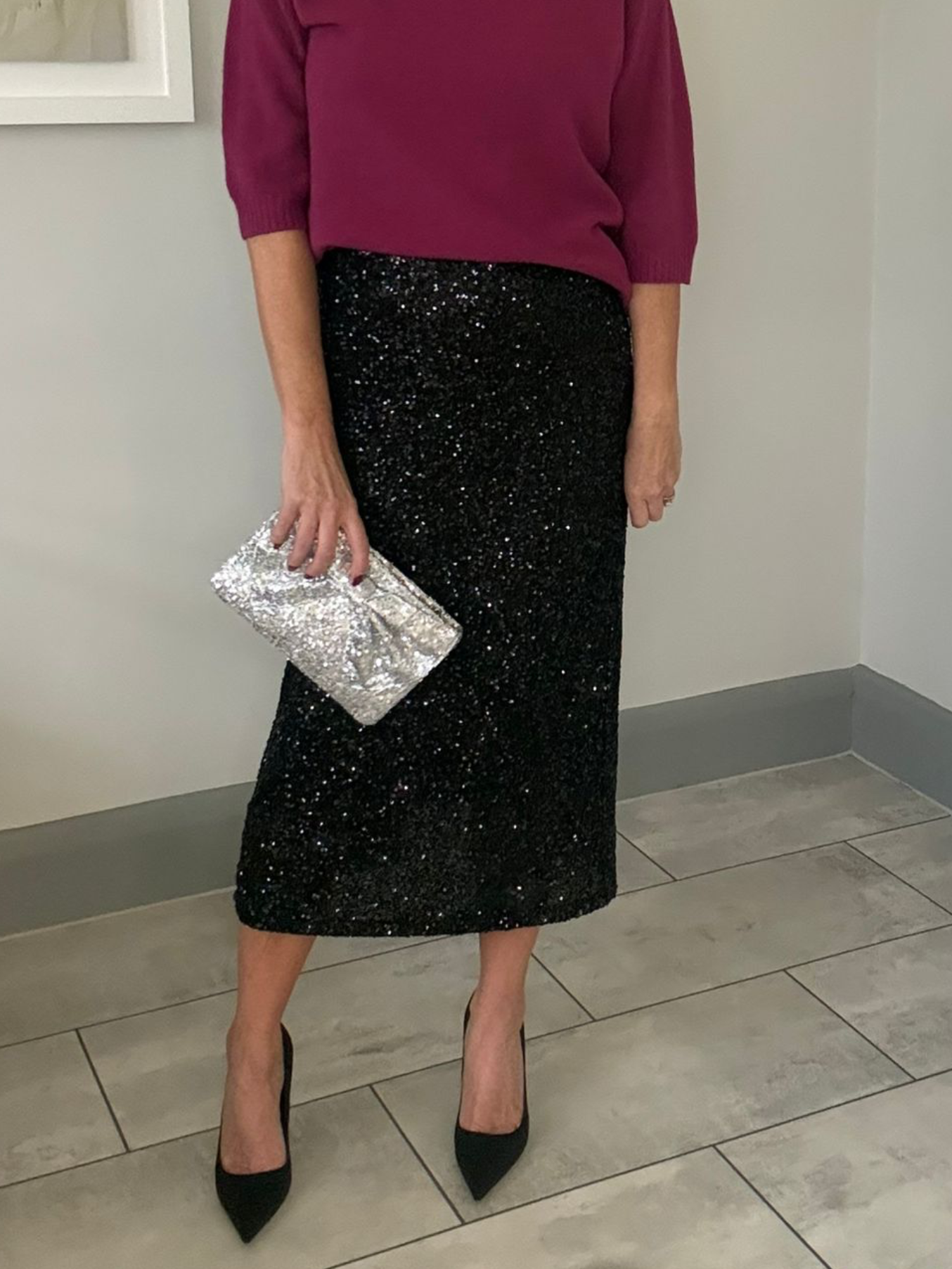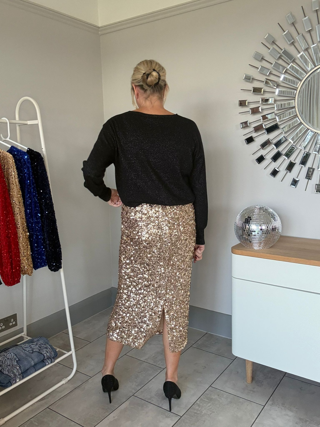Stunning sequin pencil midi skirt with back split. Super quality and it's fully lined. Wear with a sparkly knit for truly show stopping evening look. Or, team with T shirt or fine knit and heels for a more laid back party look.