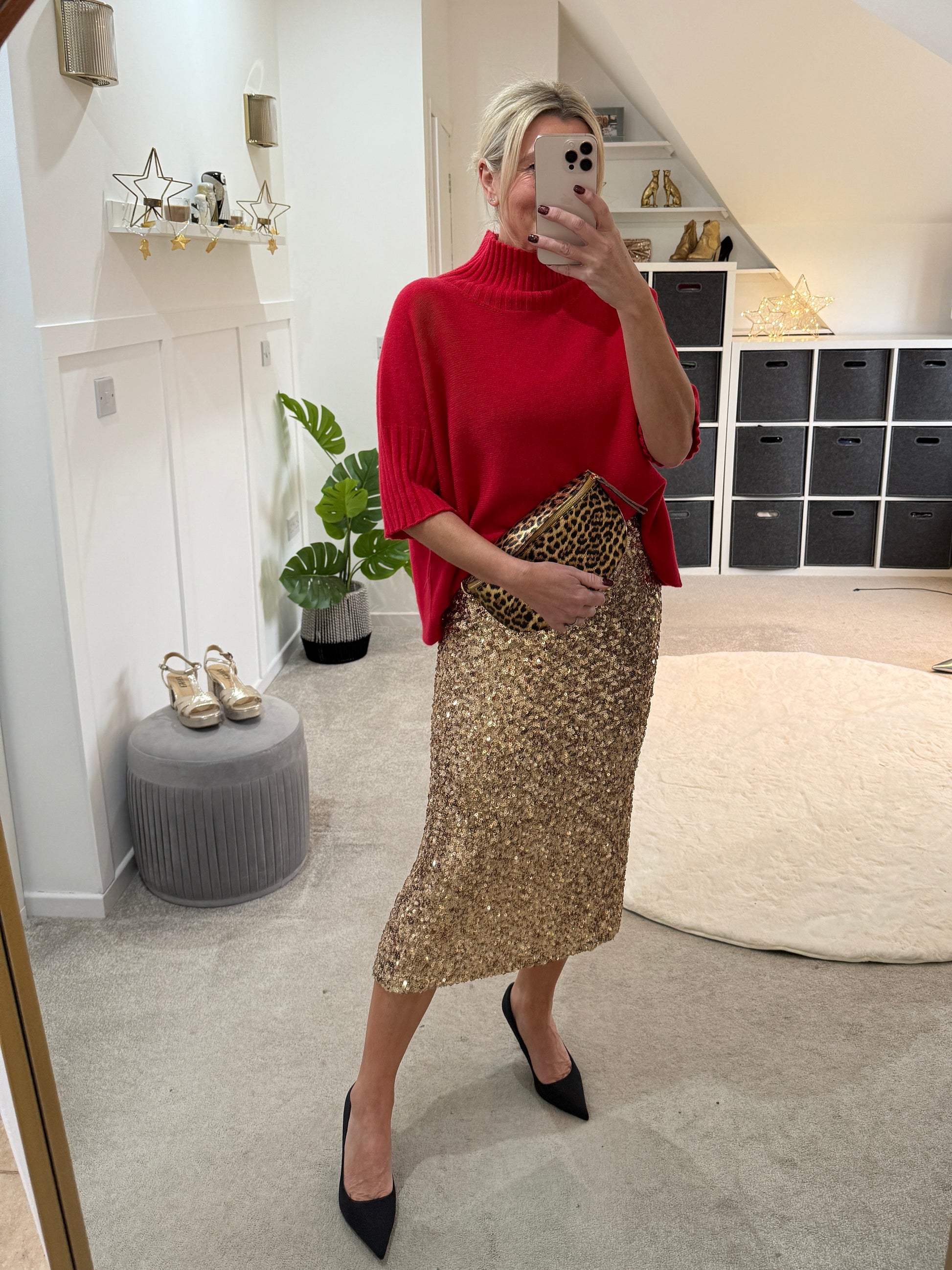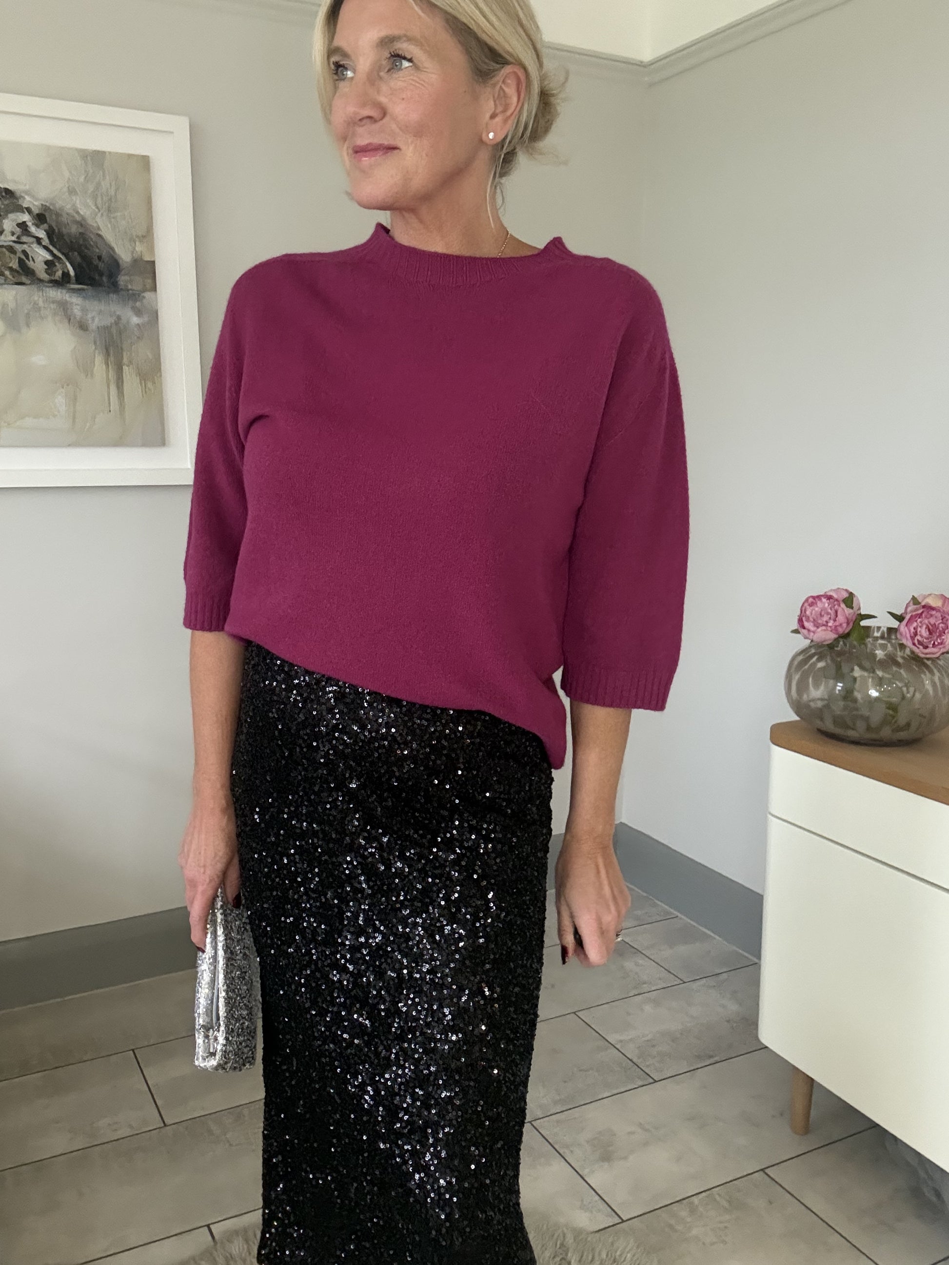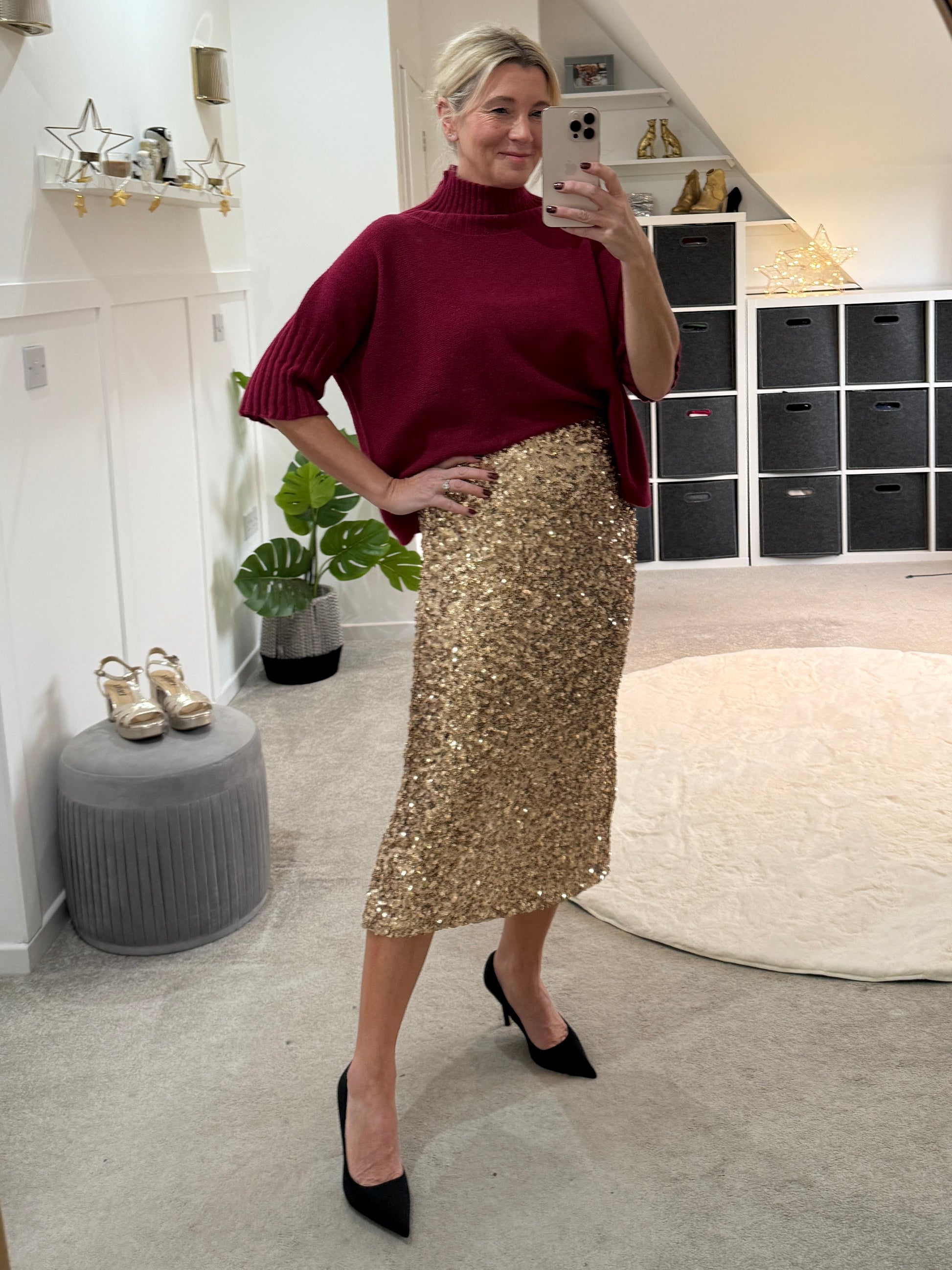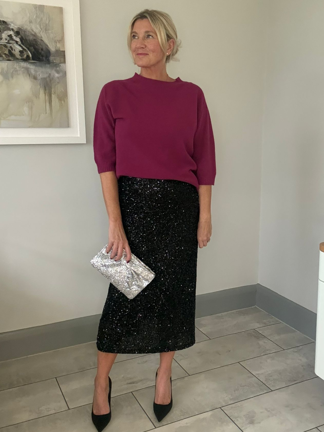 Stunning sequin pencil midi skirt with back split. Super quality and it's fully lined. Wear with a sparkly knit for truly show stopping evening look. Or, team with T shirt or fine knit and heels for a more laid back party look.