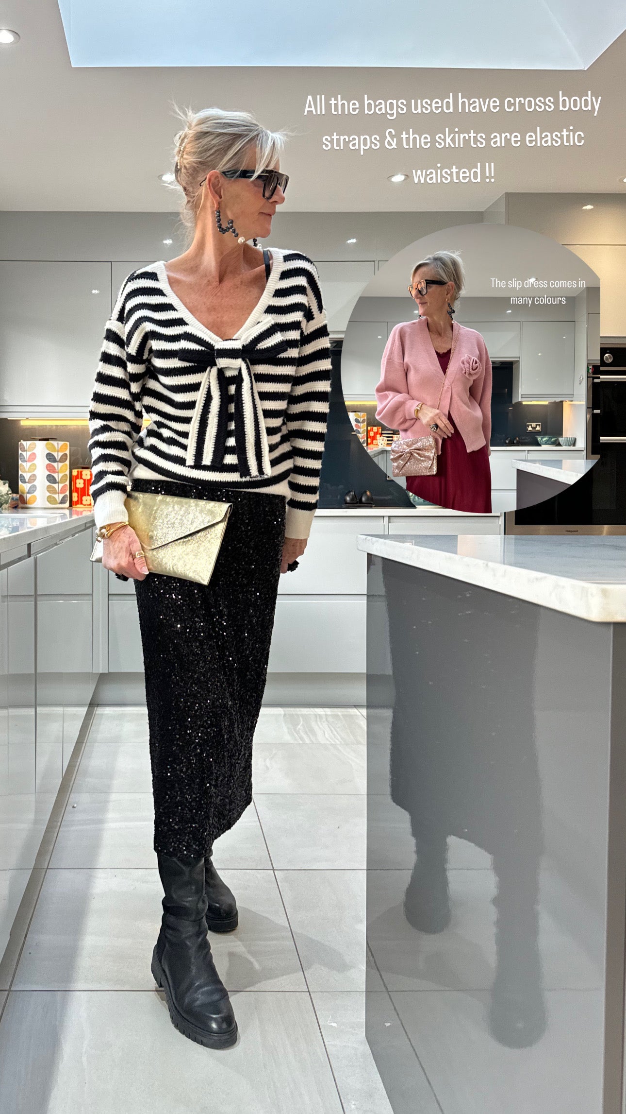 The cross body bag, or clutch bag, comes with a detachable chain long strap, matching detachable wristlet and a envelope flap fastening and silver hard-wear.