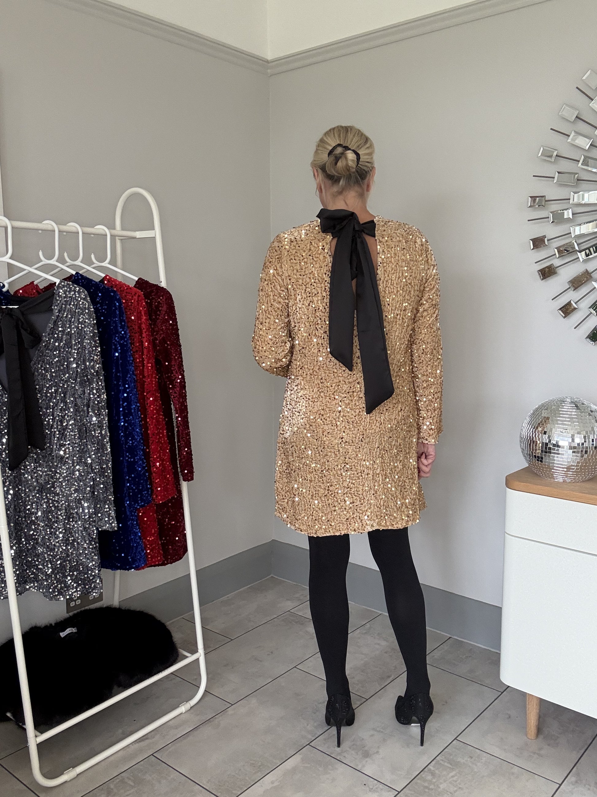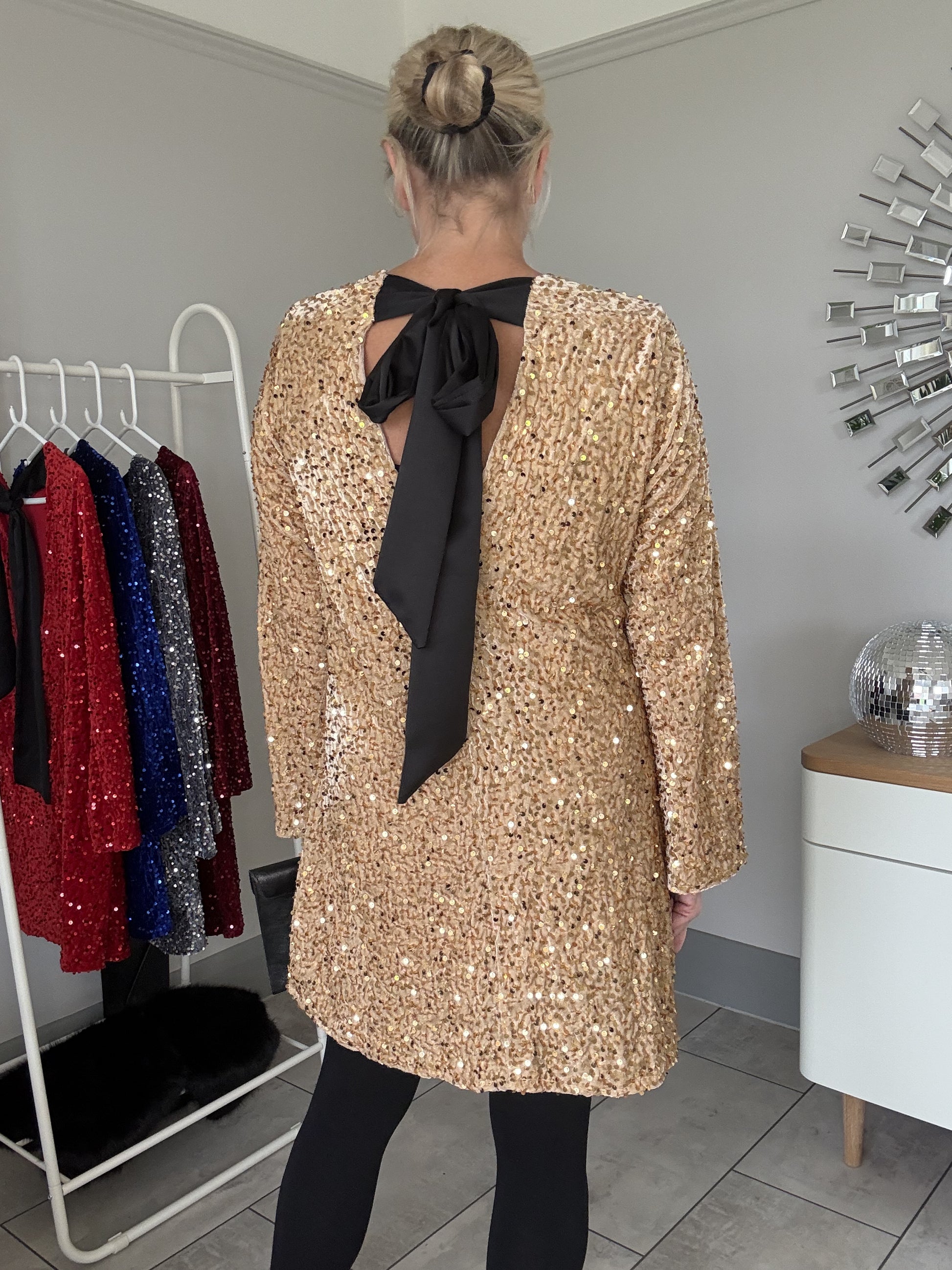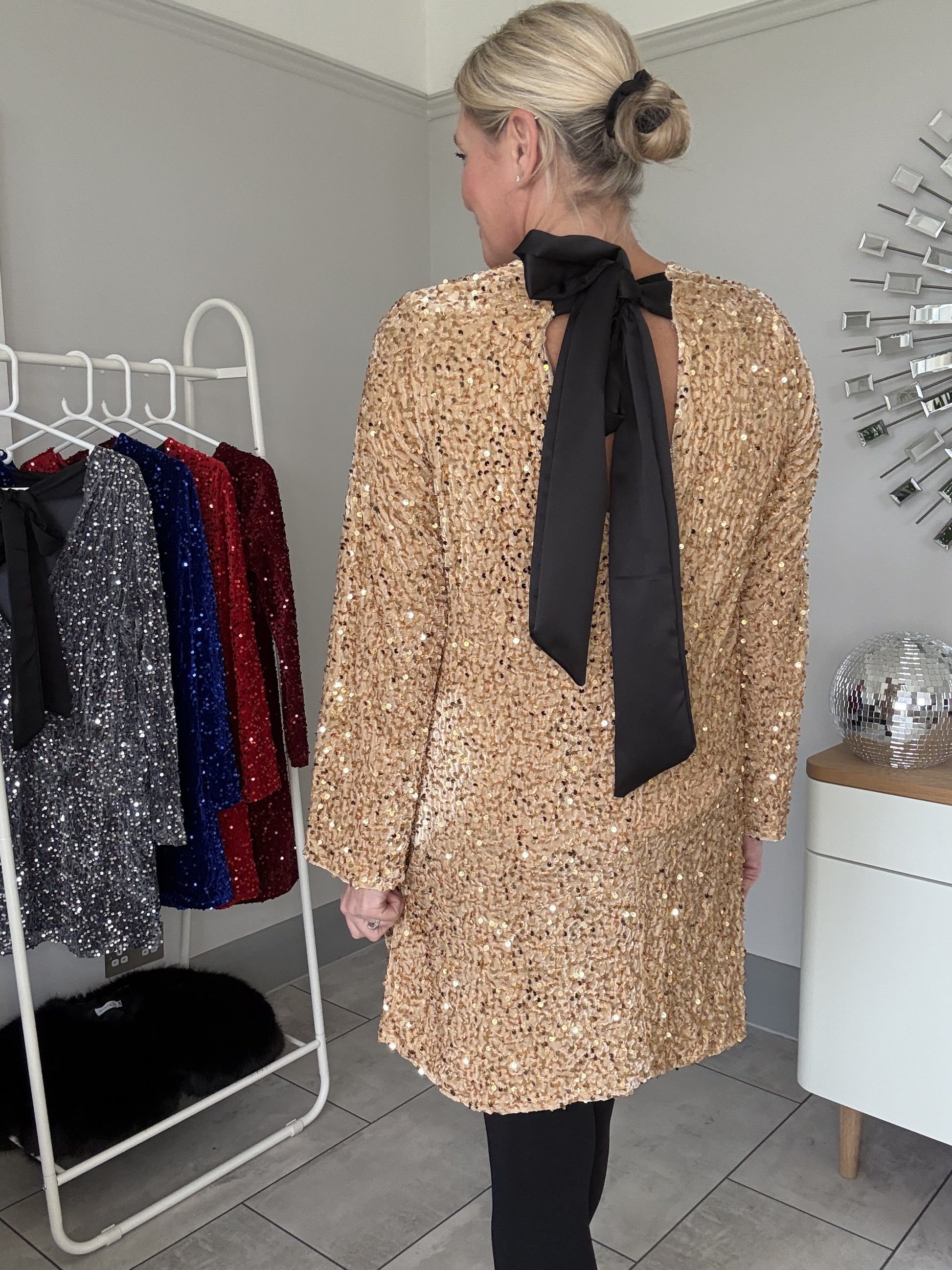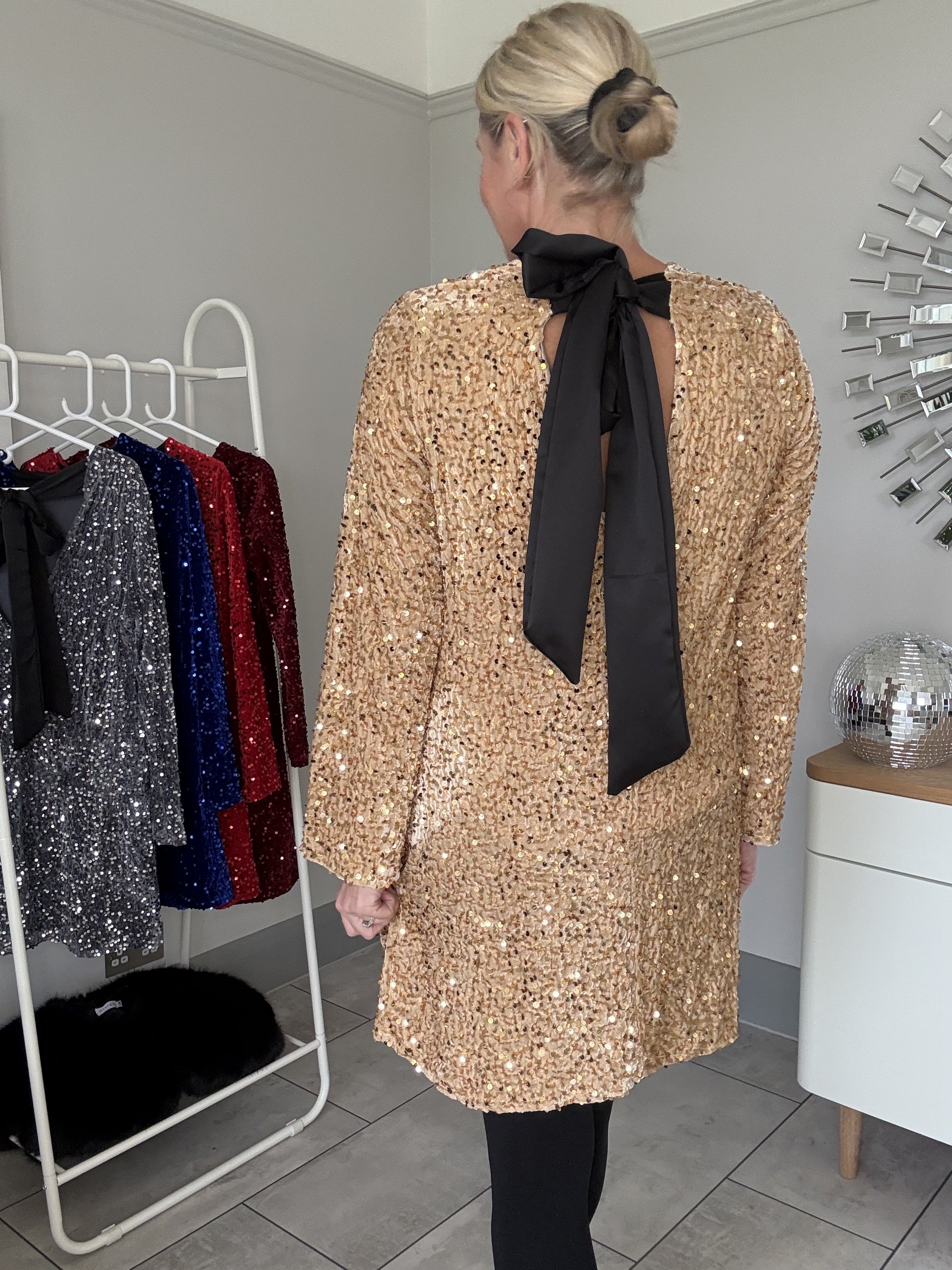 Beautiful flare sleeved velvet/sequin dress with very pretty black satin bow tie fastening at the back. It has a slight A-line shape and drapes and falls so nicely when on.