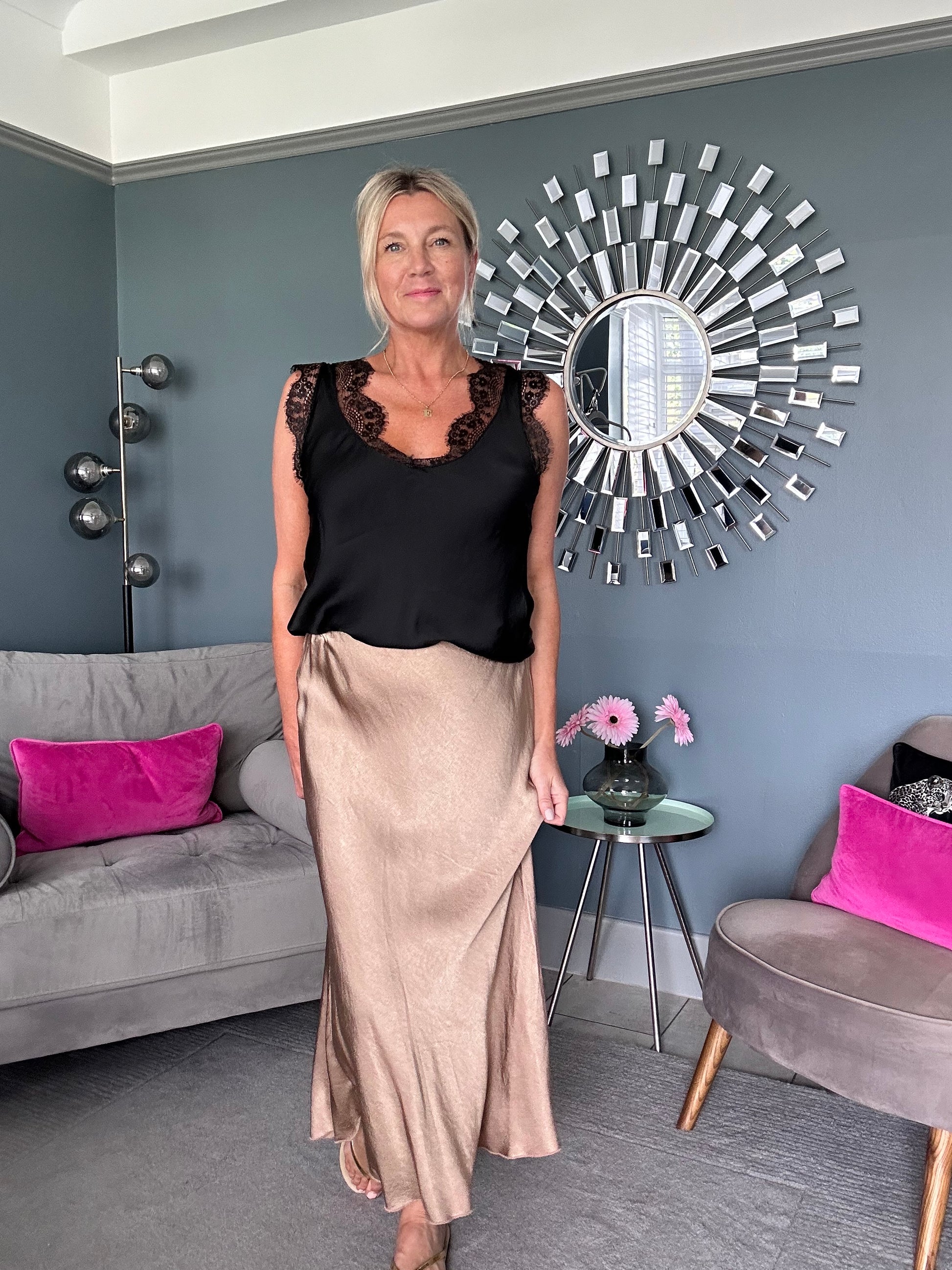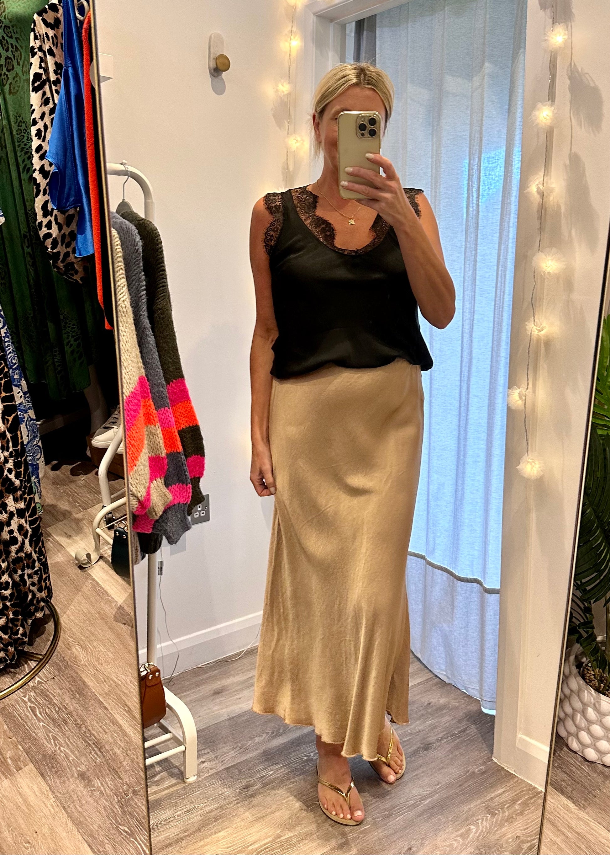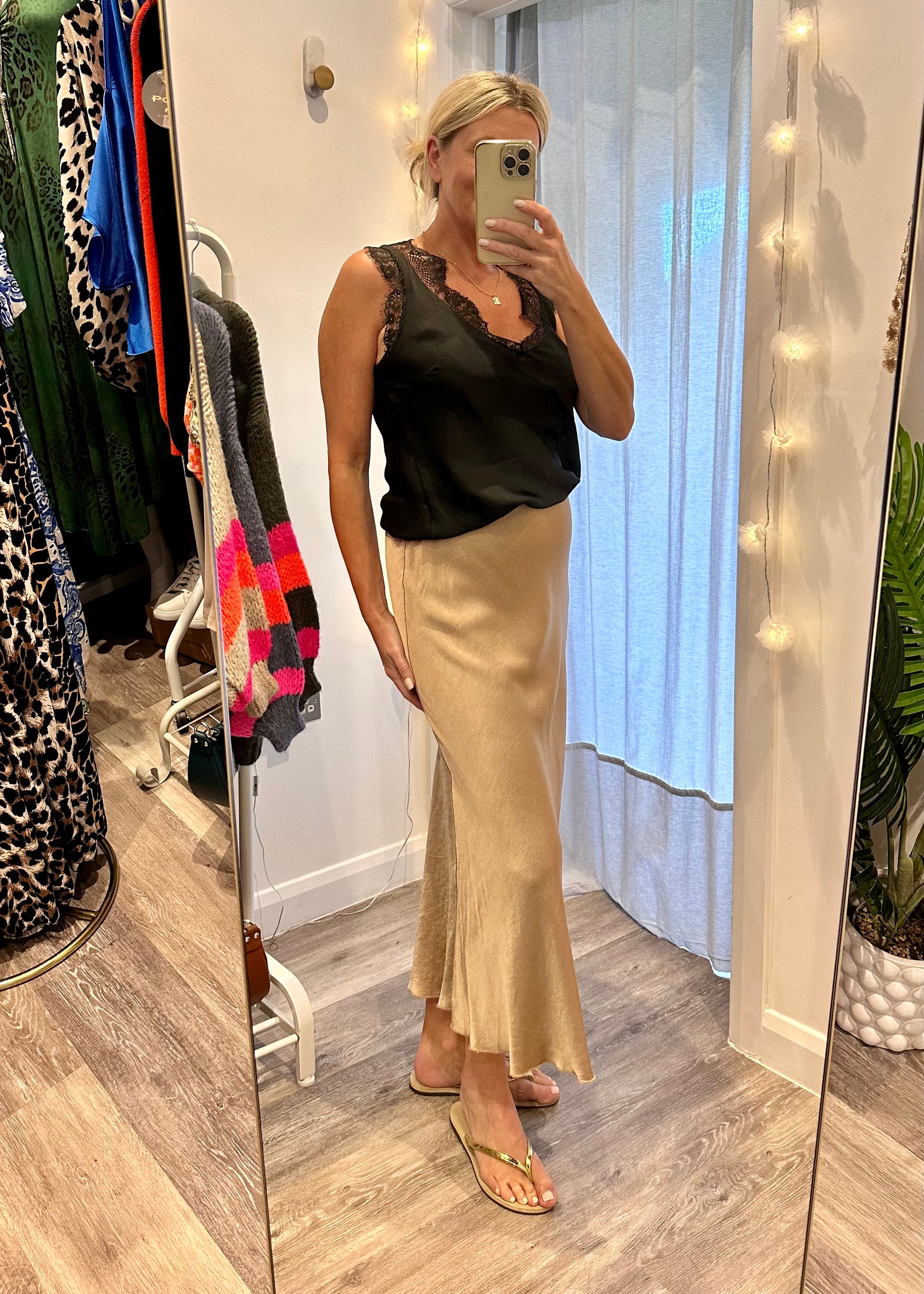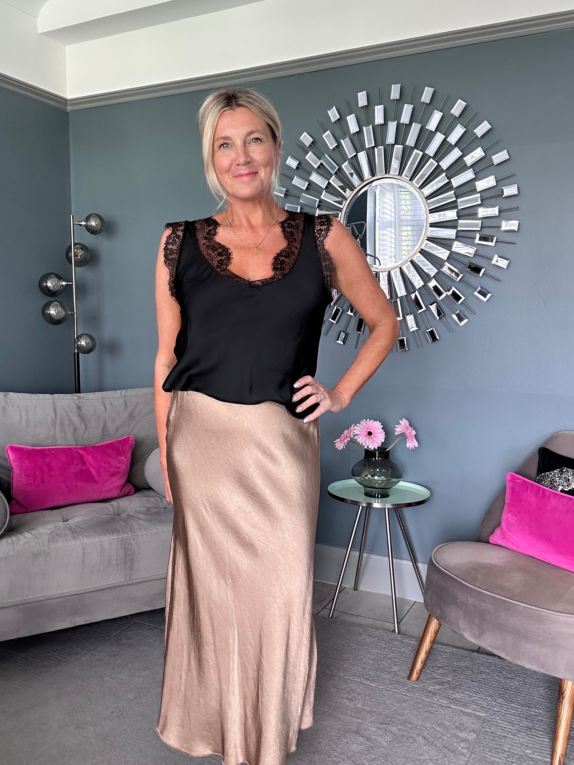 Beautiful satin slip skirt. With comfortable elasticated waist and gorgeous floaty curved hem. Team with heels and the silkie tops or wear casually with a knit and trainers. Perfect dressed up or down!