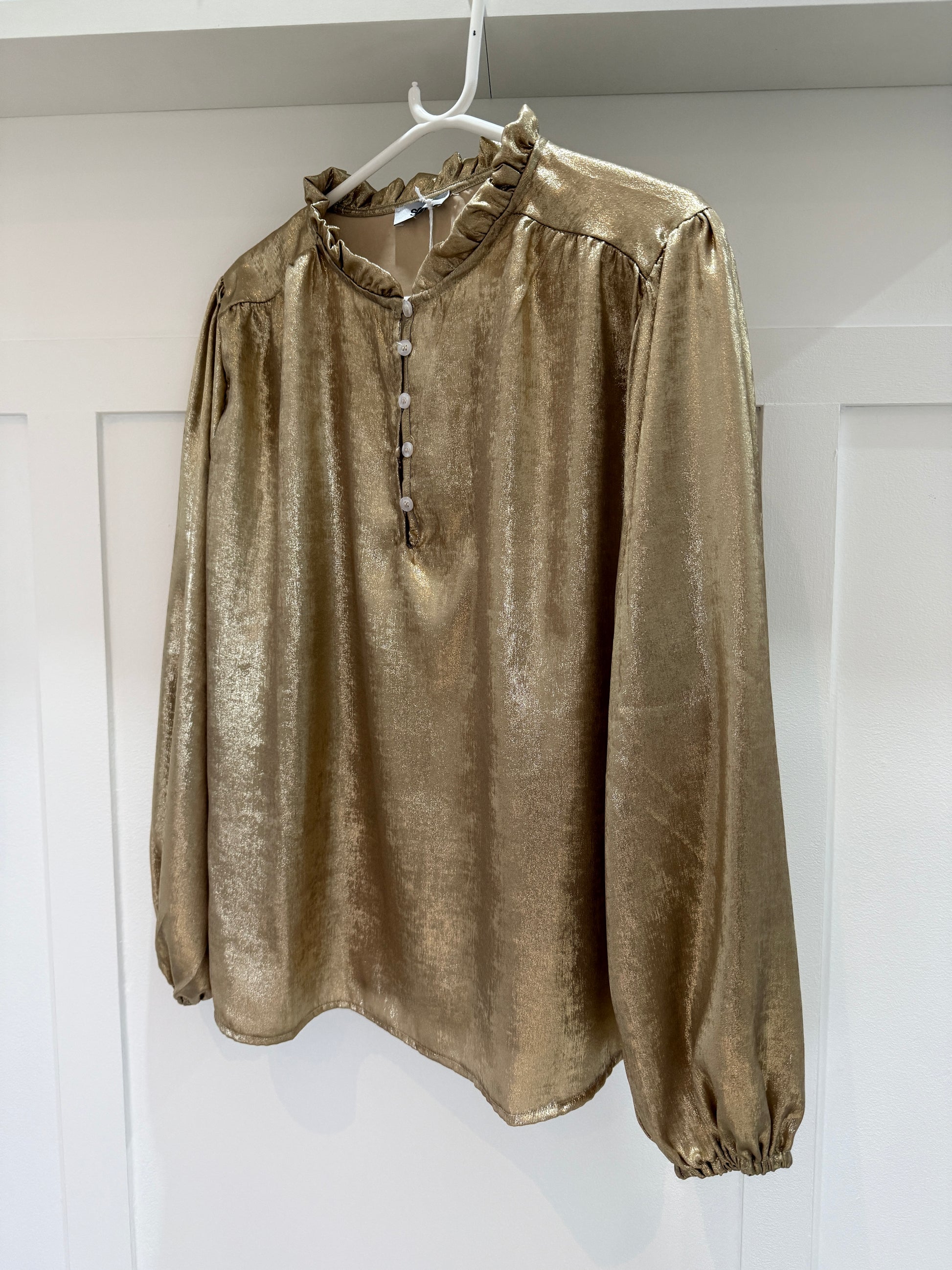 Meet your new go-to statement blouse, the stunning Metallic Ruffle Neck Blouse.
