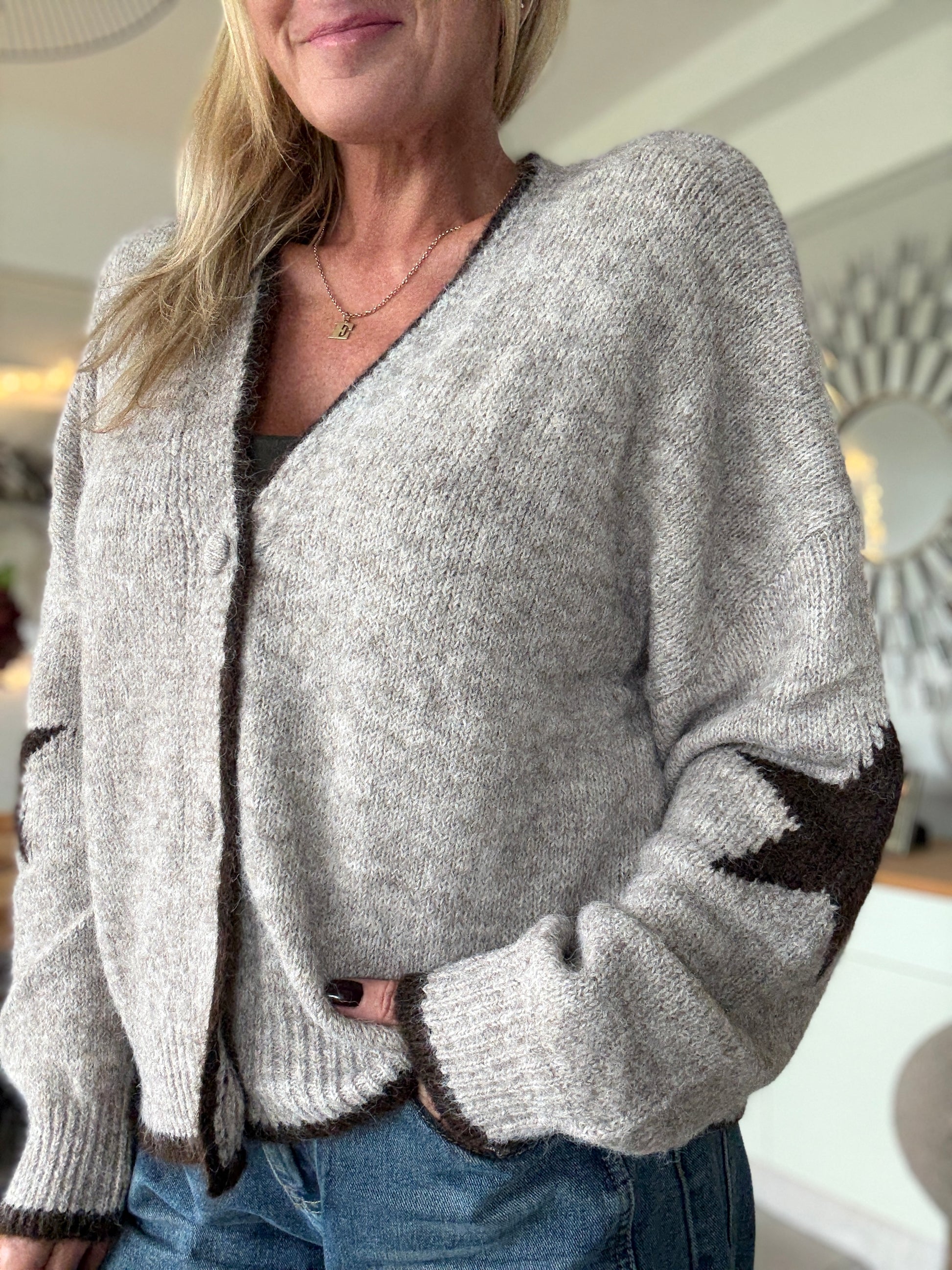 )Soft and cosy star knit cardigan, featuring bold star motifs on the back and elbows for a playful touch. With its relaxed fit and ultra-soft blend (including recycled fibres), it’s perfect for effortless everyday wear. Pair it with jeans or pleather trousers for an easy chic look that stands out.