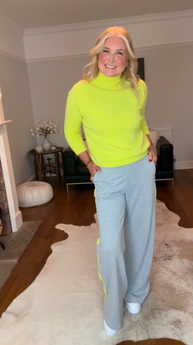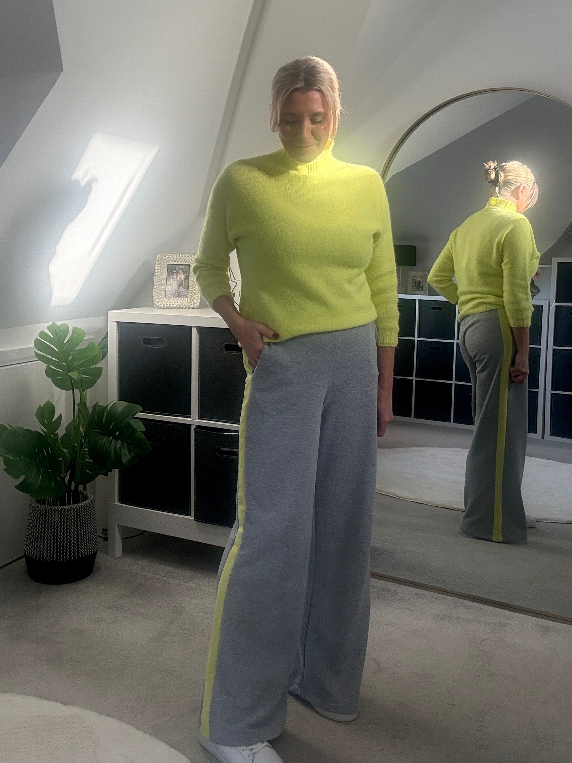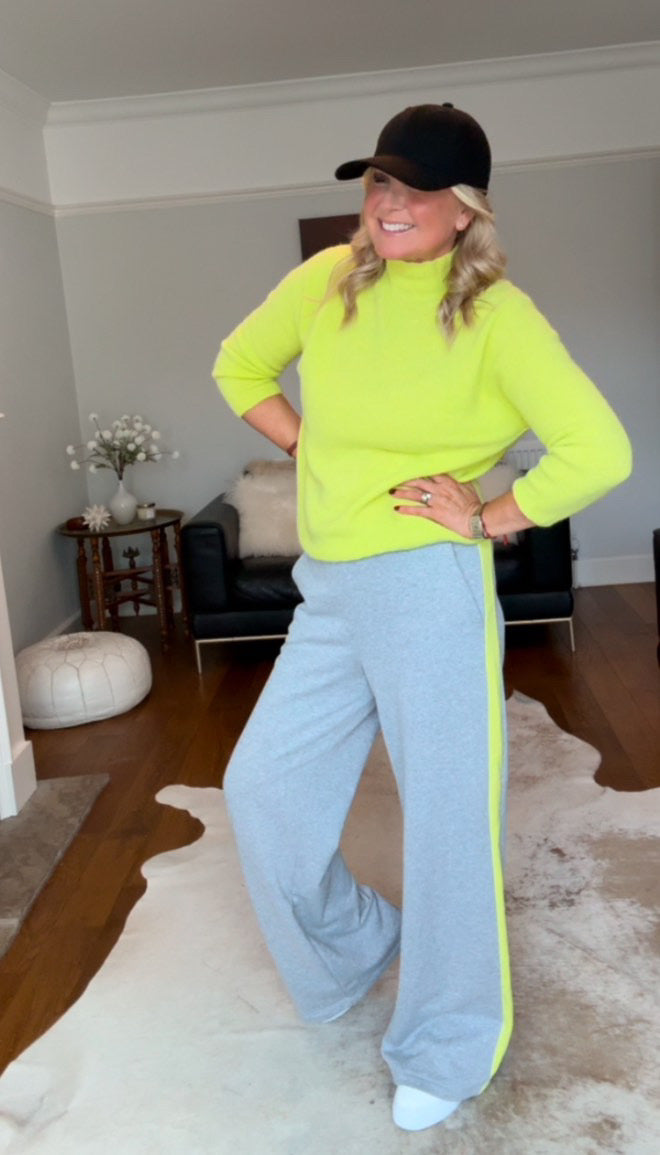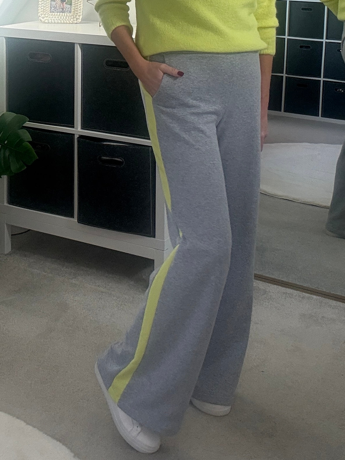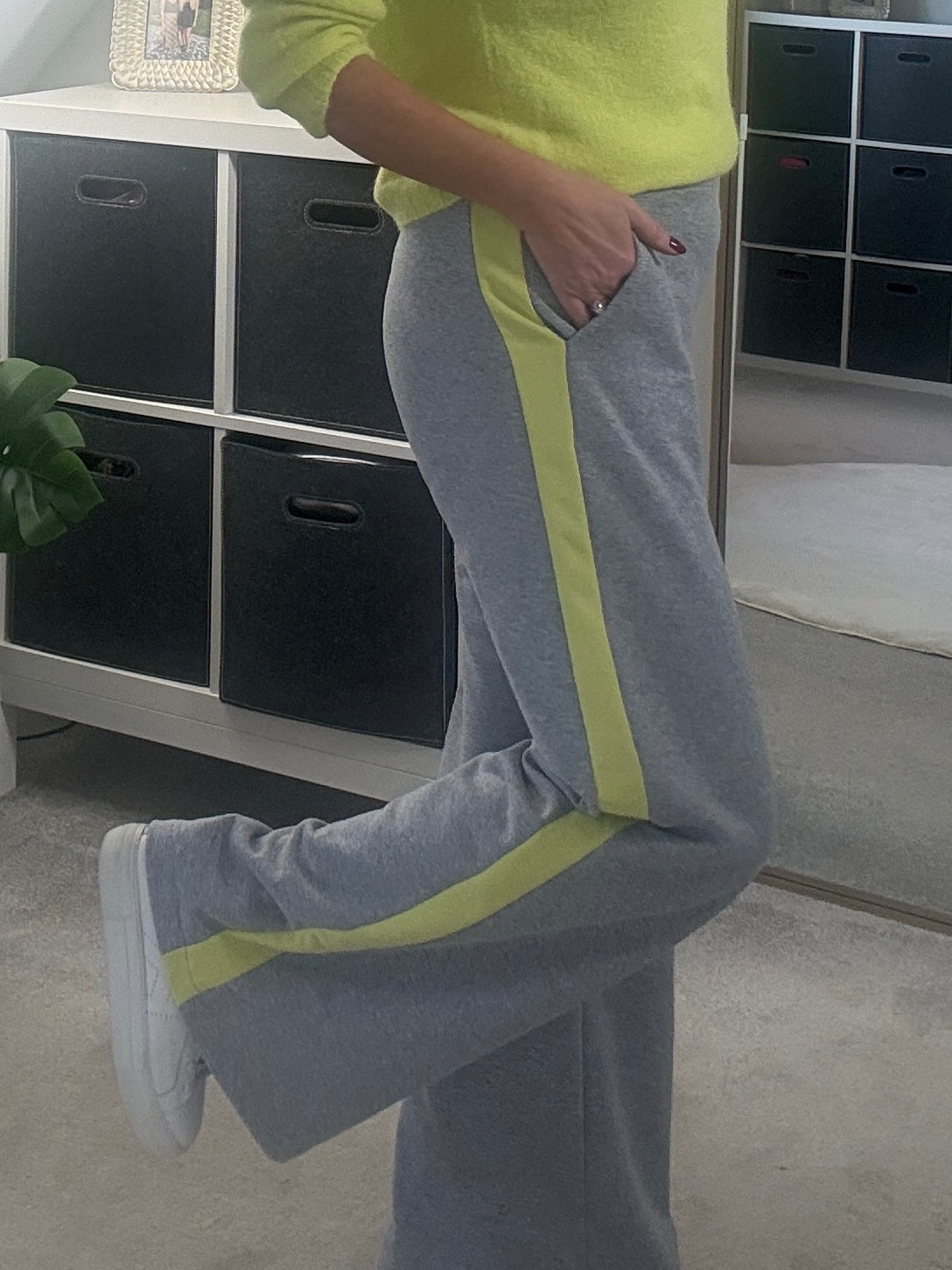 Super gorgeous and comfy wide leg jersey joggers in grey with contrasting lime stripe down the side. With comfortable elasticated pull on waist and side pockets. Style with matching jumper, biker jacket and trainers for a sports luxe look.