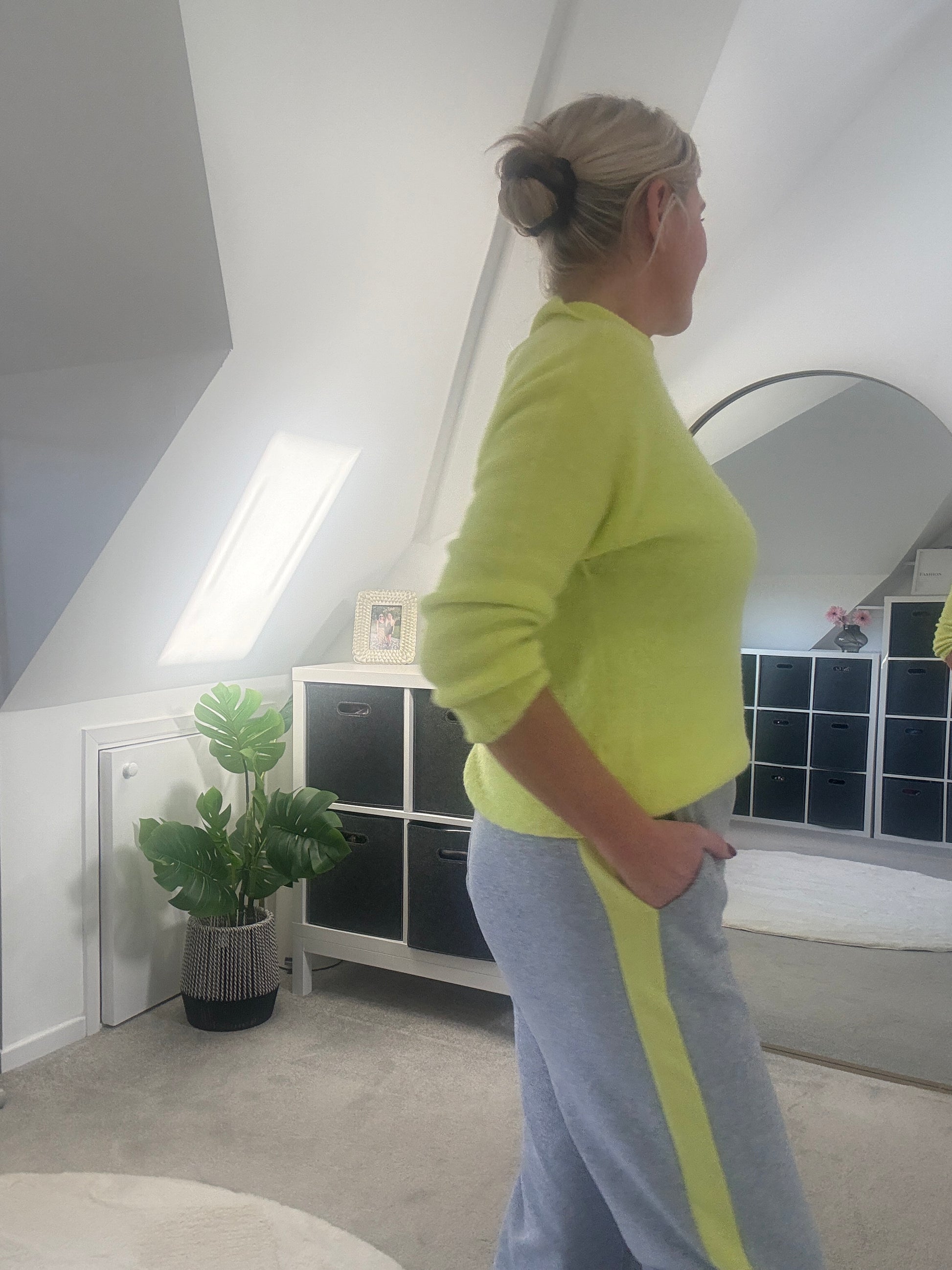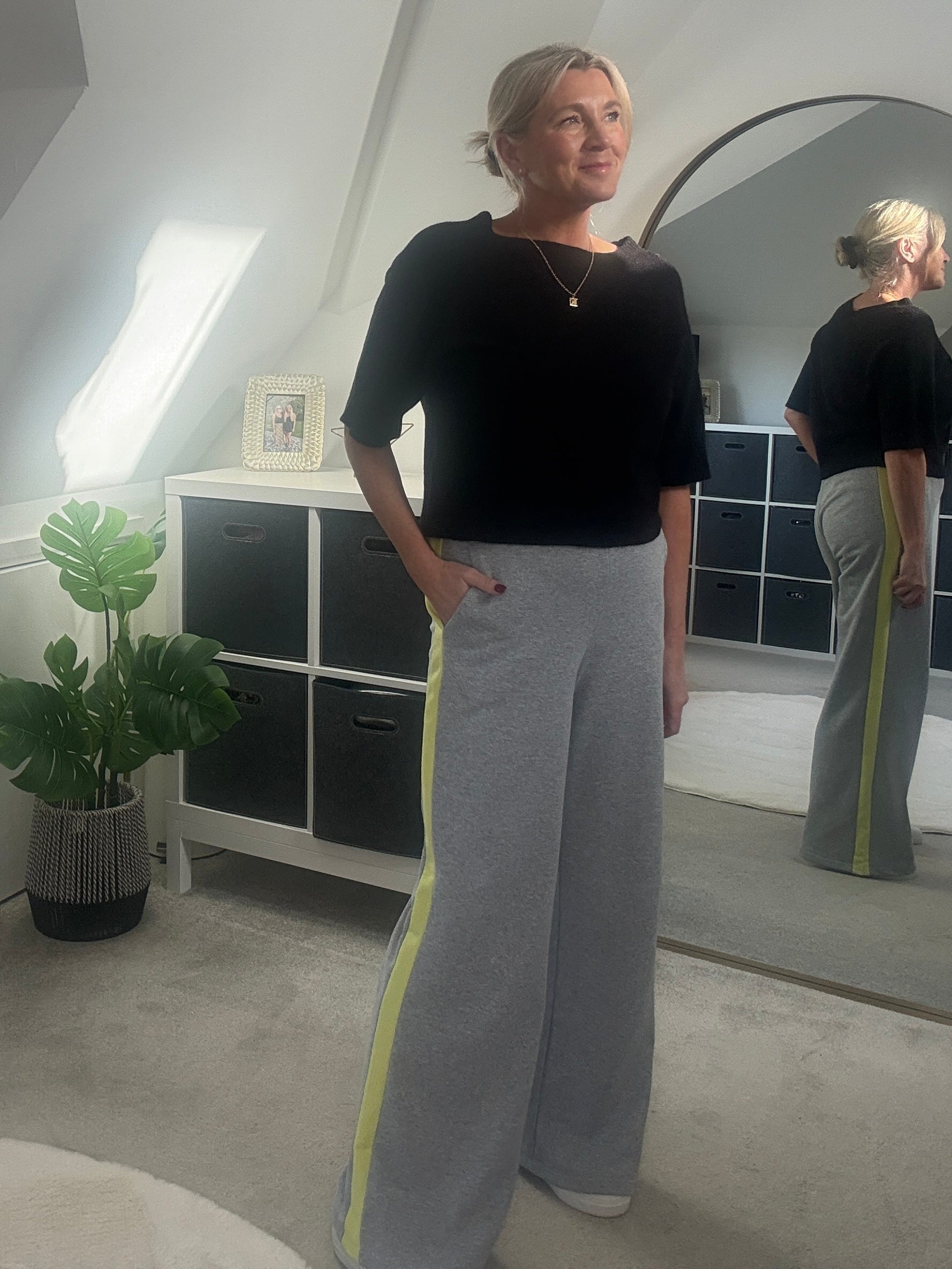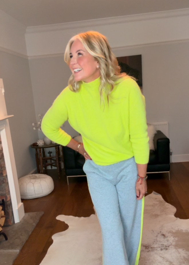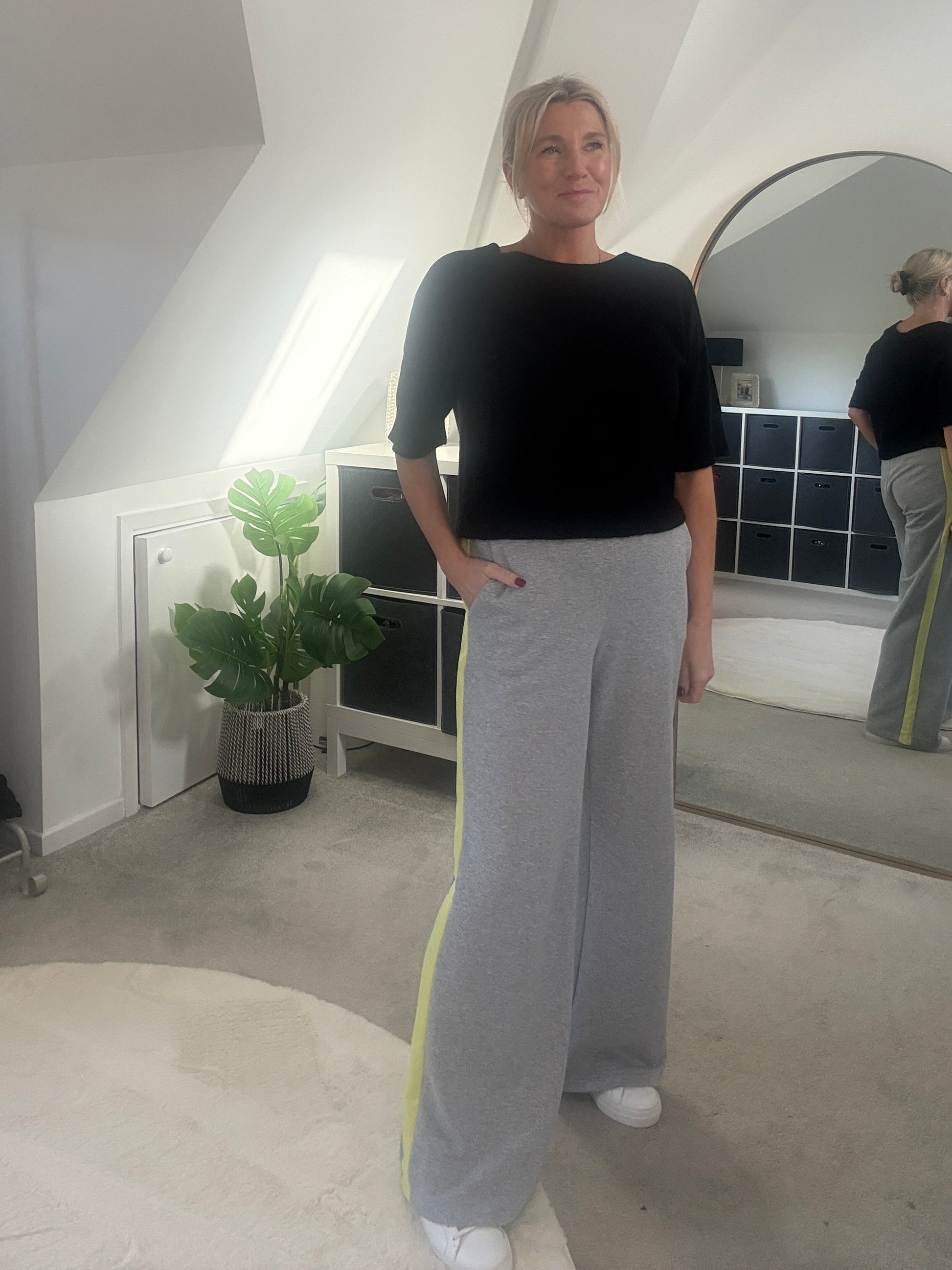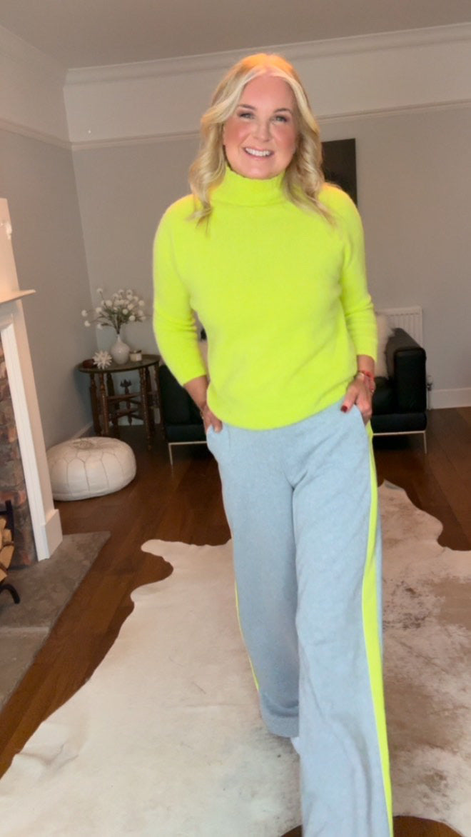 Super gorgeous and comfy wide leg jersey joggers in grey with contrasting lime stripe down the side. With comfortable elasticated pull on waist and side pockets. Style with matching jumper, biker jacket and trainers for a sports luxe look.