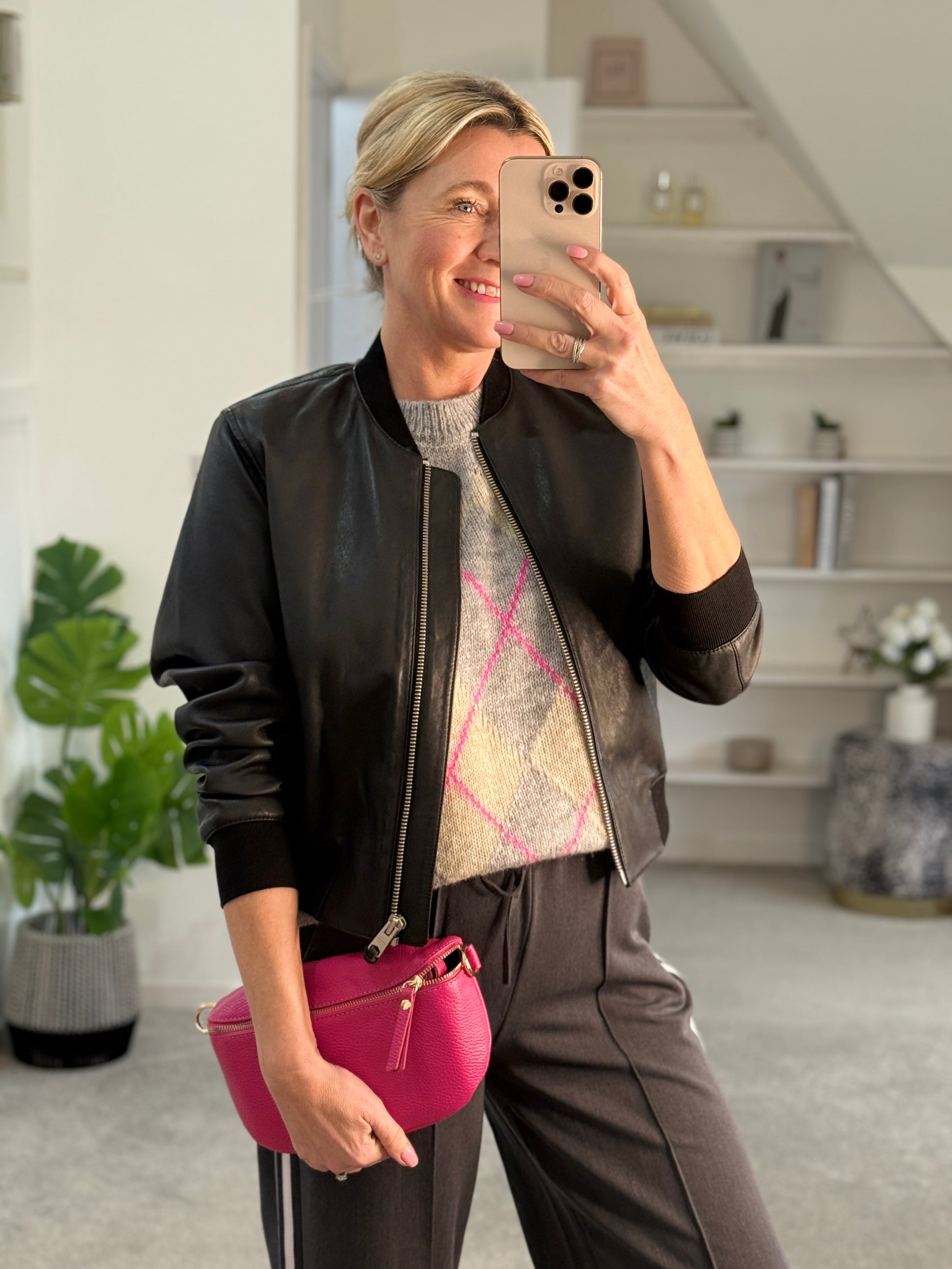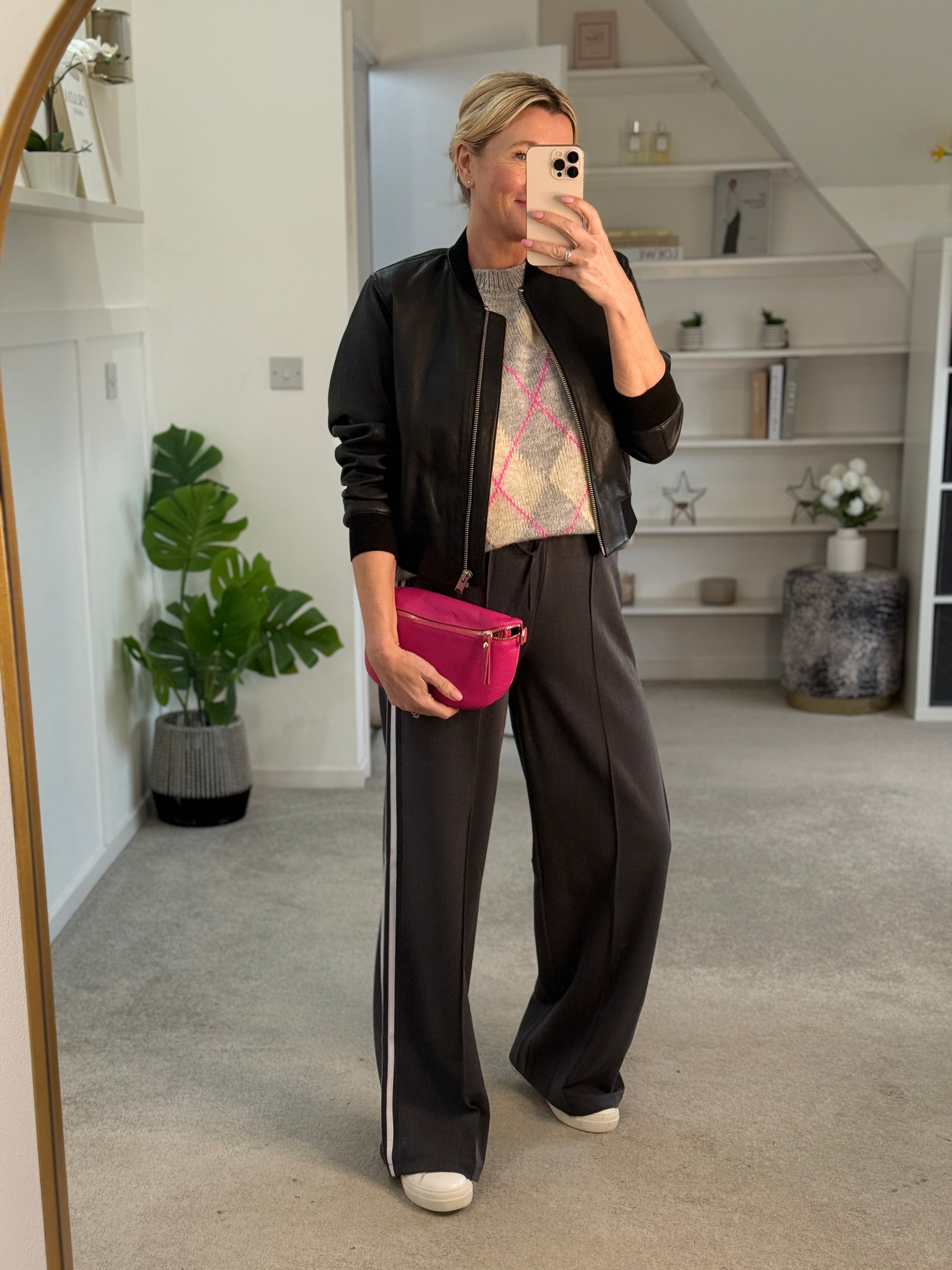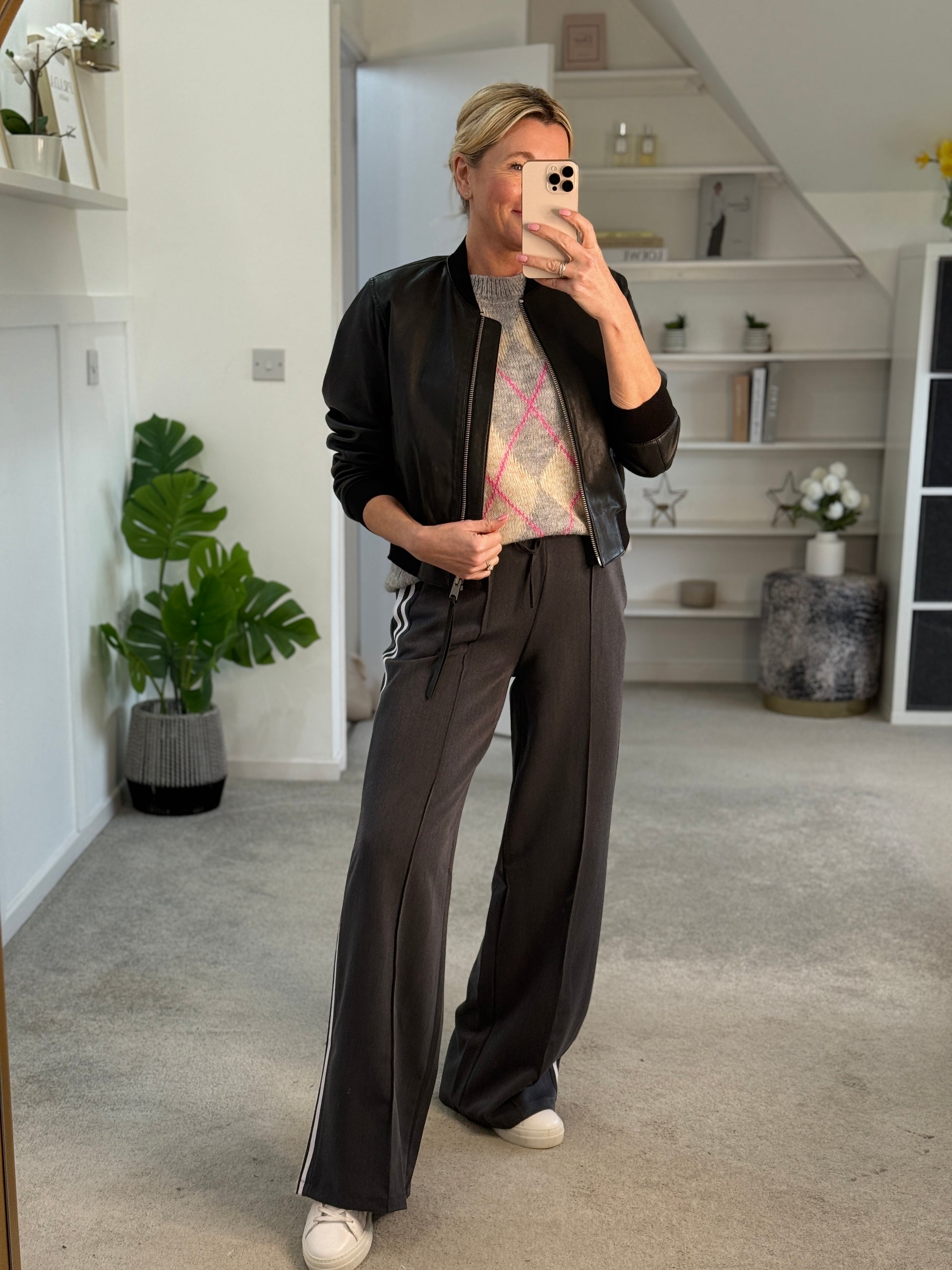 styled here with a basic white t shirt, grey twill stripe trousers and a leather bomber jacket.