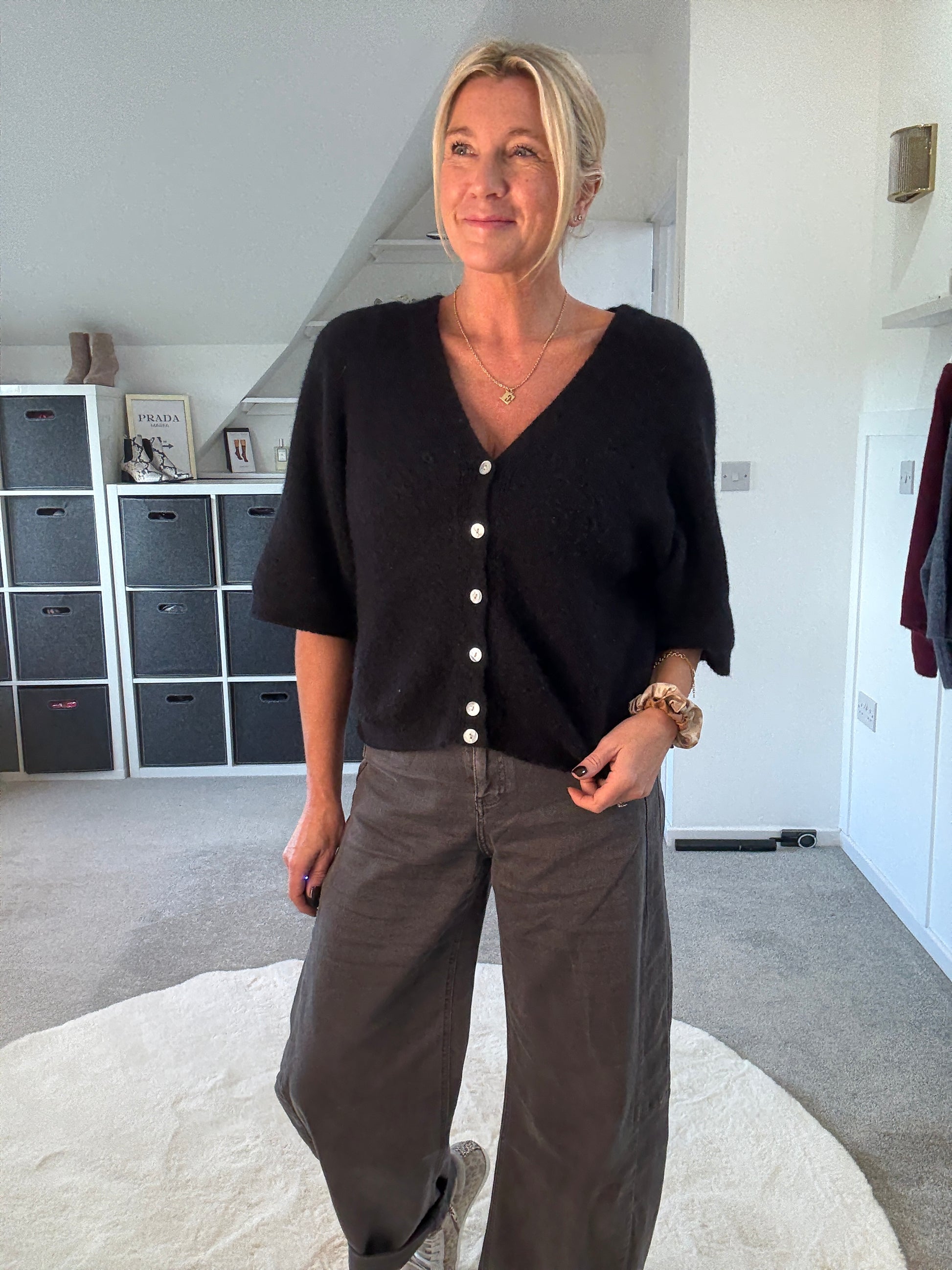 Soft and cosy alpaca mix half sleeve cardigan. Great for layering over the cashmere mix layering tops or on its own over a vest or t shirt. Also works well over a shirt or blouse.