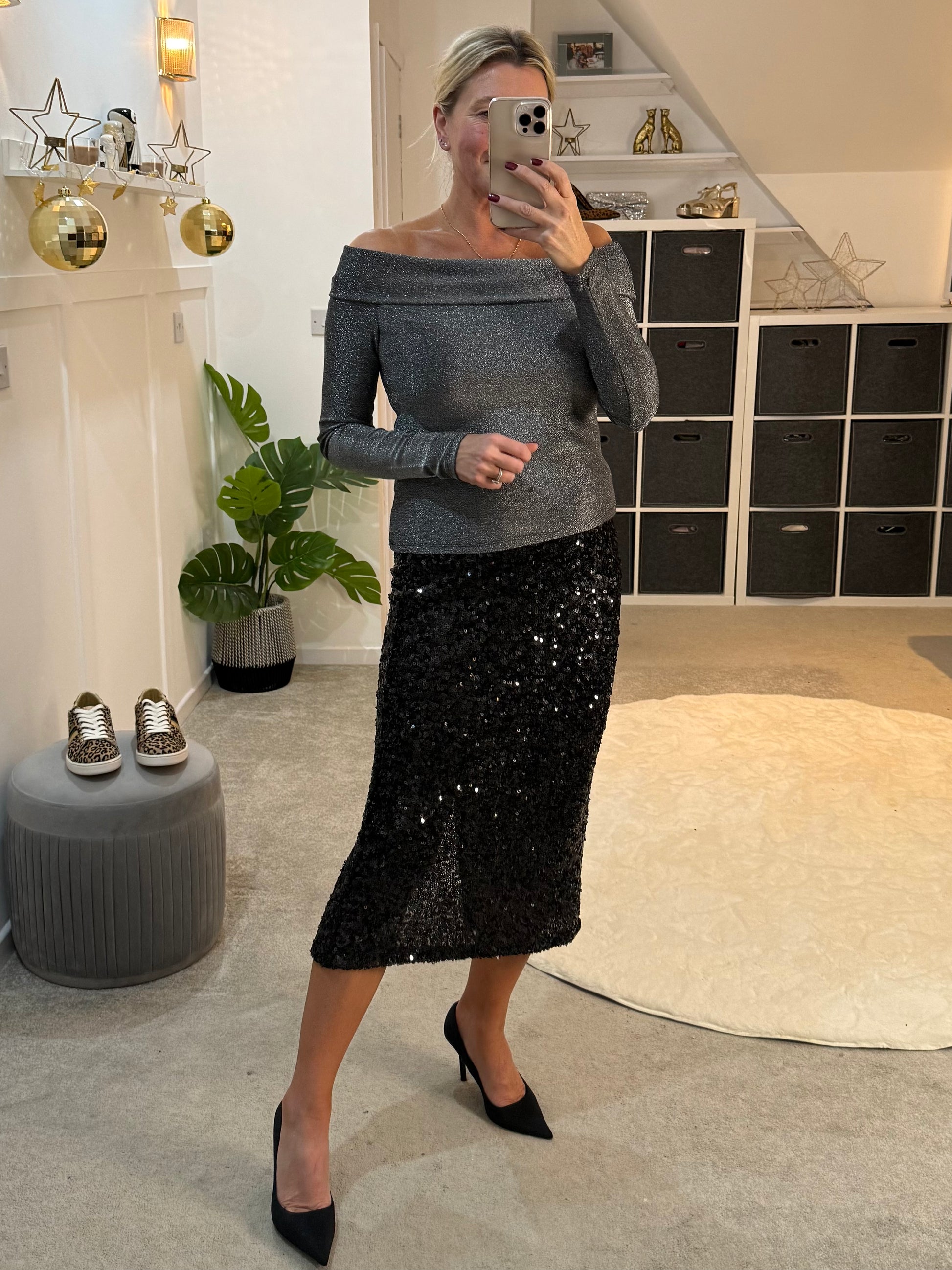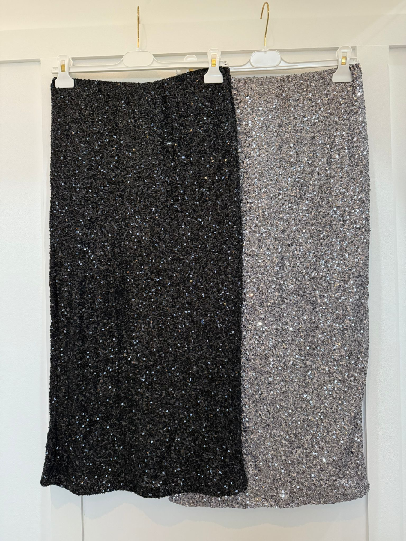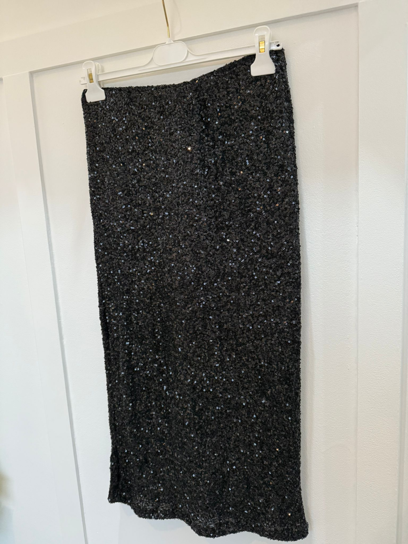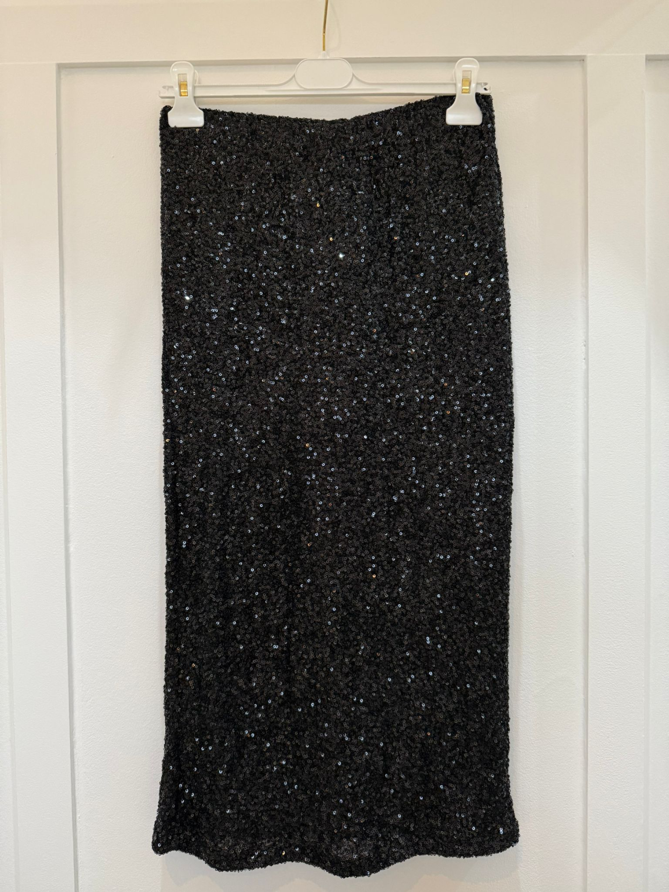 Stunning sequin pencil midi skirt with back split. Super quality and it's fully lined. Wear with a sparkly top for truly show stopping evening look. Or, team with T shirt or fine knit and heels for a more laid back party look.