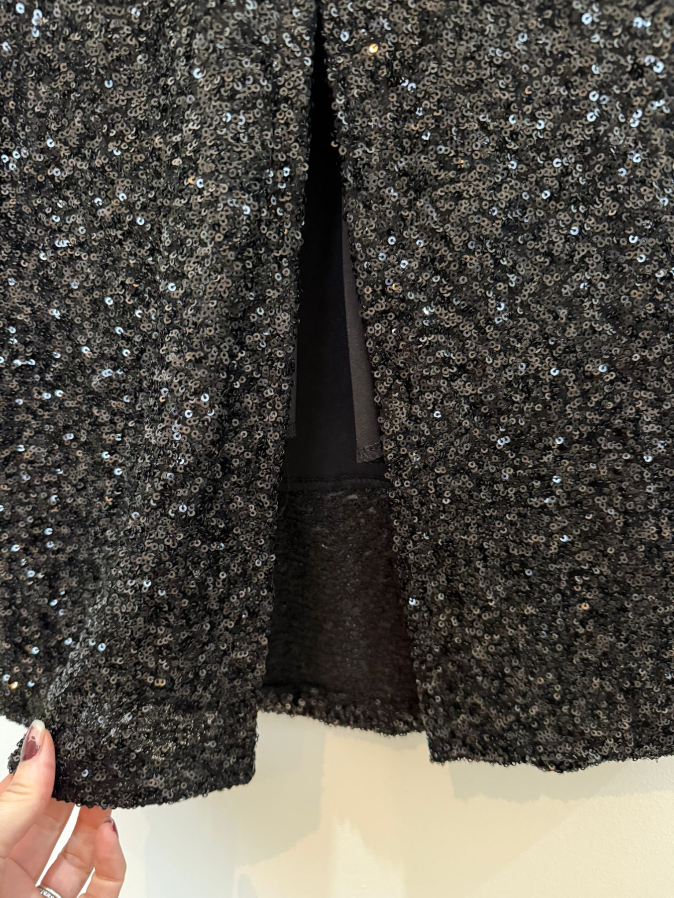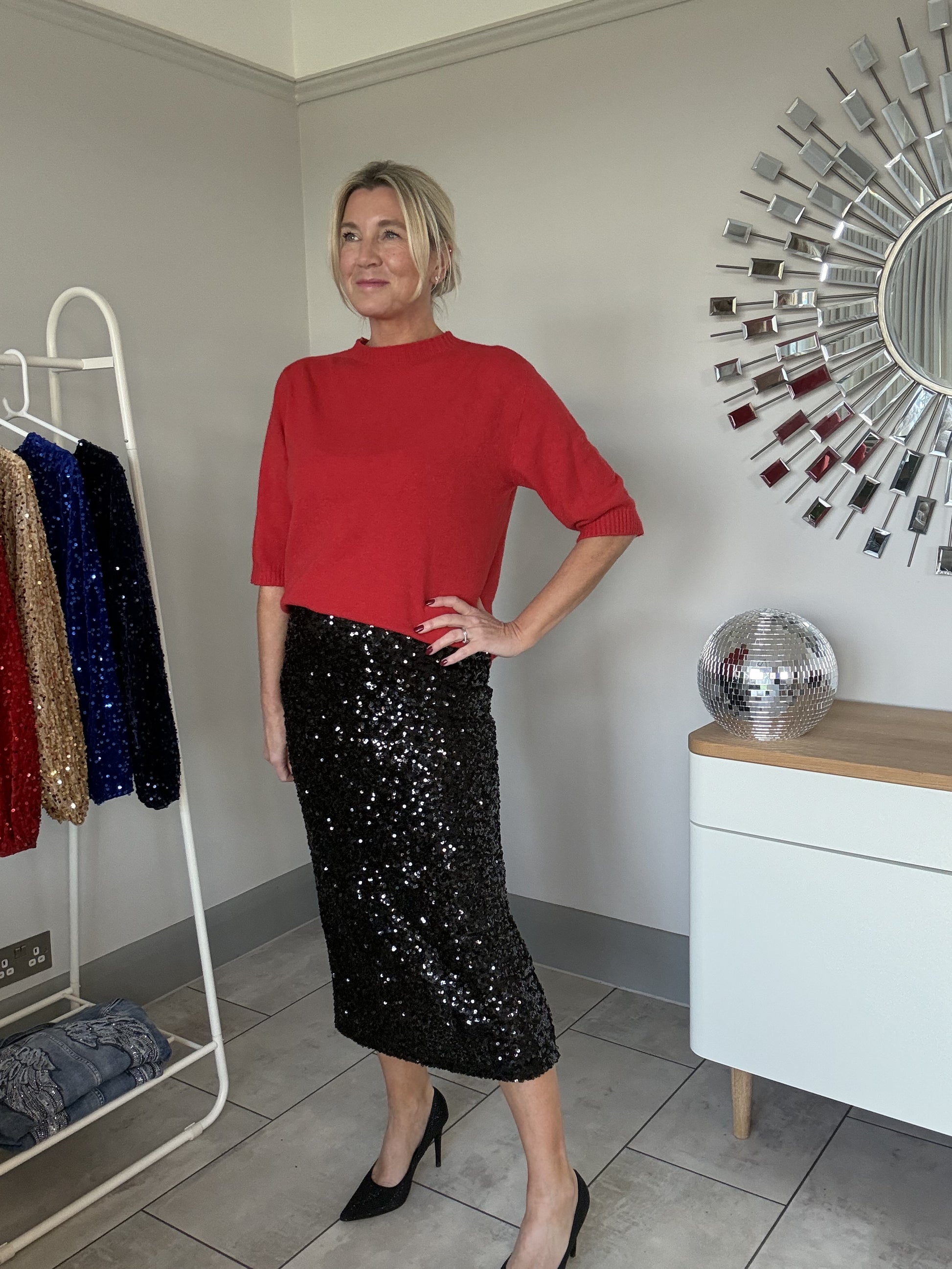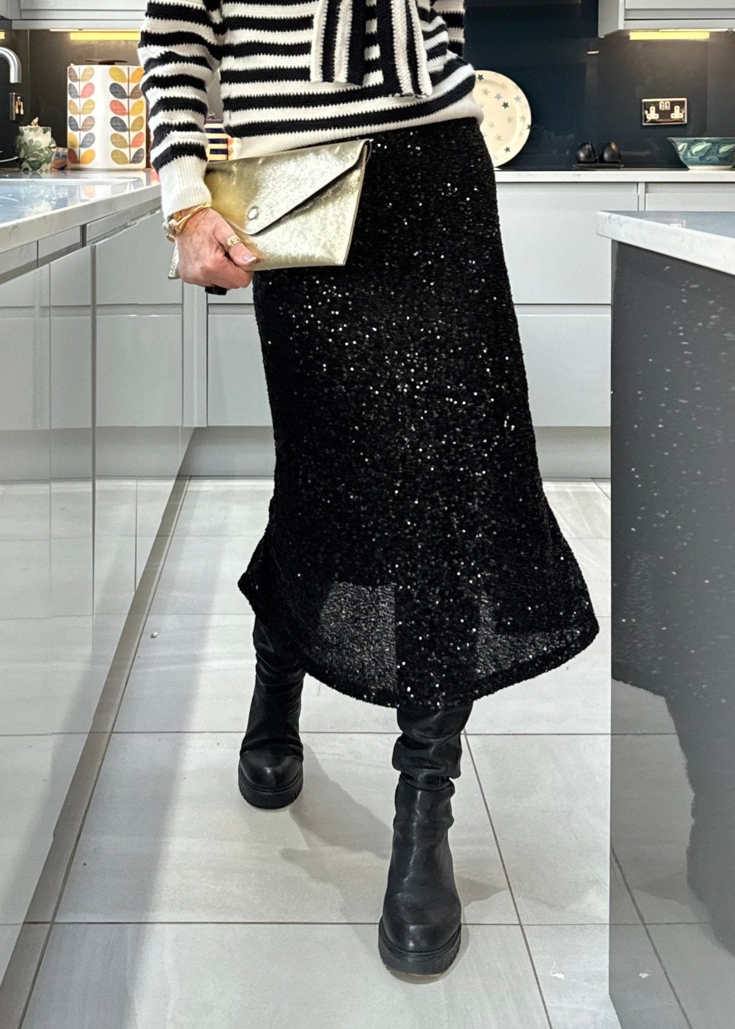 Stunning sequin pencil midi skirt with back split. Super quality and it's fully lined. Wear with a sparkly top for truly show stopping evening look. Or, team with T shirt or fine knit and heels for a more laid back party look.