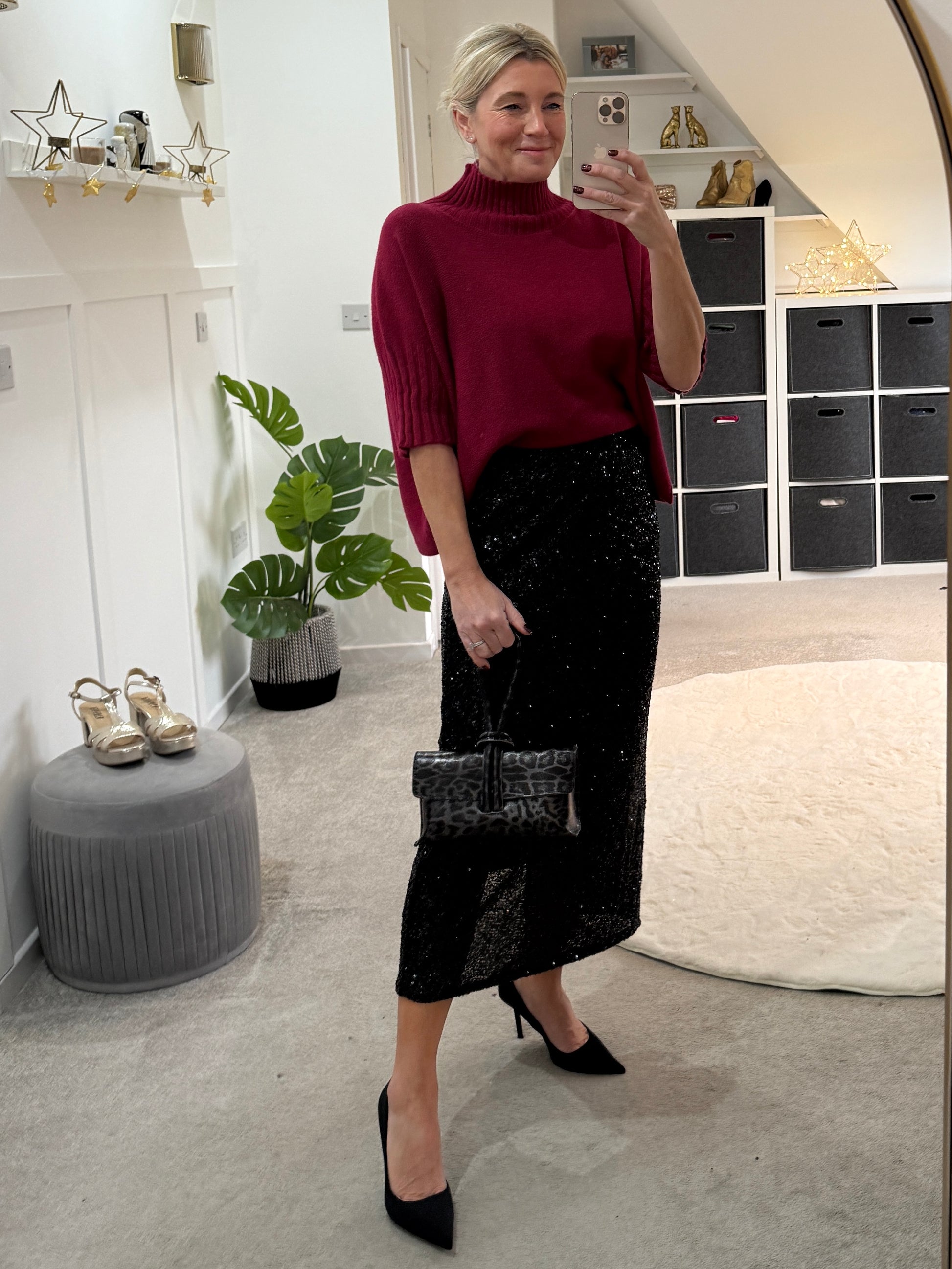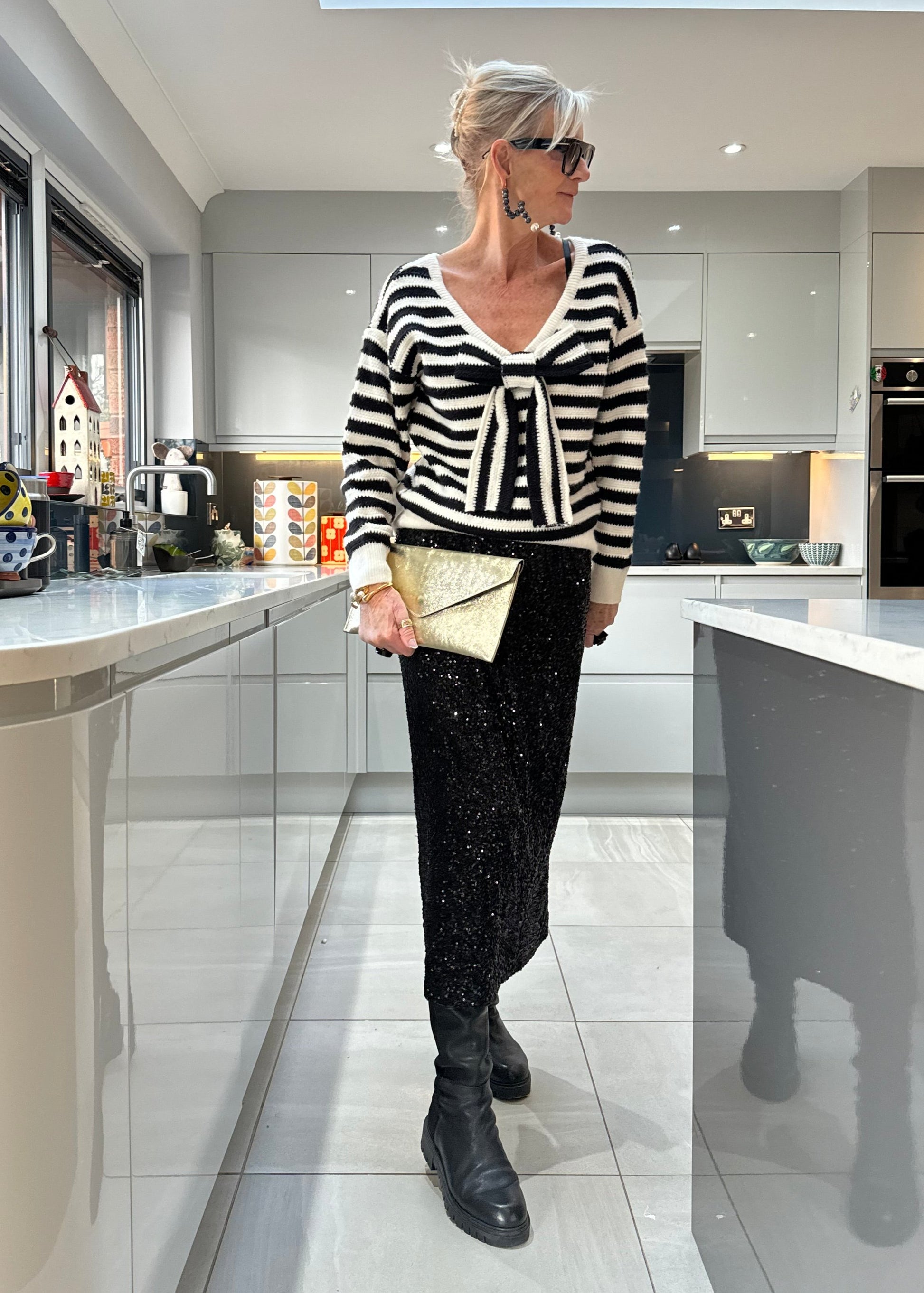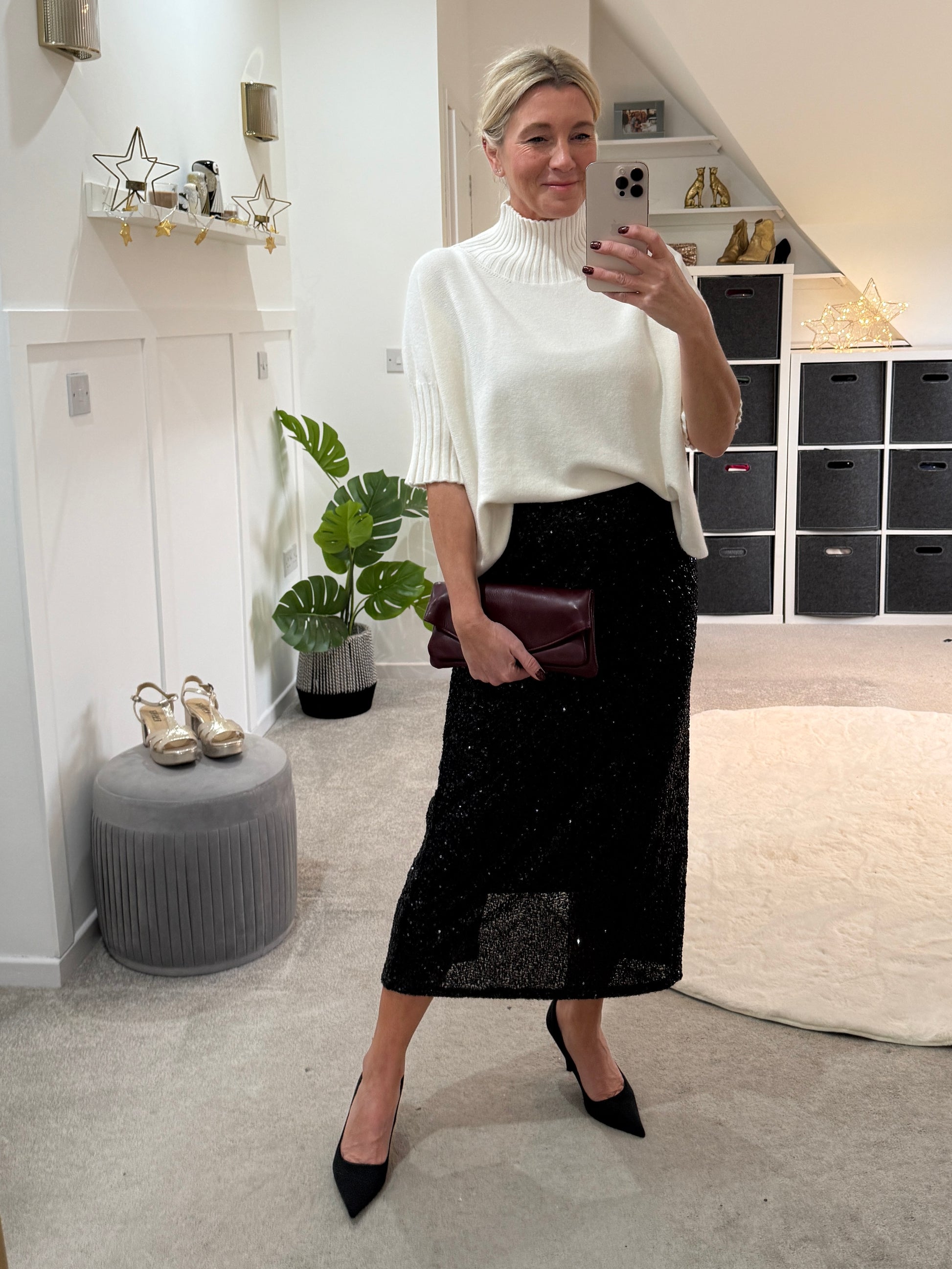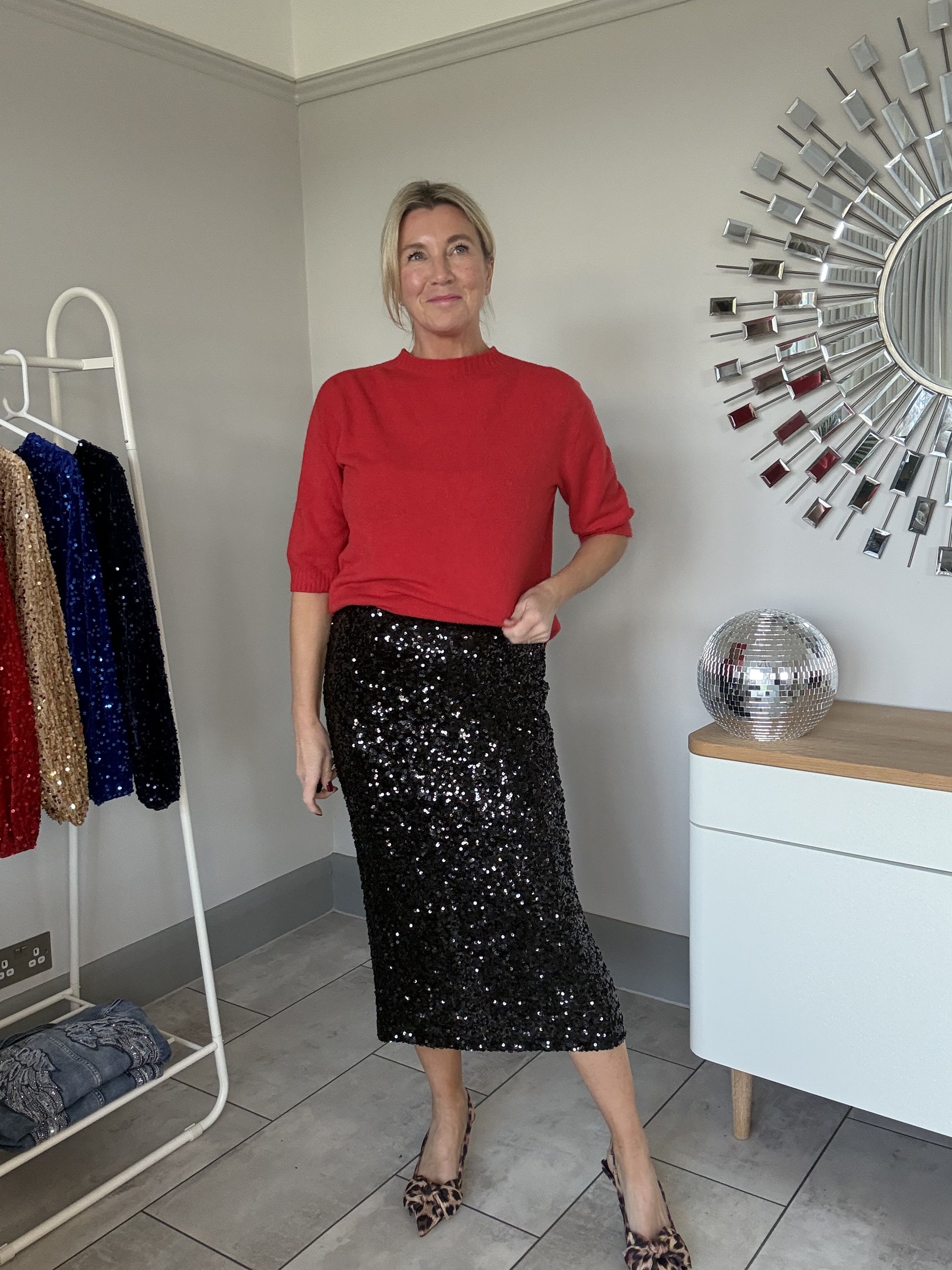 Stunning sequin pencil midi skirt with back split. Super quality and it's fully lined. Wear with a sparkly top for truly show stopping evening look. Or, team with T shirt or fine knit and heels for a more laid back party look.