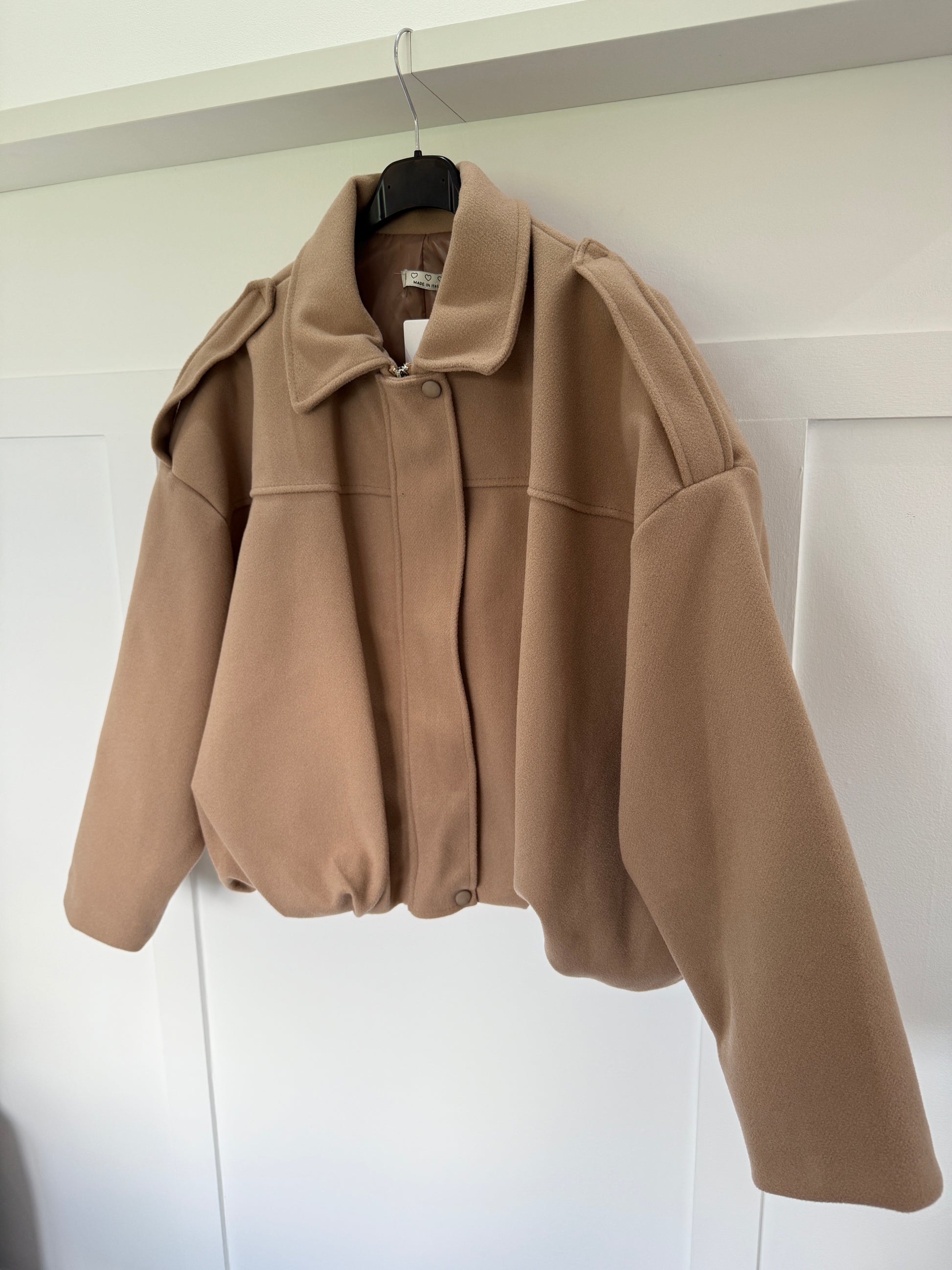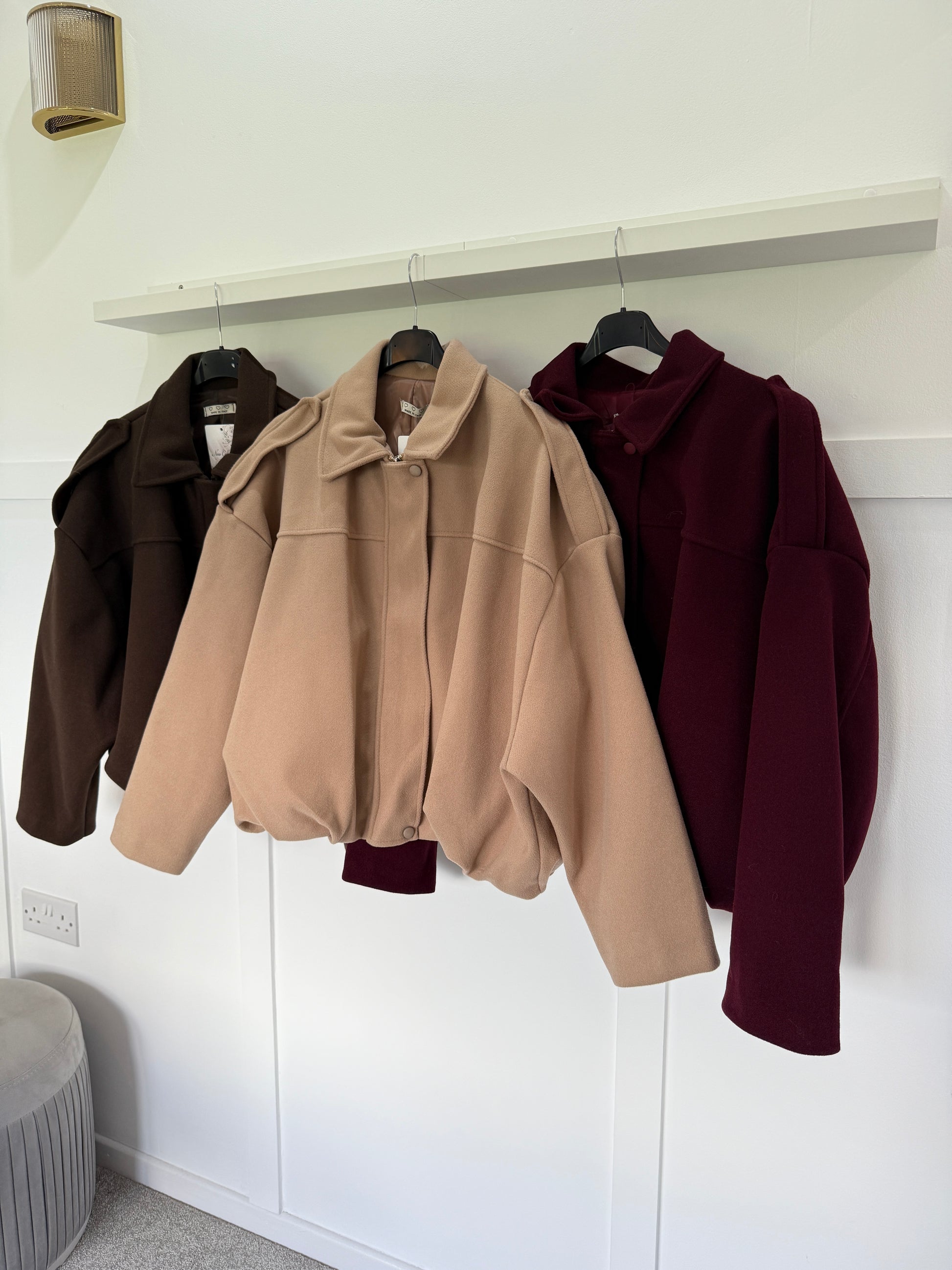 On trend bomber style jacket in a felt texture fabric. Fully lined with zip fastening, popper, collar and epaulettes...A one size oversized fit with bubble hem and available in chocolate, burgundy and light camel...Easy to wear jacket to pop on with jeans...This is so lovely!