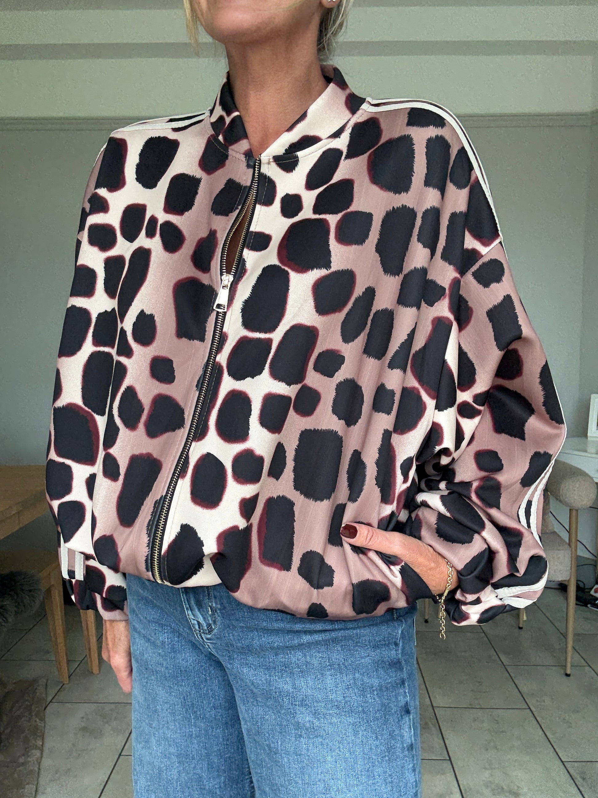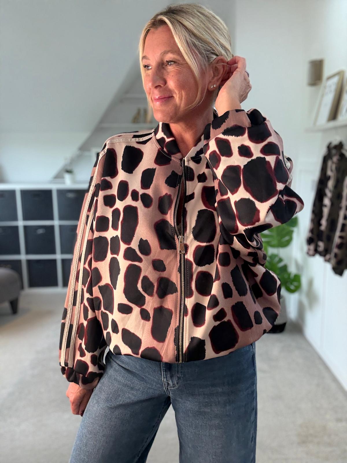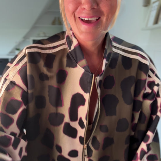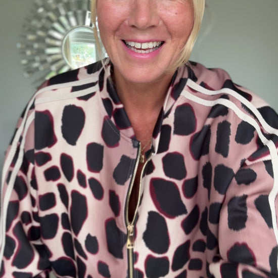 A statement layer for the new season! This bomber jacket features a bold animal print, front zip fastening, ribbed elasticated cuffs and hem, contrasting stripes down the sleeves and handy side pockets. Designed in a relaxed fit, it’s the perfect mix of comfort and cool.