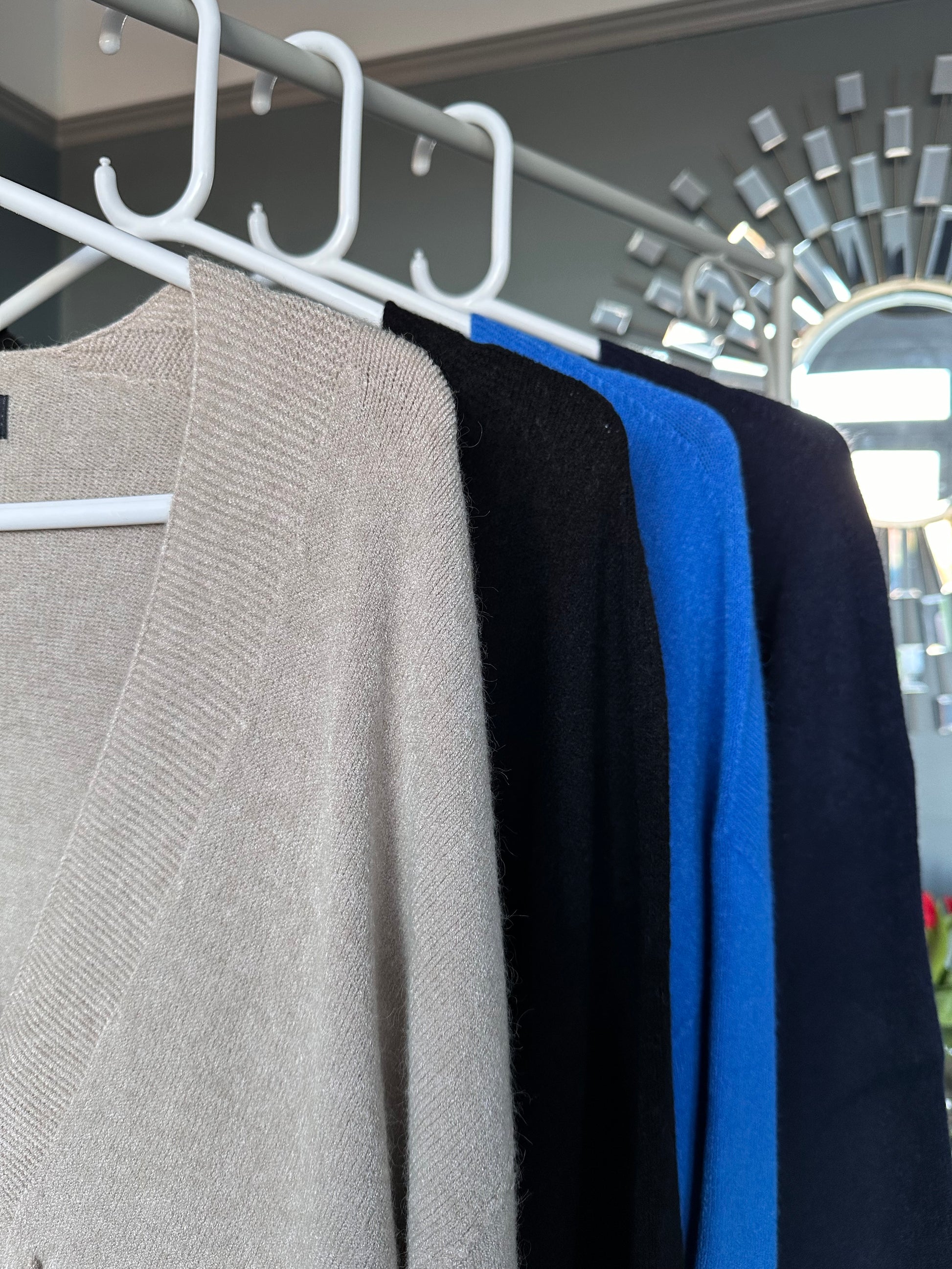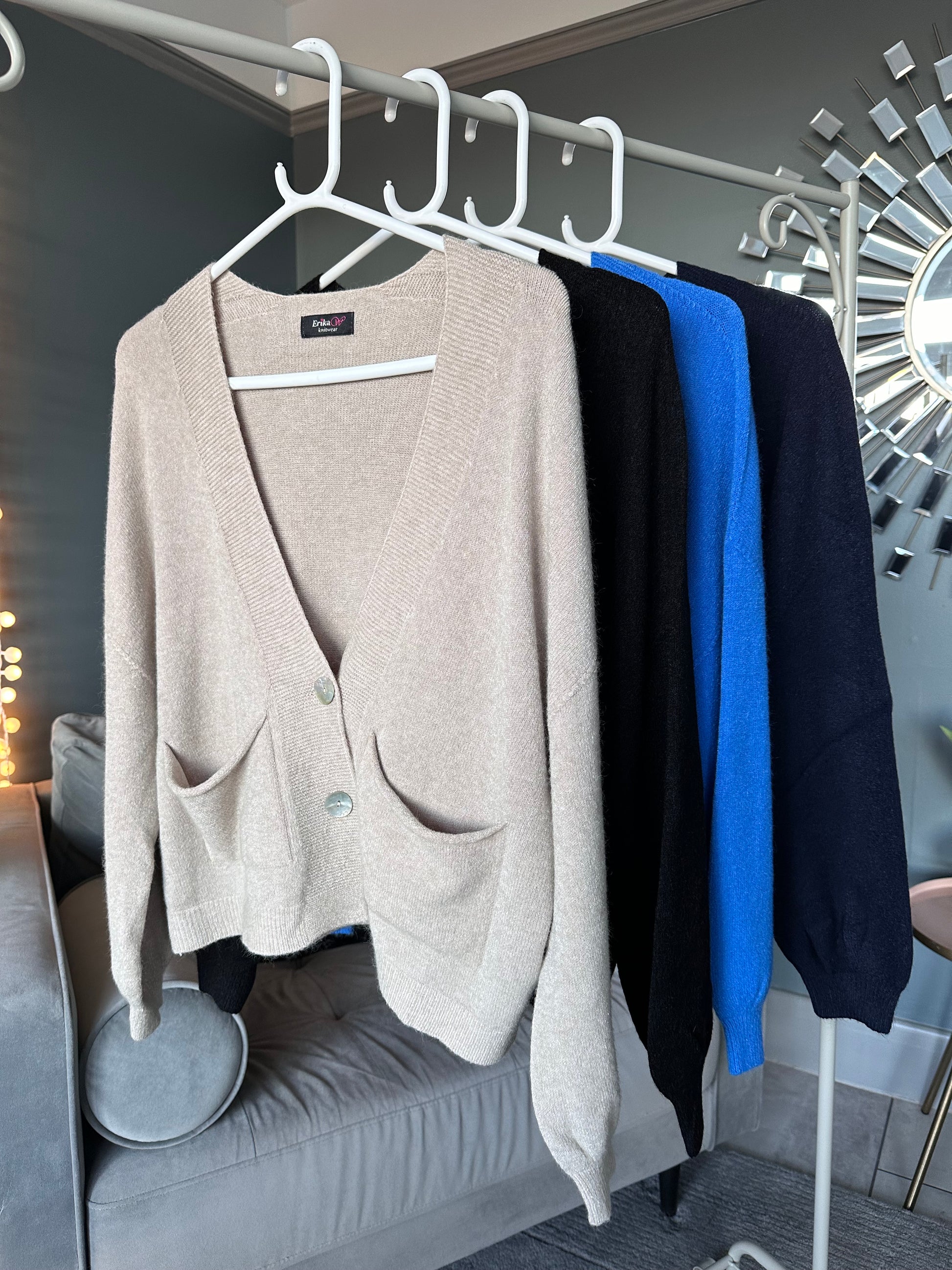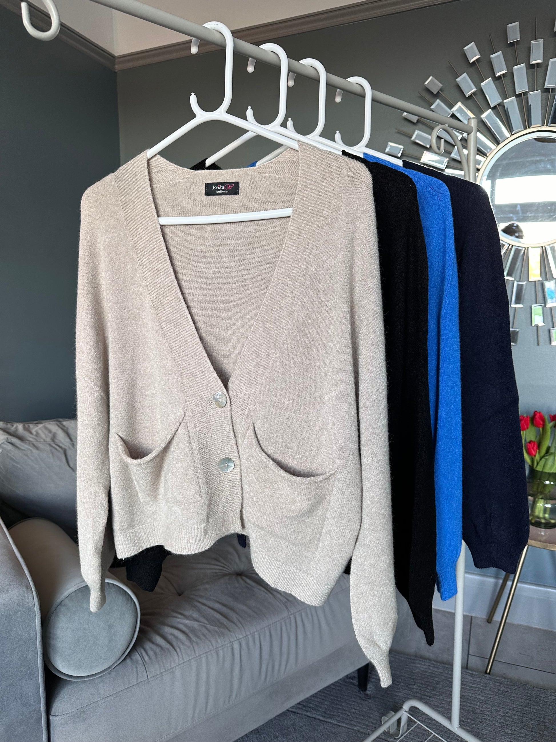 Super soft cardigan with a V-neckline and ribbed edge at the hem and cuff. So versatile and can be worn over dresses or with jeans or skirts. A nice weight, not too thick so will be great going through to Autumn.