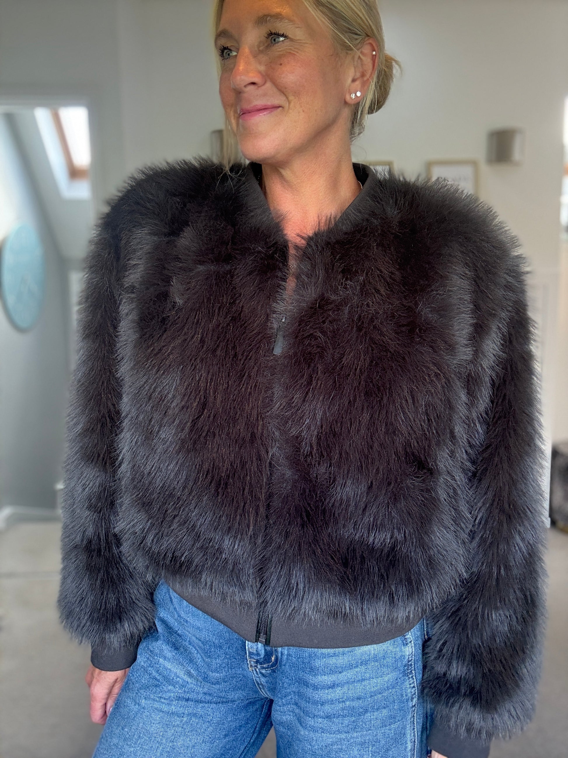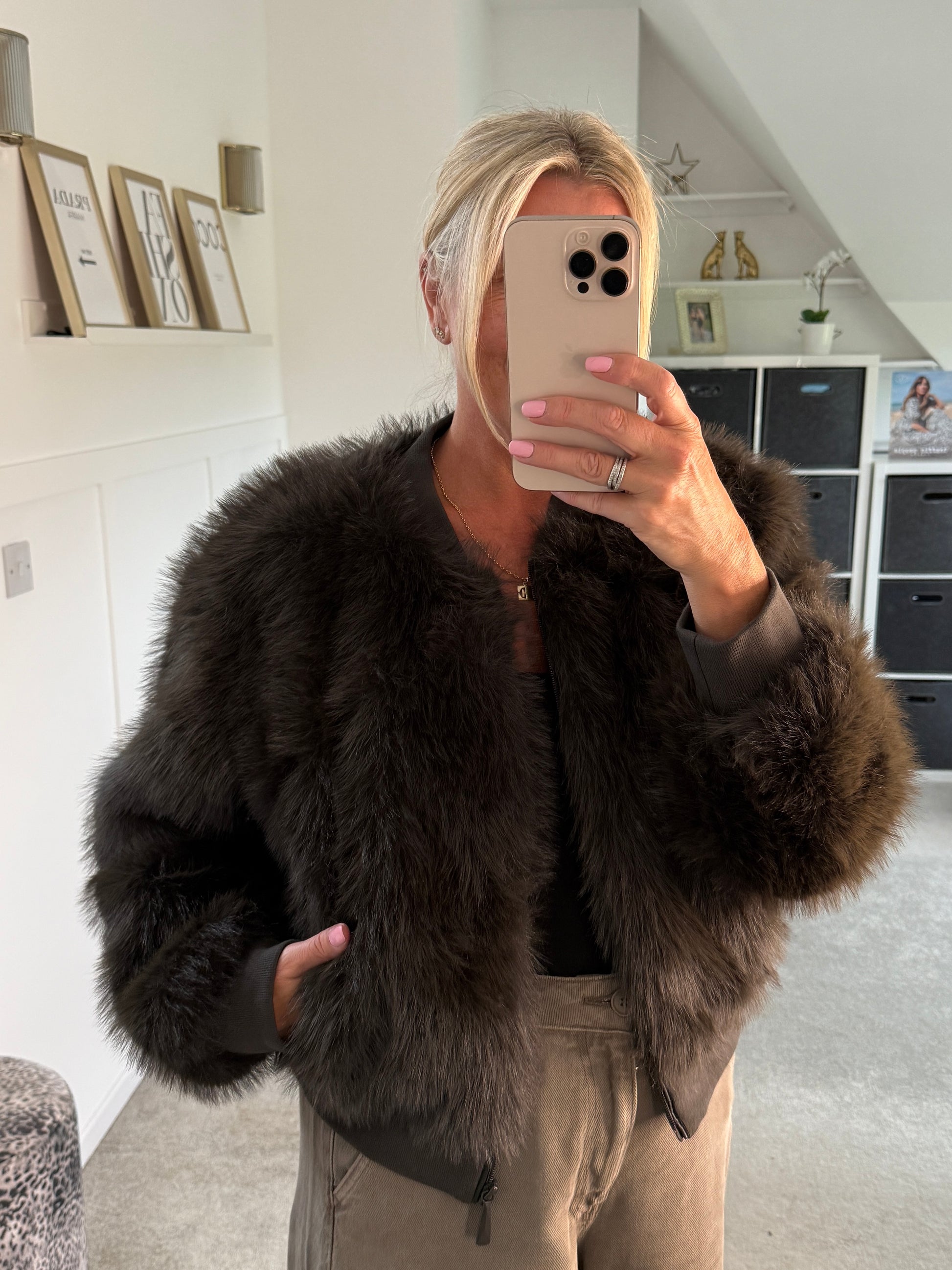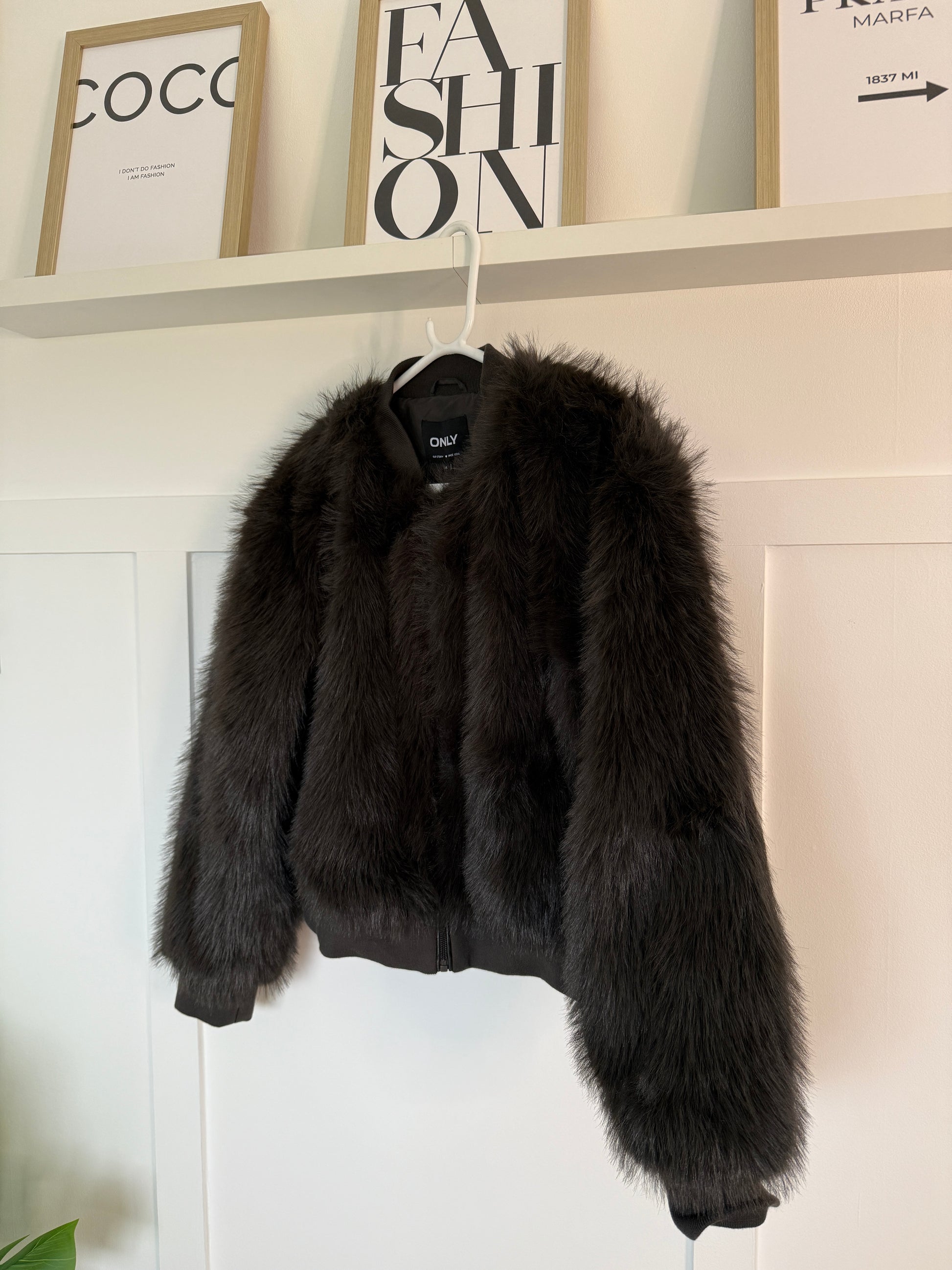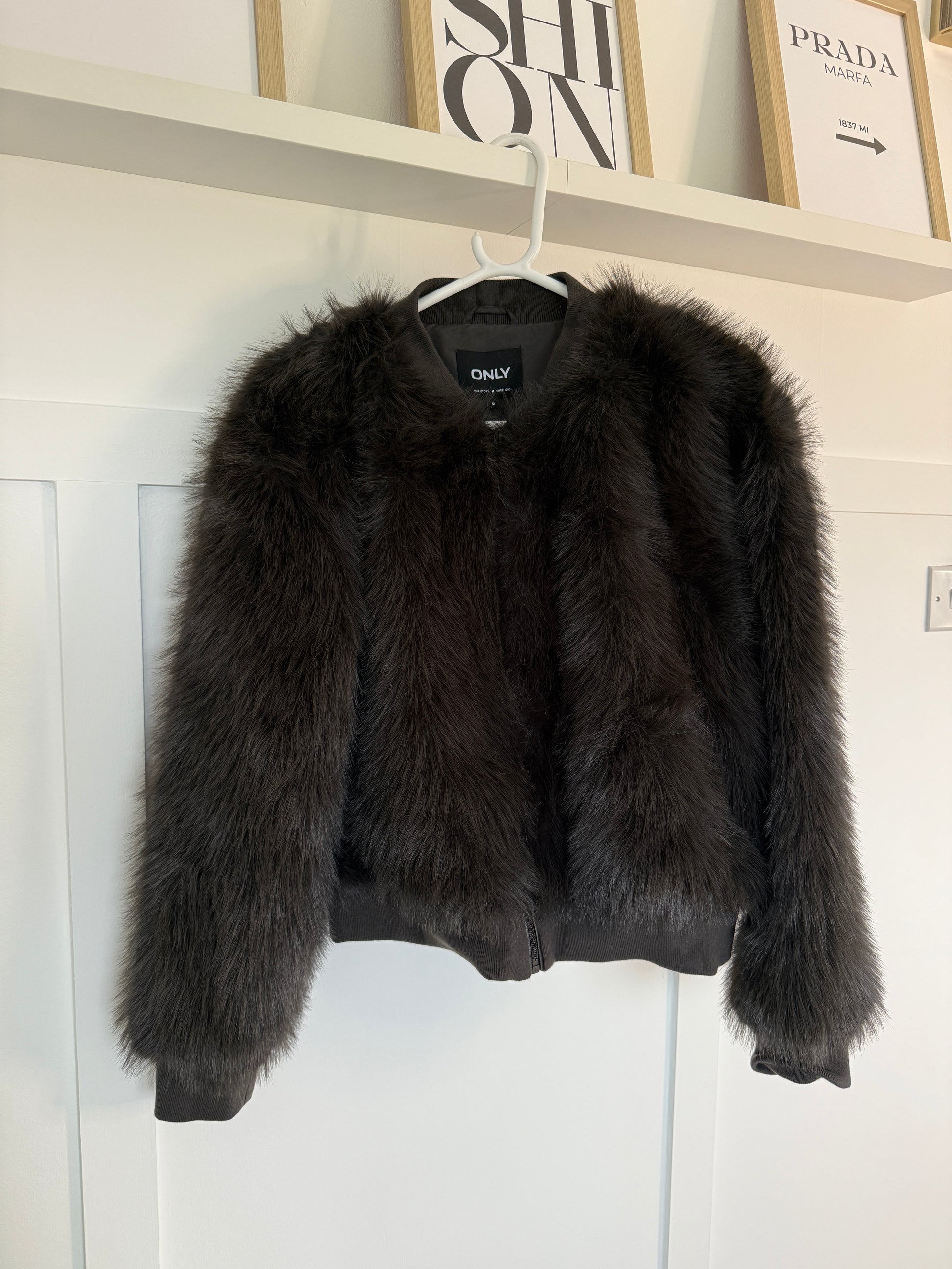 Absolutely STUNNING deep Phantom (Chocolate) faux fur bomber jacket from fashion brand ONLY. Such a beautiful colour. Featuring a front zip fastening and ribbed collar and cuffs.