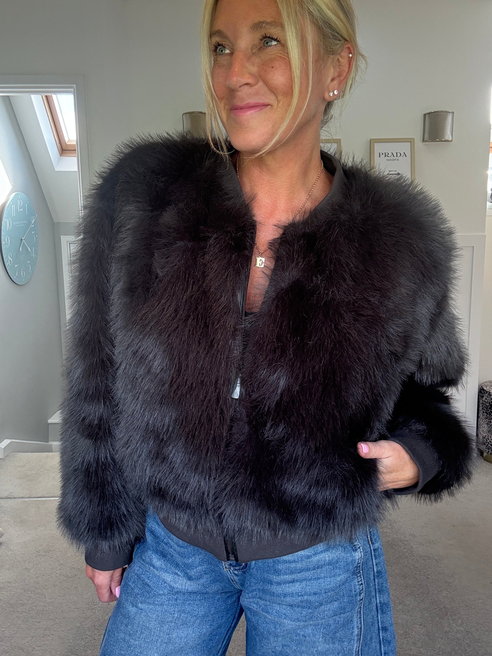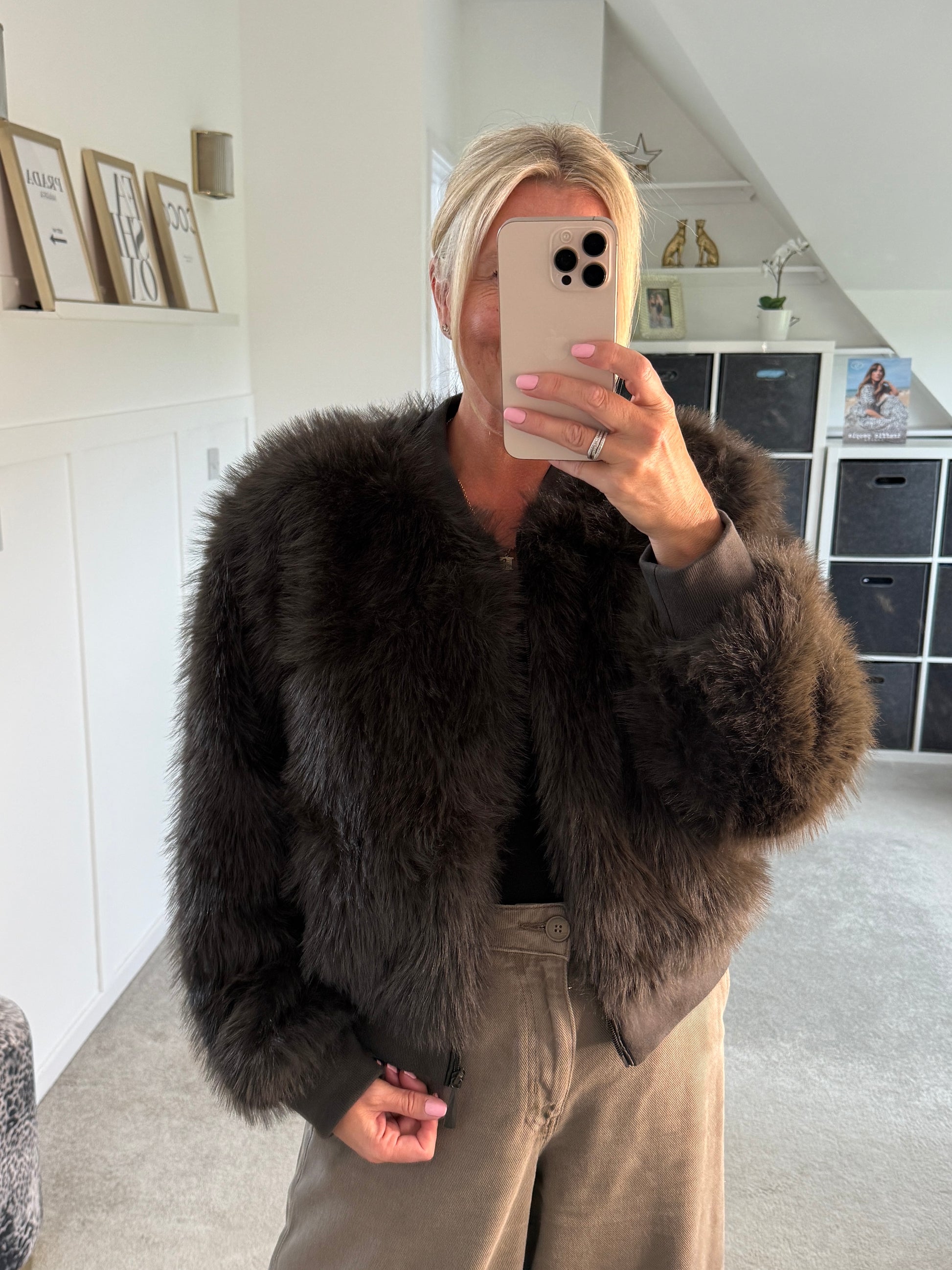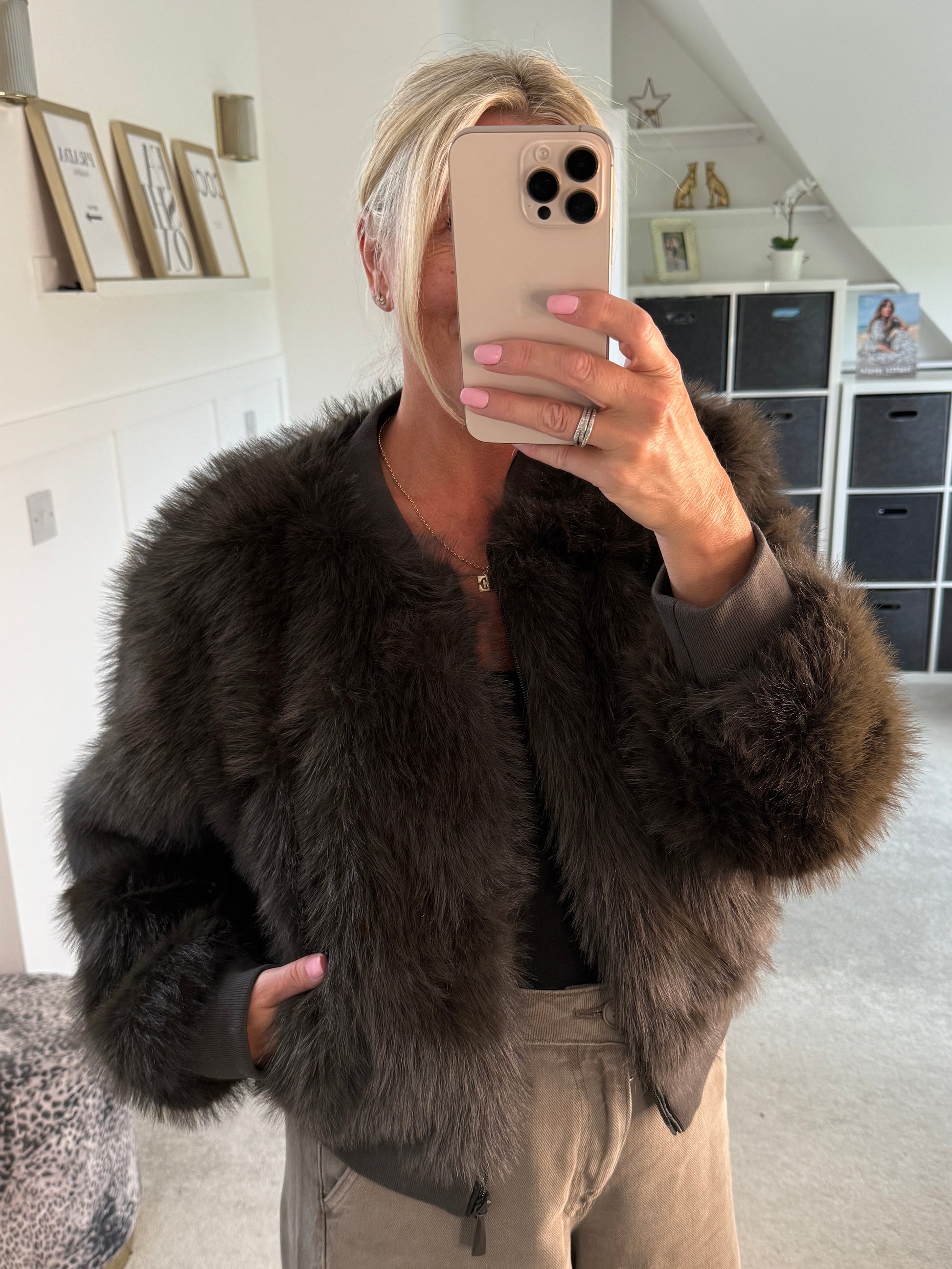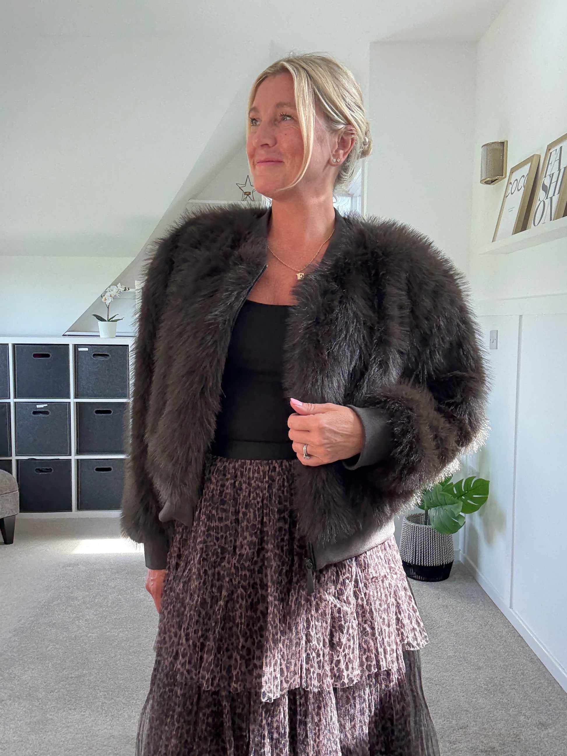 Absolutely STUNNING deep Phantom (Chocolate) faux fur bomber jacket from fashion brand ONLY. Such a beautiful colour. Featuring a front zip fastening and ribbed collar and cuffs.