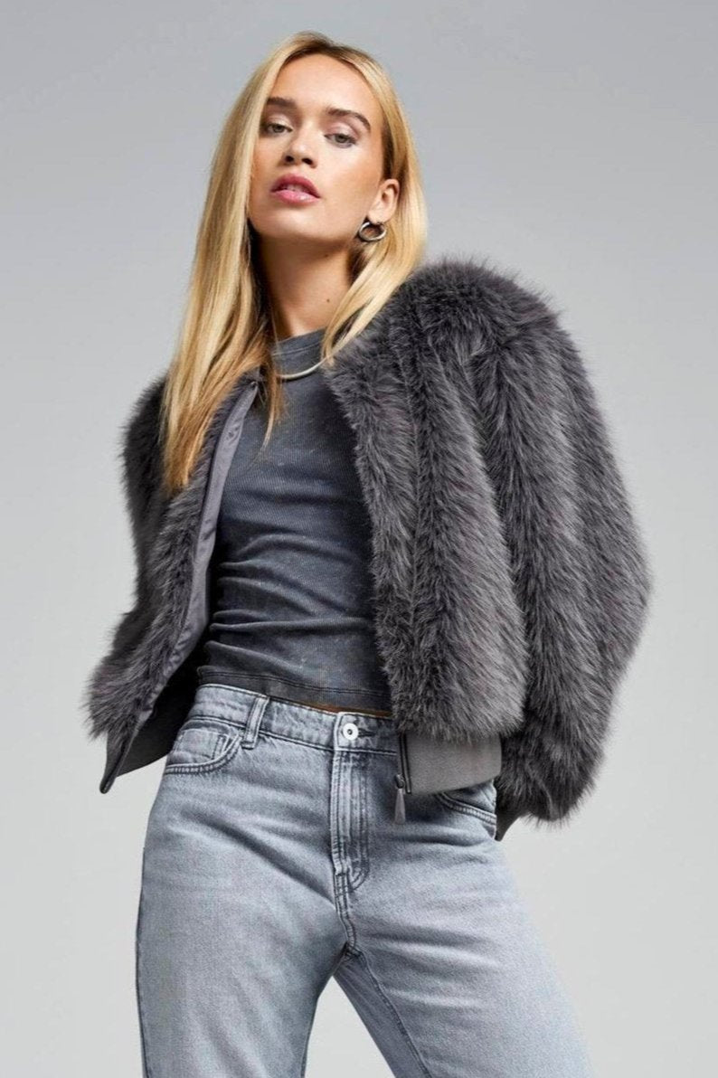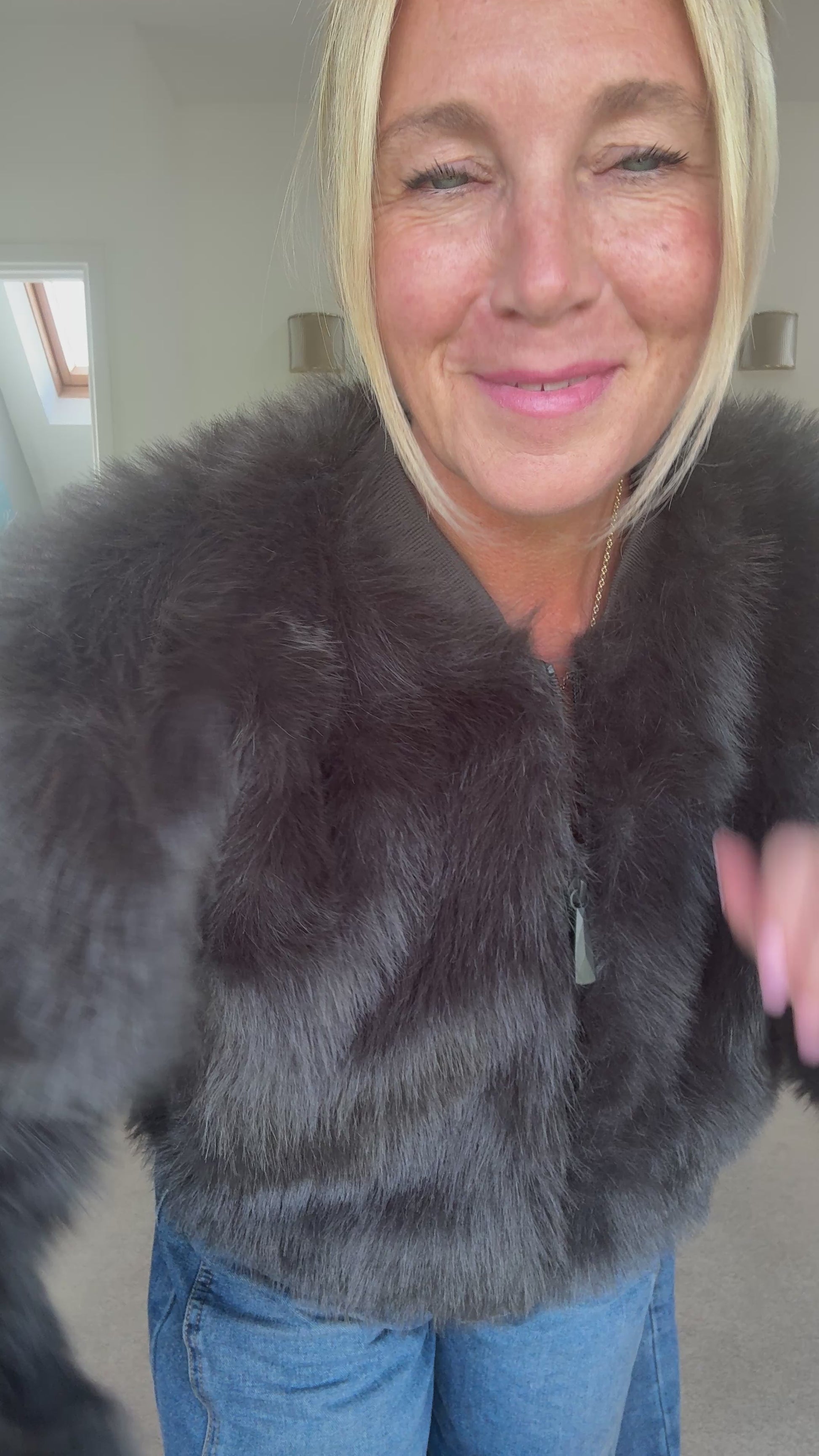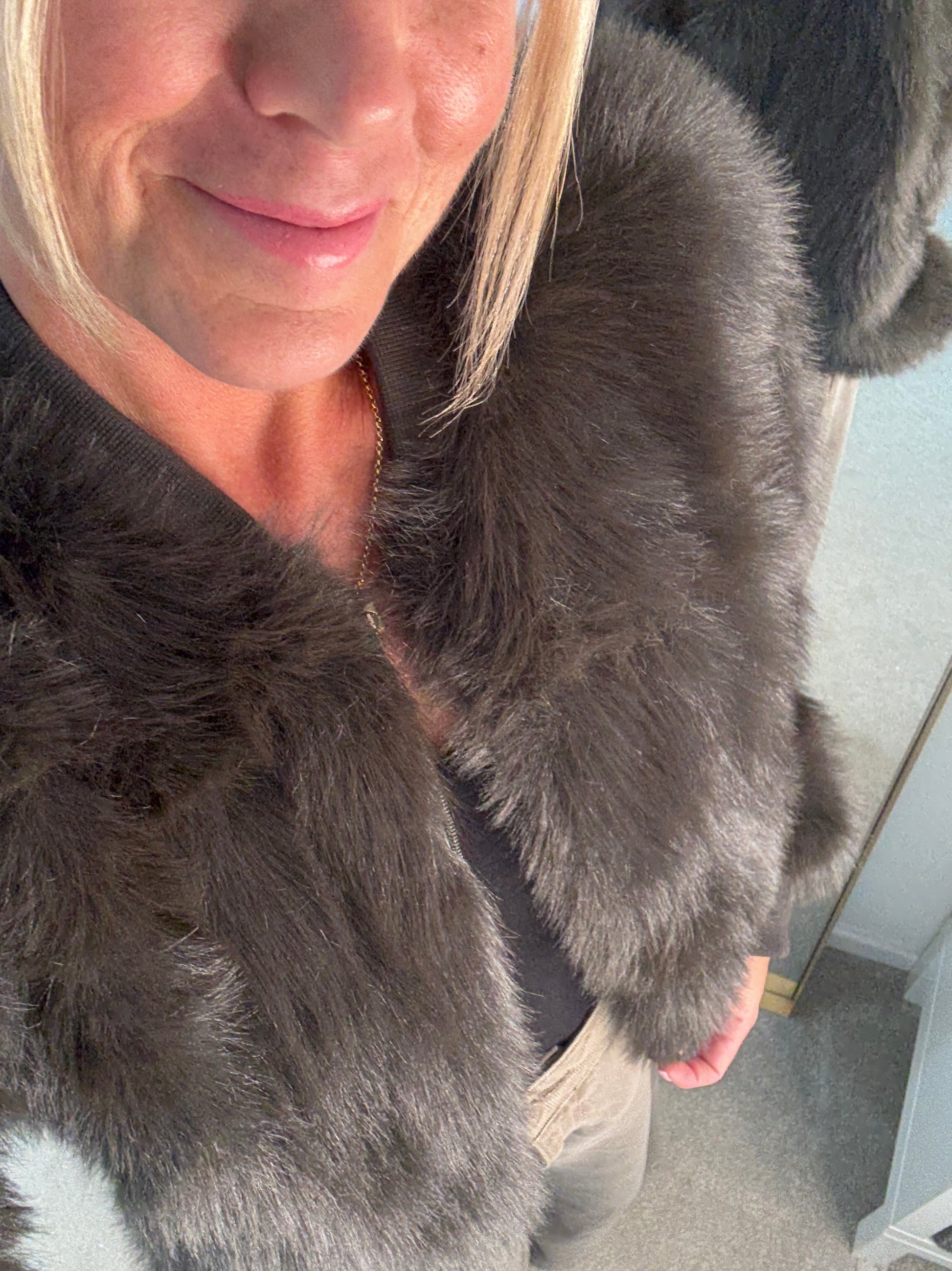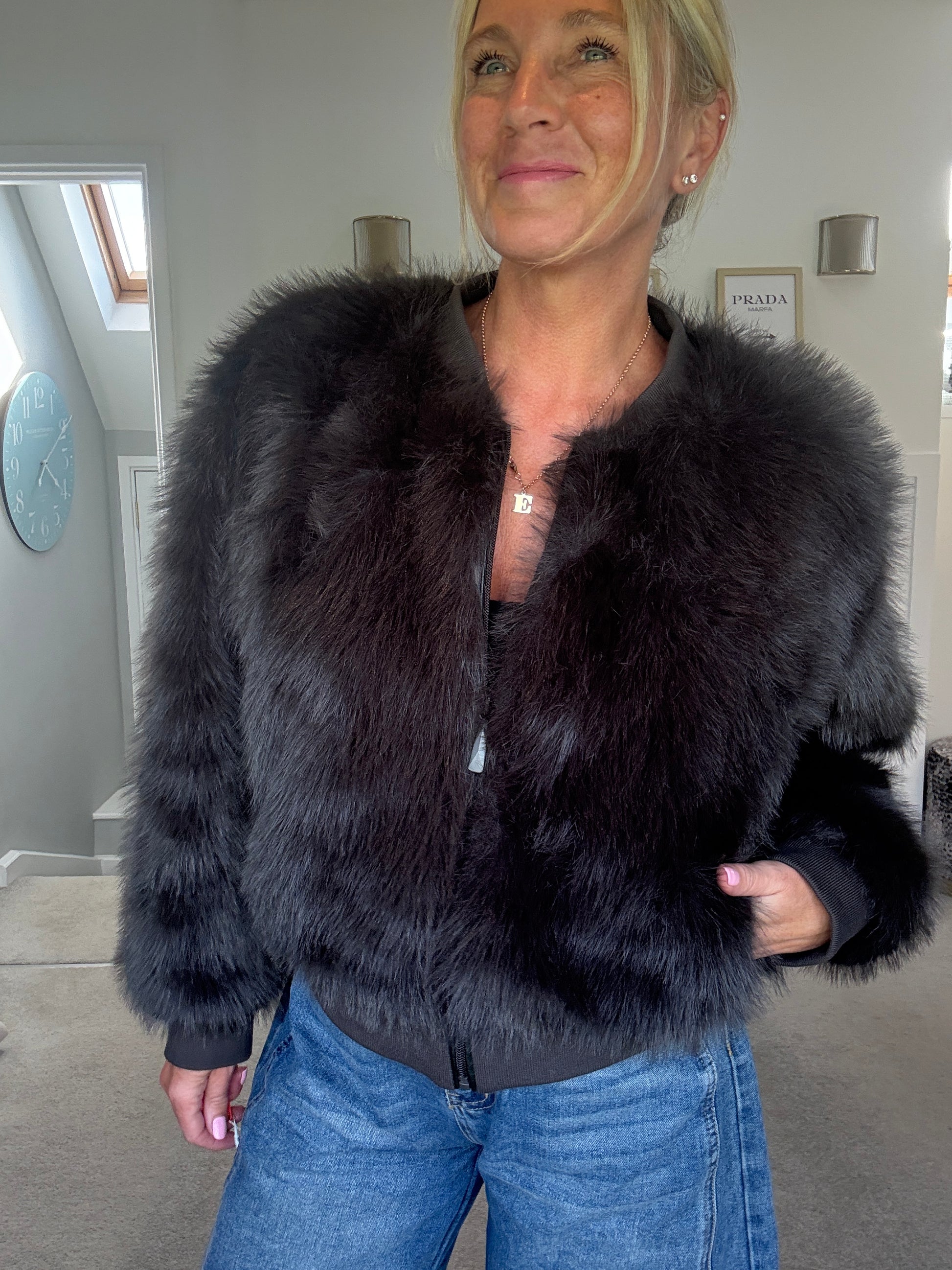 Absolutely STUNNING deep Phantom (Chocolate) faux fur bomber jacket from fashion brand ONLY. Such a beautiful colour. Featuring a front zip fastening and ribbed collar and cuffs.