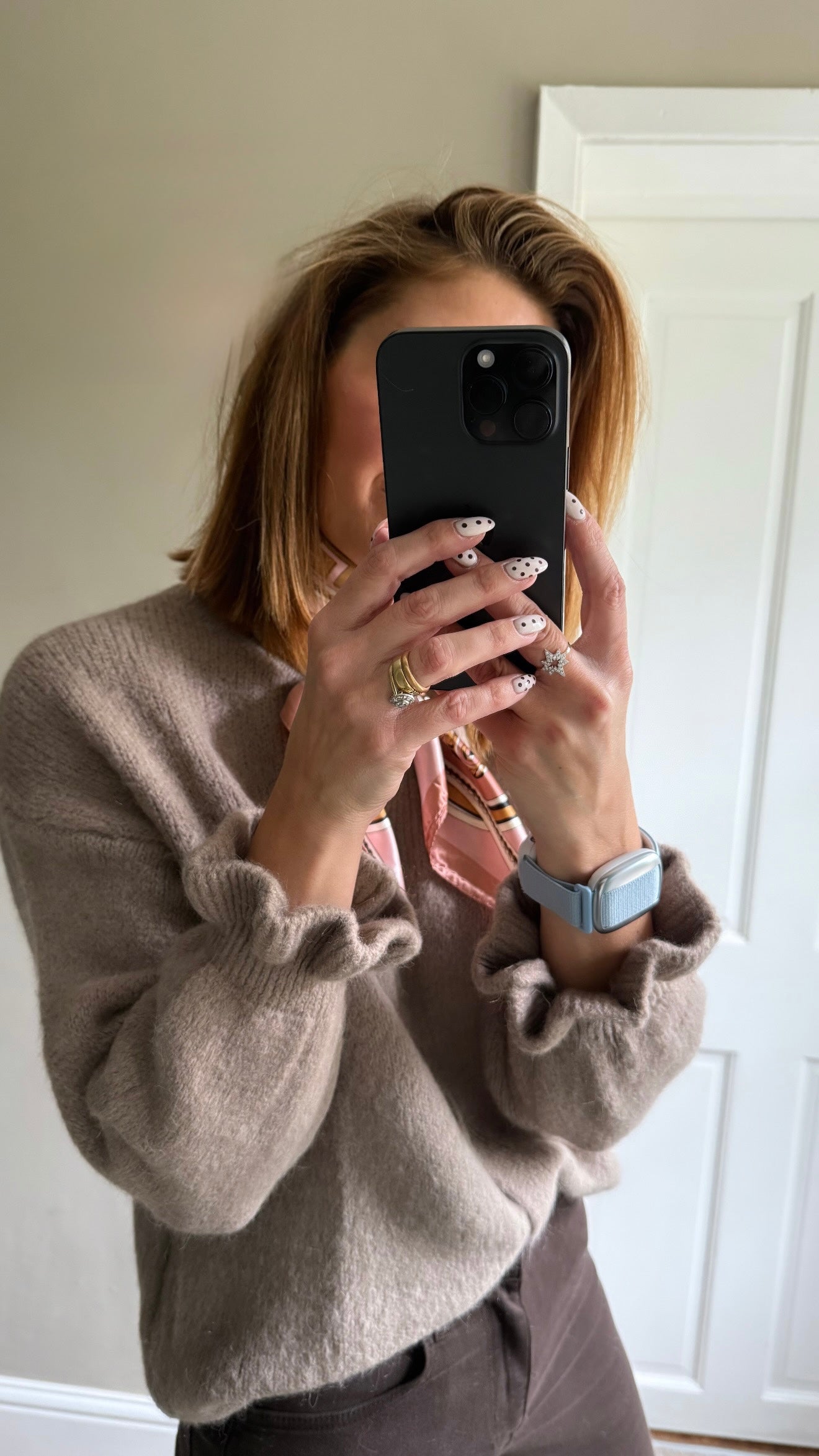 Super lovely alpaca mix fluffy frill sleeve cardigan. So cute with the frill sleeve detail on the sleeves. A nice one size fit and looks great style with the new barrel leg jeans. Such a gorgeous colour.