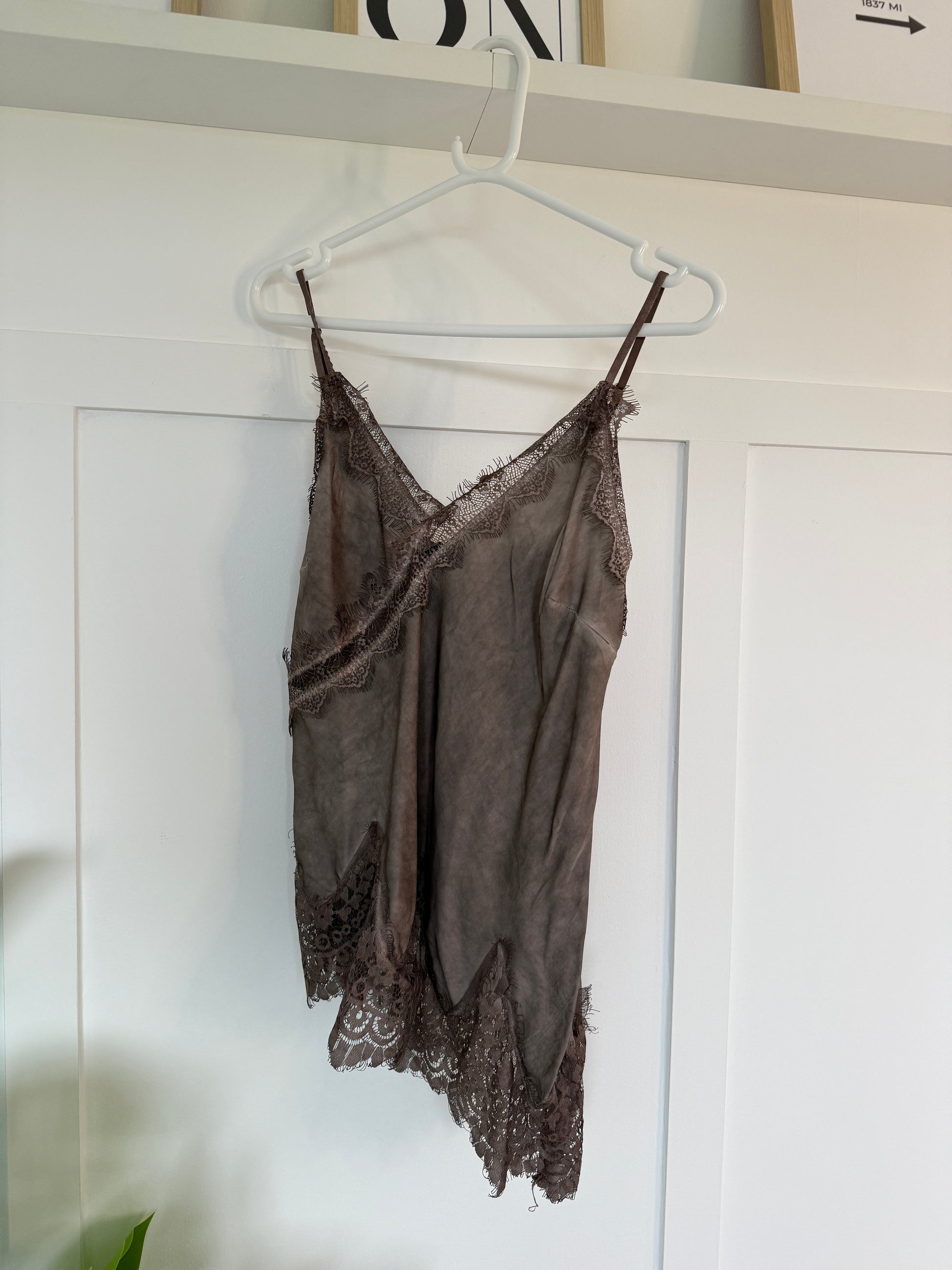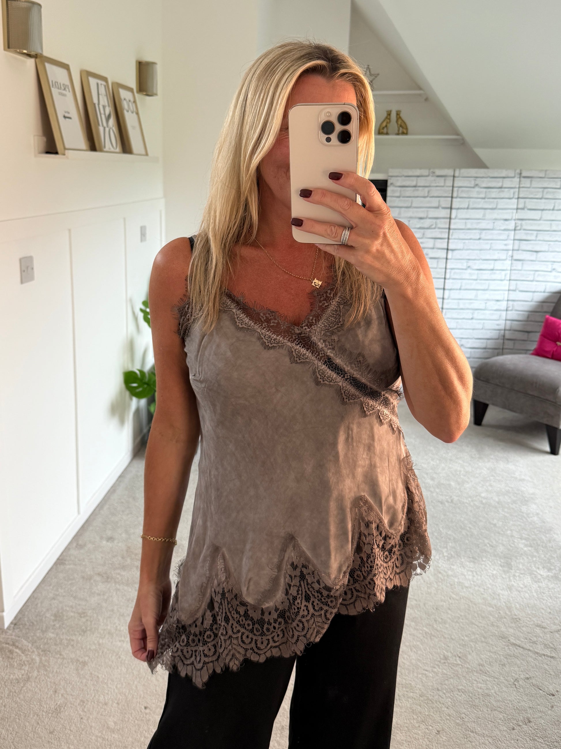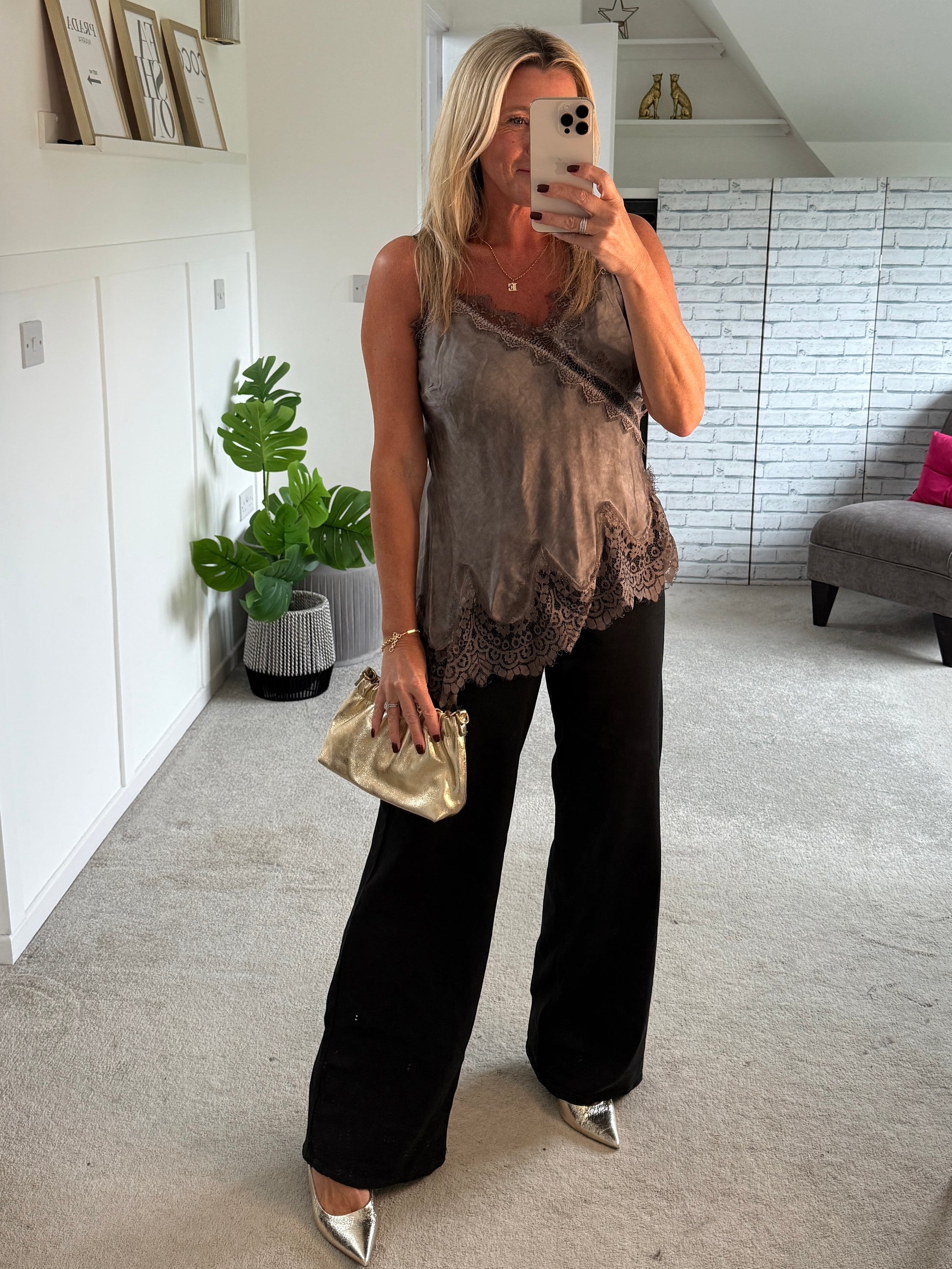 Chic and feminine, this viscose satin cami features a pretty delicate lace trim, a fluid and very trendy asymmetrical drape and lightweight feel make it perfect for layering under blazers, cardigans, or denim jackets. Also wear with wide leg jeans for a true fashion forward look.