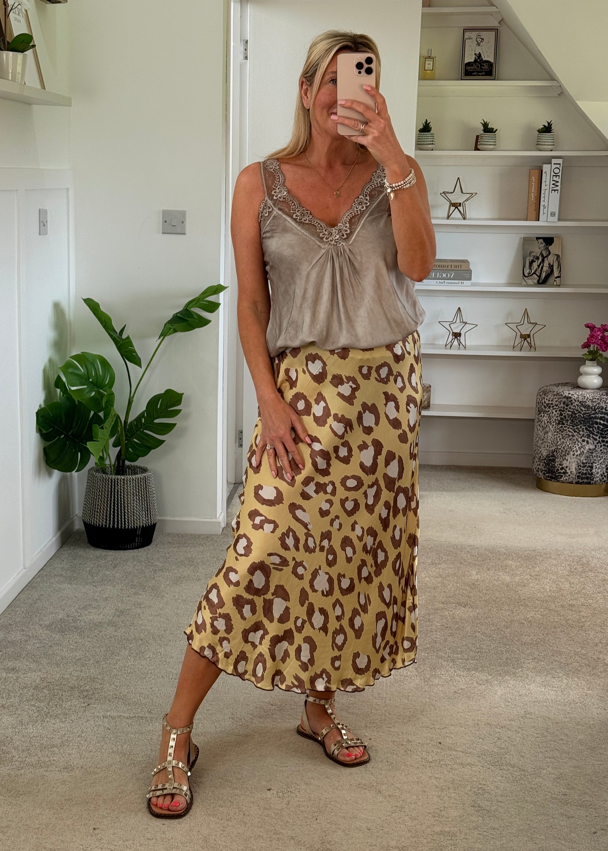 A beautifully soft, satin-feel lace top with a gently gathered V-neck and an elegant, easy drape. The subtle flare creates a flattering shape that skims the tummy beautifully.
