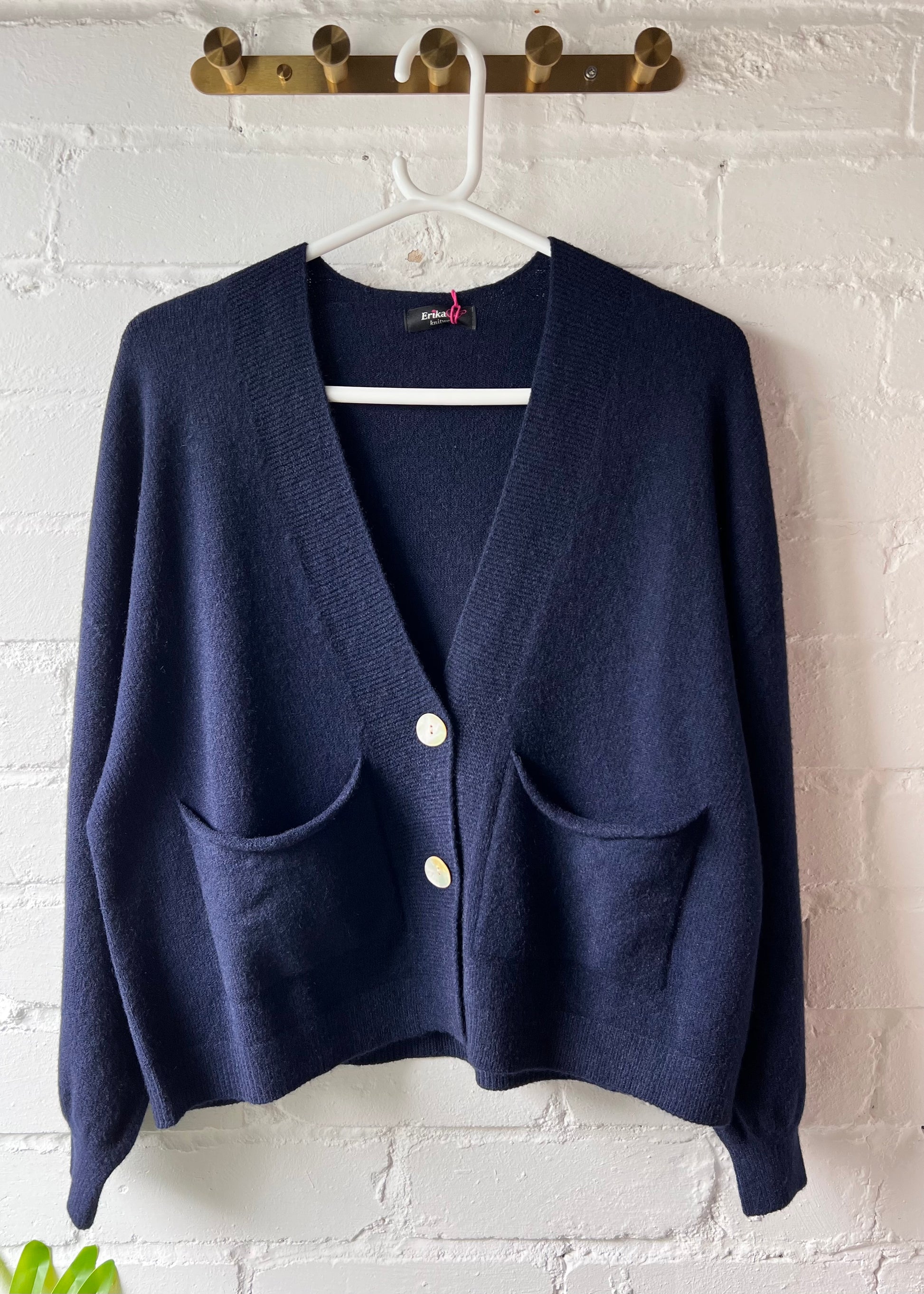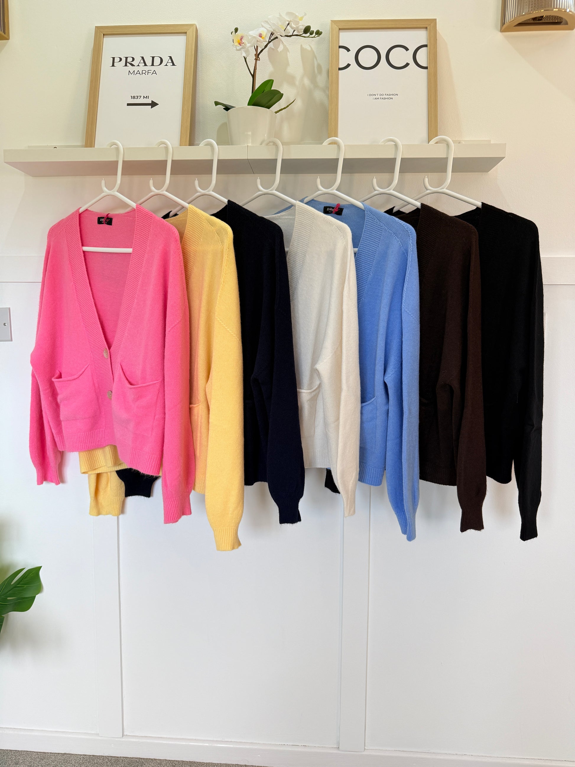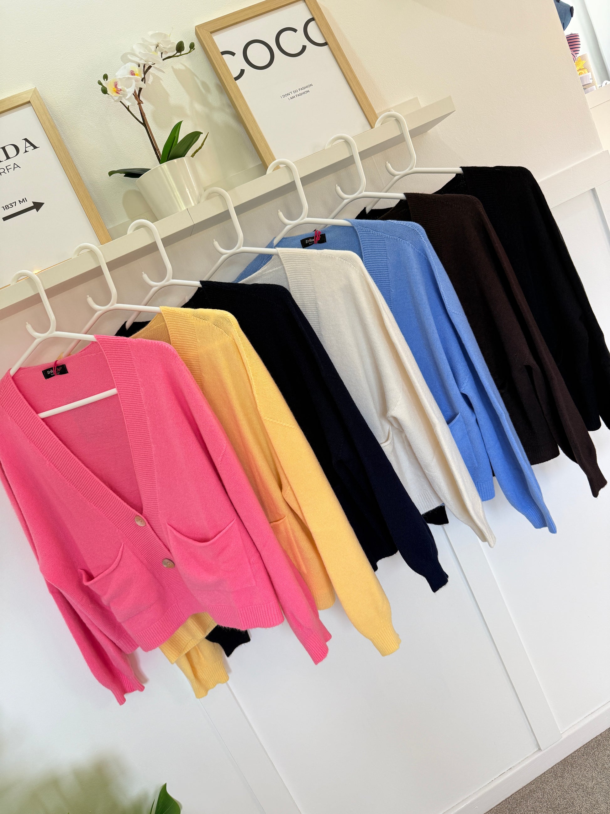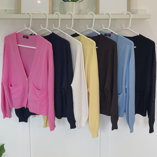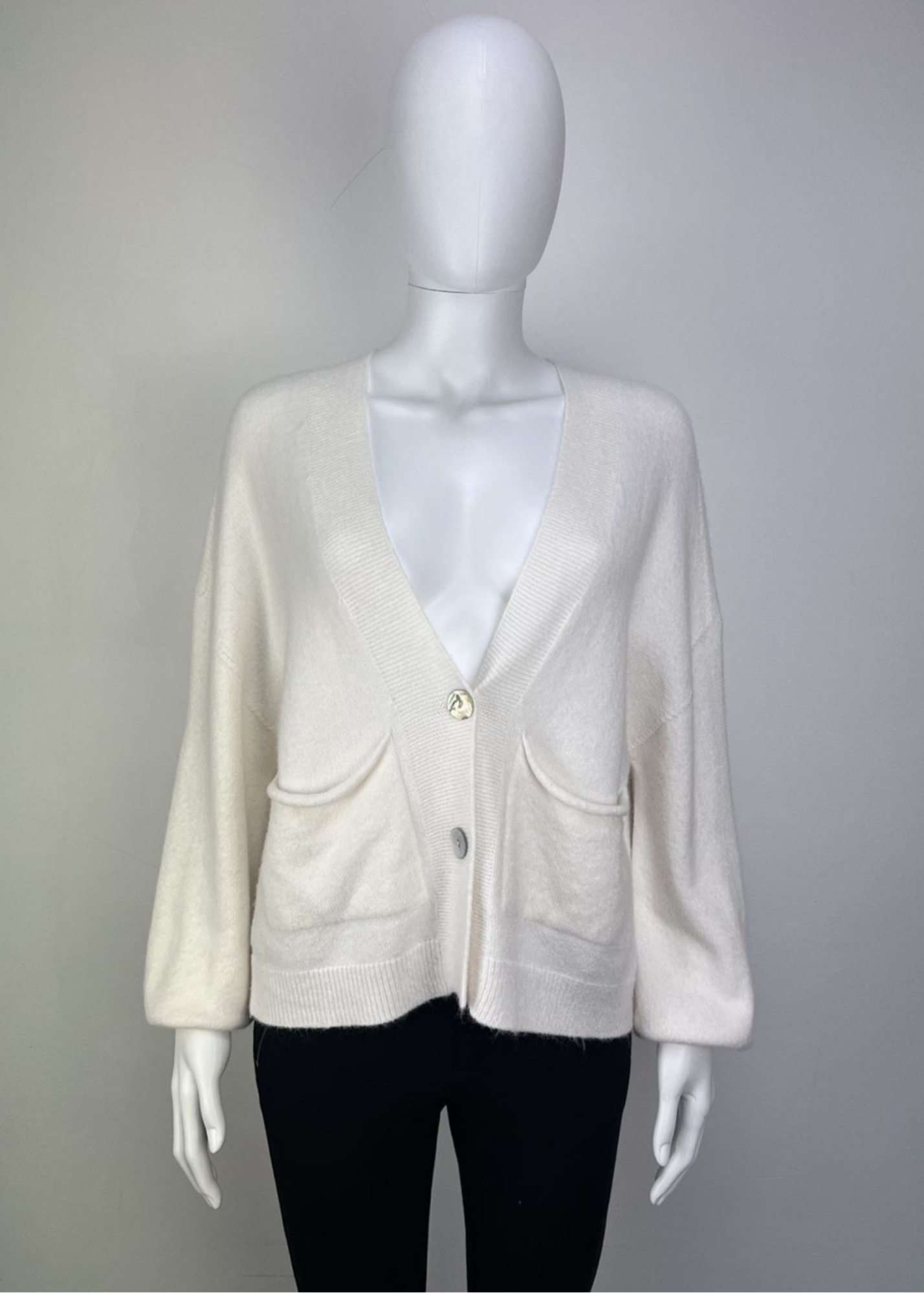 Super soft V-neck cardigan with ribbed hem and cuffs, front patch pockets, and 2 button detail.
