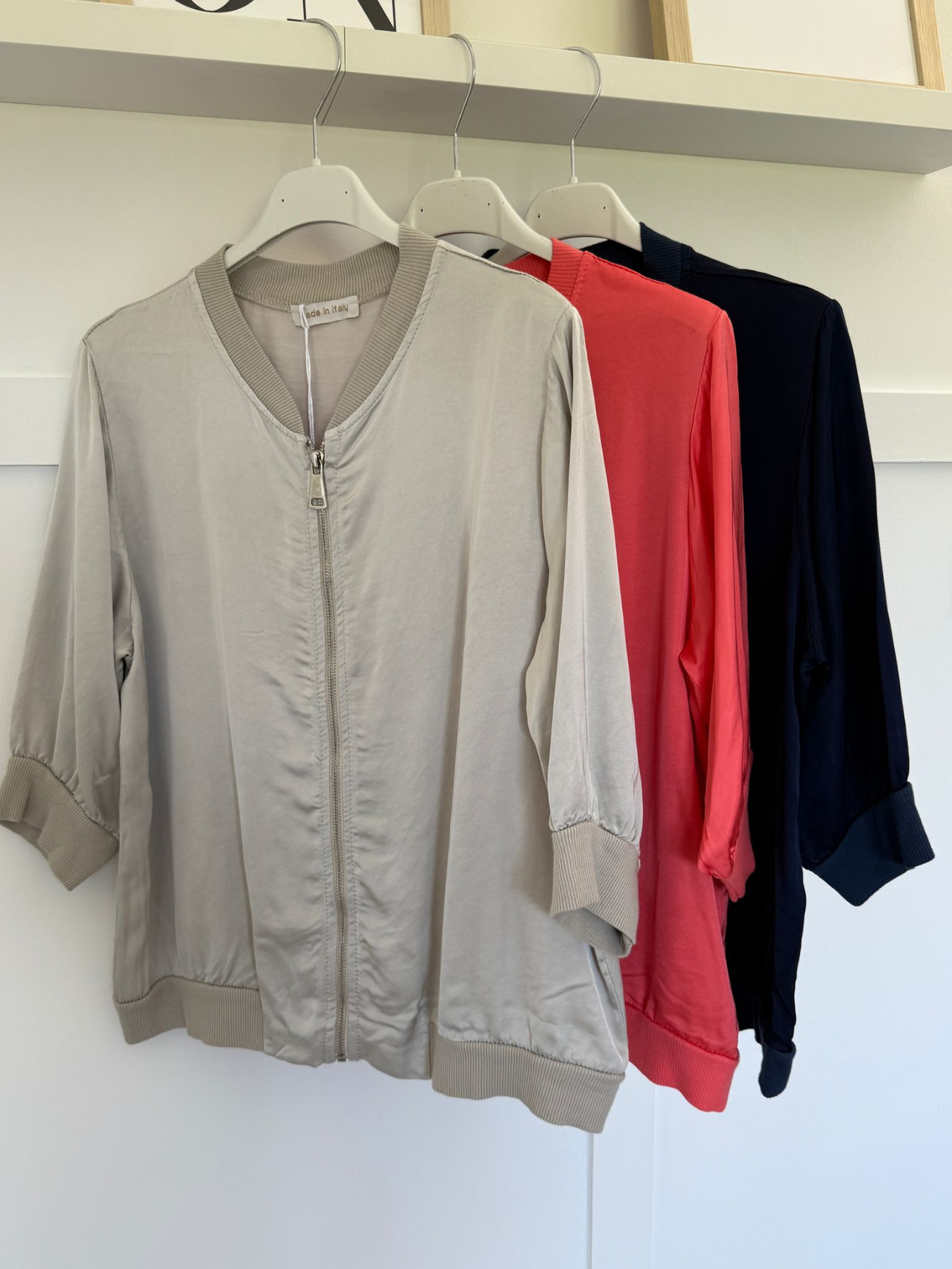 Made from a soft viscose/silk-blend fabric, it has a subtle sheen and lightweight feel—perfect for layering through the seasons. Featuring a zip-up front, relaxed silhouette, and ribbed trims, the cropped ½ sleeves give it a fresh, modern twist. Style with jeans, dresses, or joggers for an effortlessly cool look.