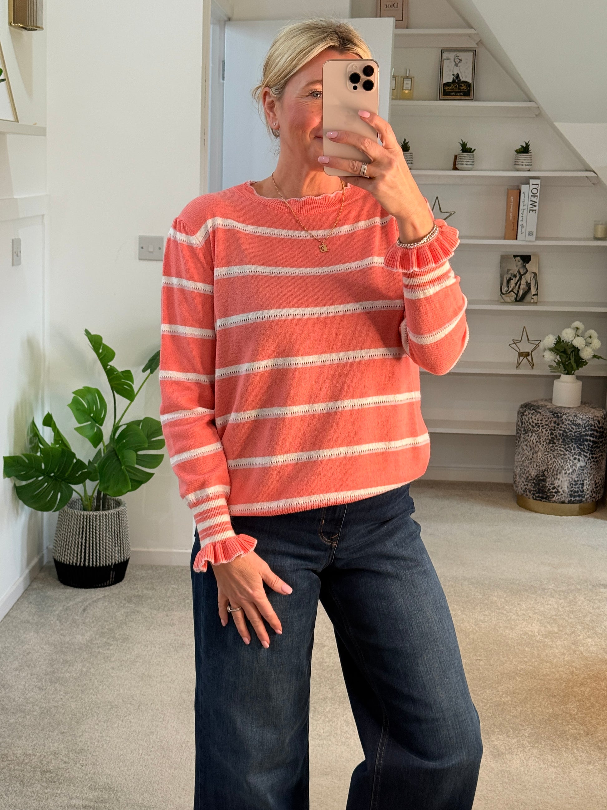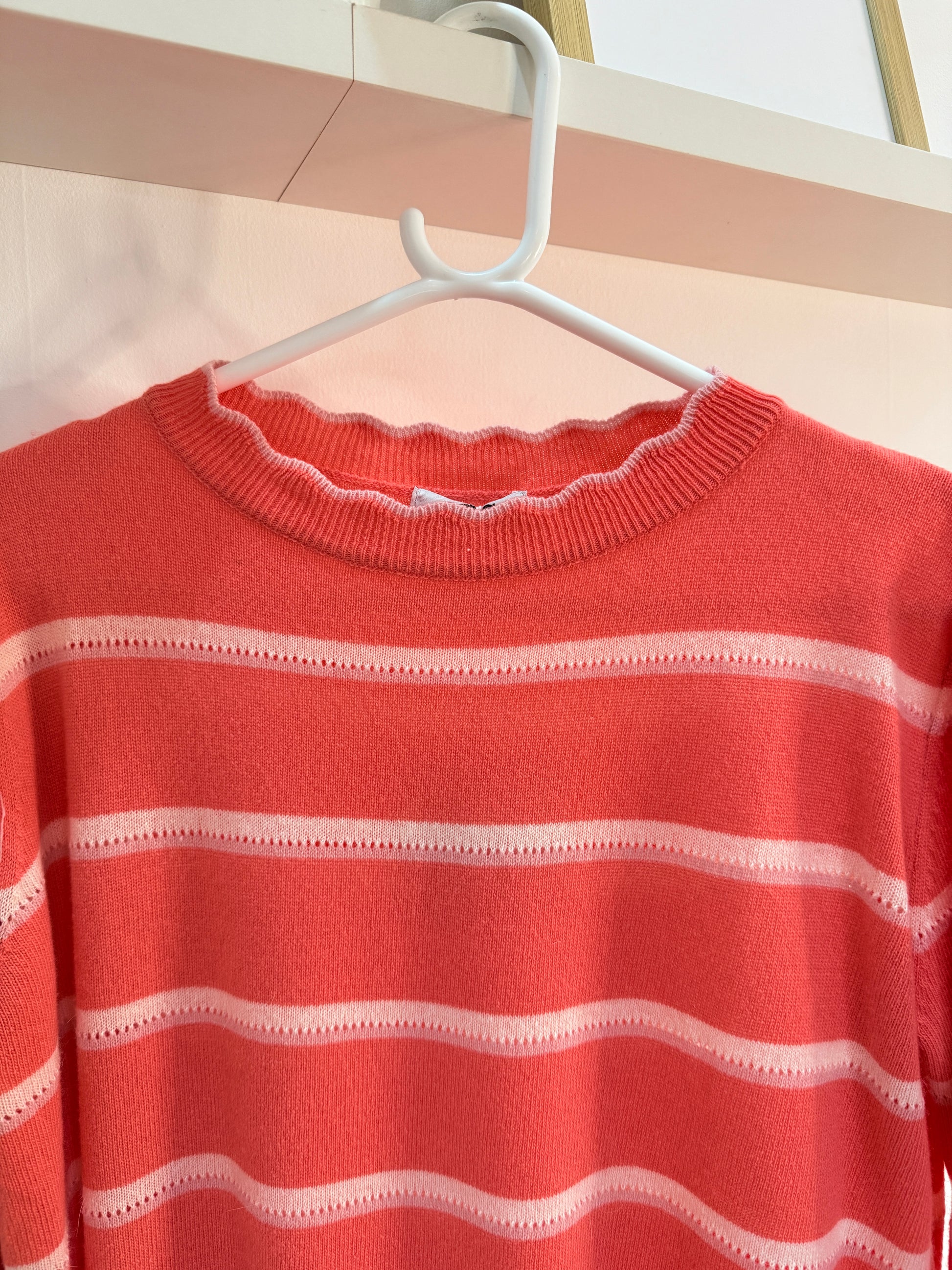Merino and Cashmere mix, striped lightweight knit with beautiful scallop edged neckline, slight puff shoulders and pretty frill sleeve cuffs. A lovely one size fit and looks great layered over blouses..A nice lightweight to take you into Spring...also available in Coral