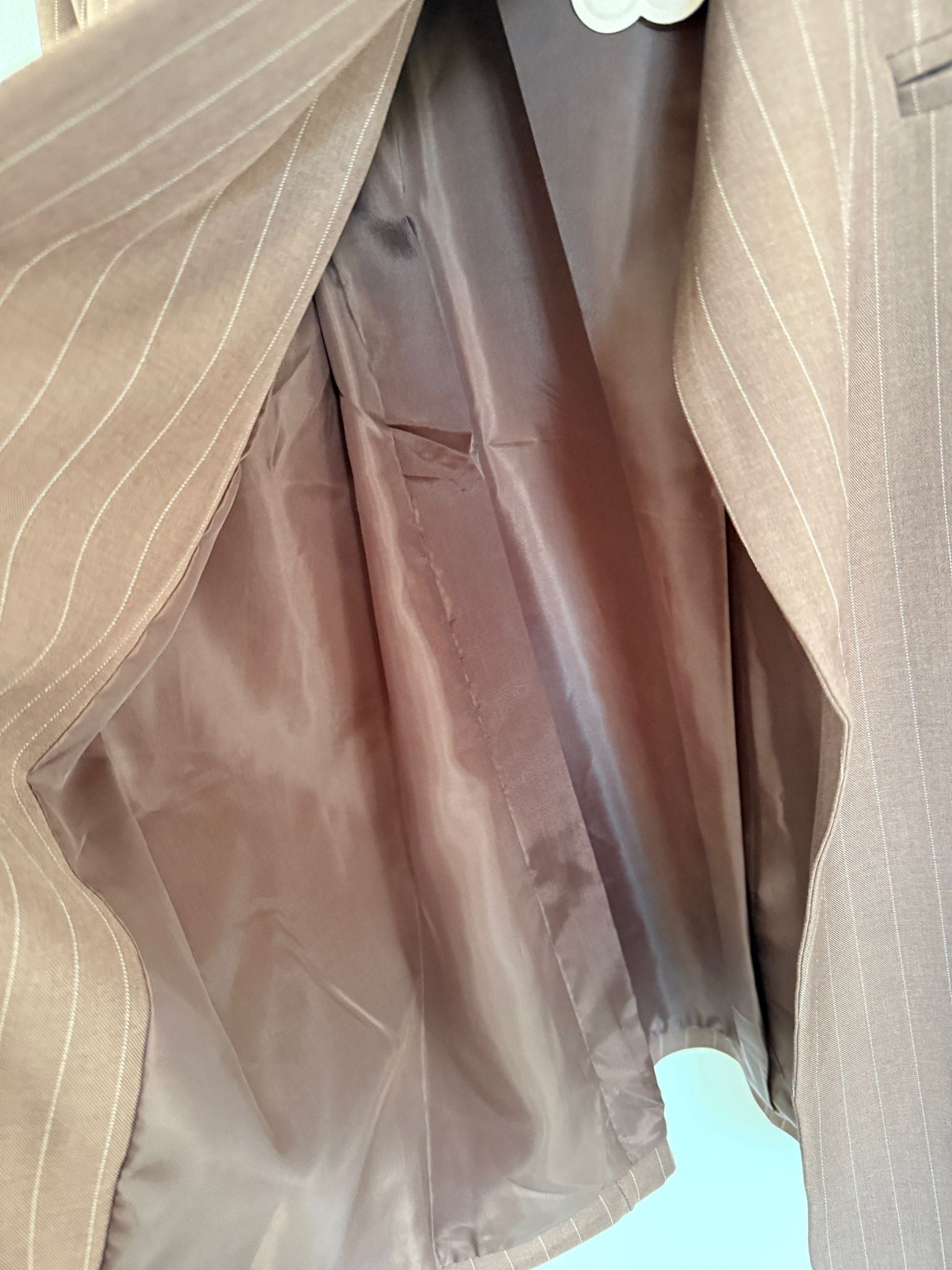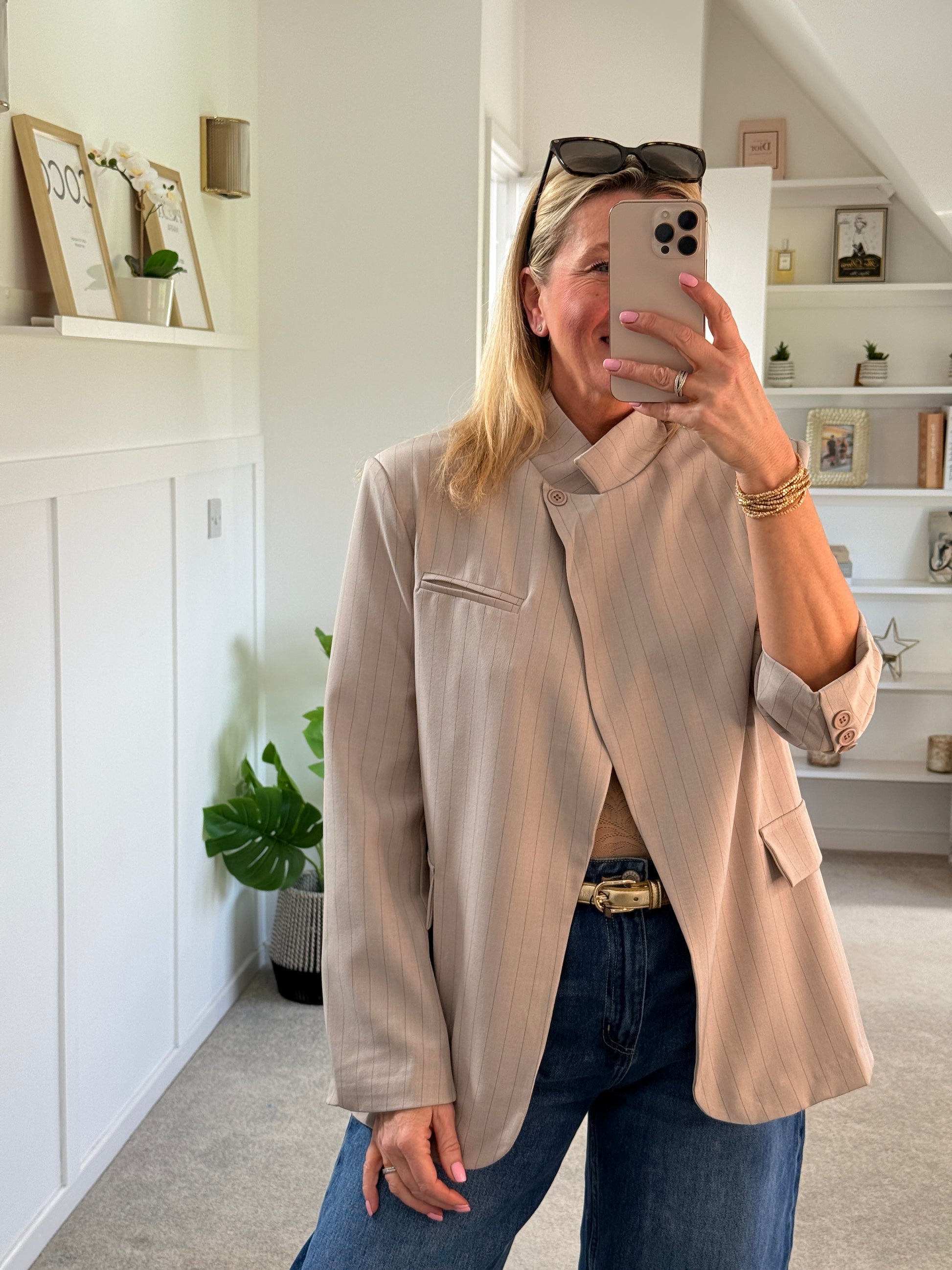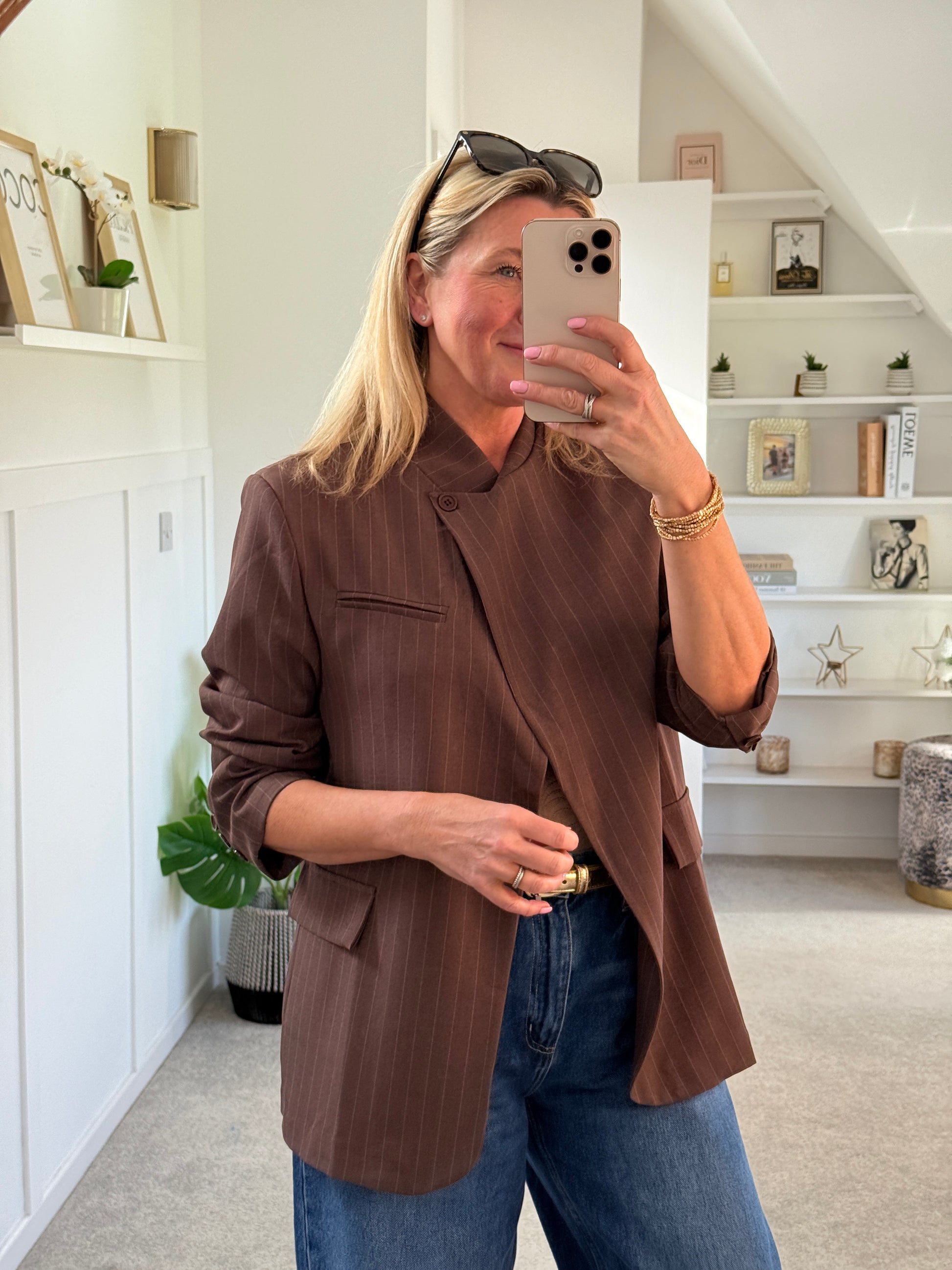 Elevate your everyday style with this fab pinstripe blazer. Designed with classic tailoring and a structured revere collar, it can also be fastened under the collar to create a unique asymmetric look. The double-breasted style gives a polished feel while still being effortlessly wearable...with faux pockets, shoulder pads and fully lined.