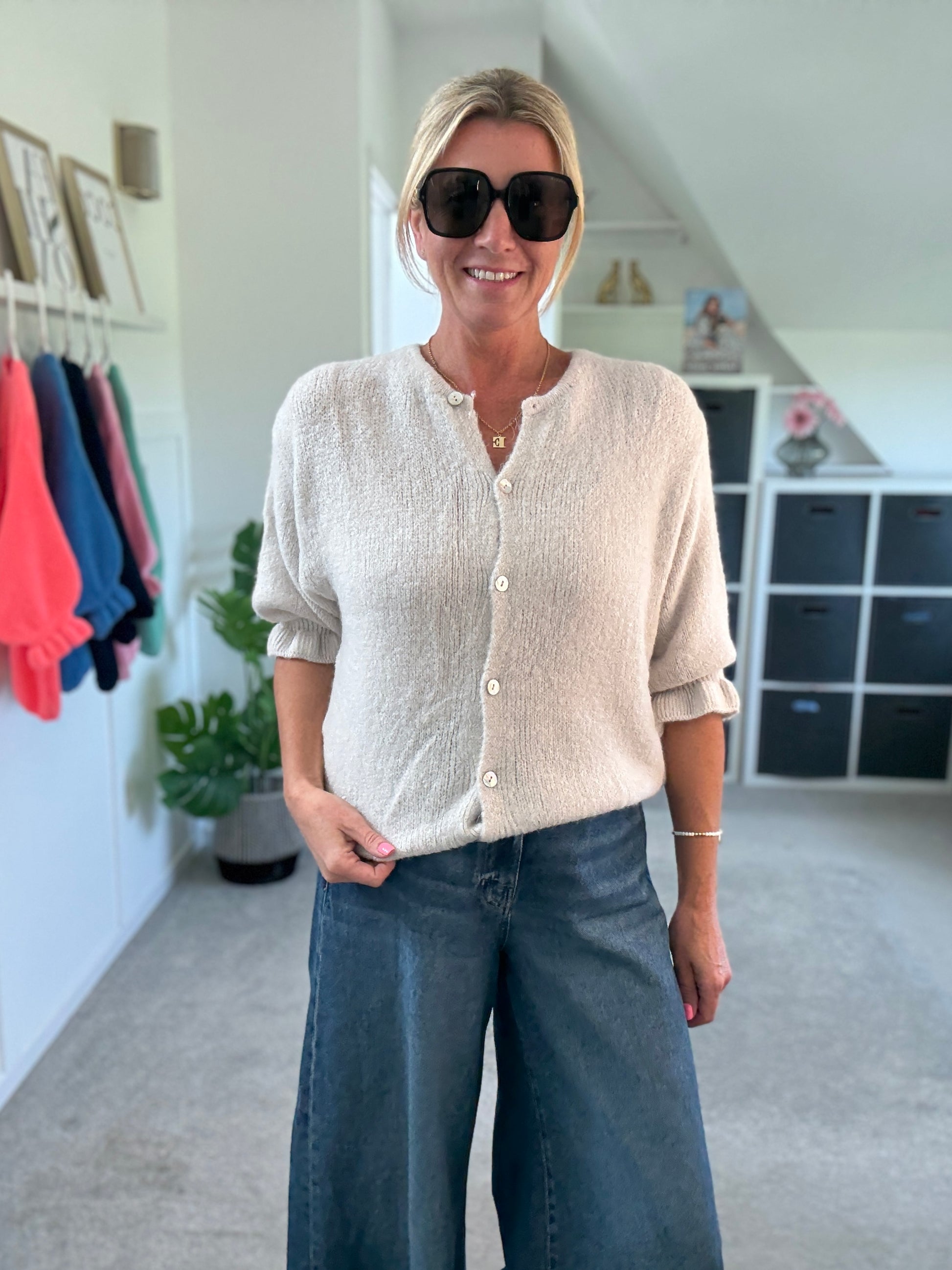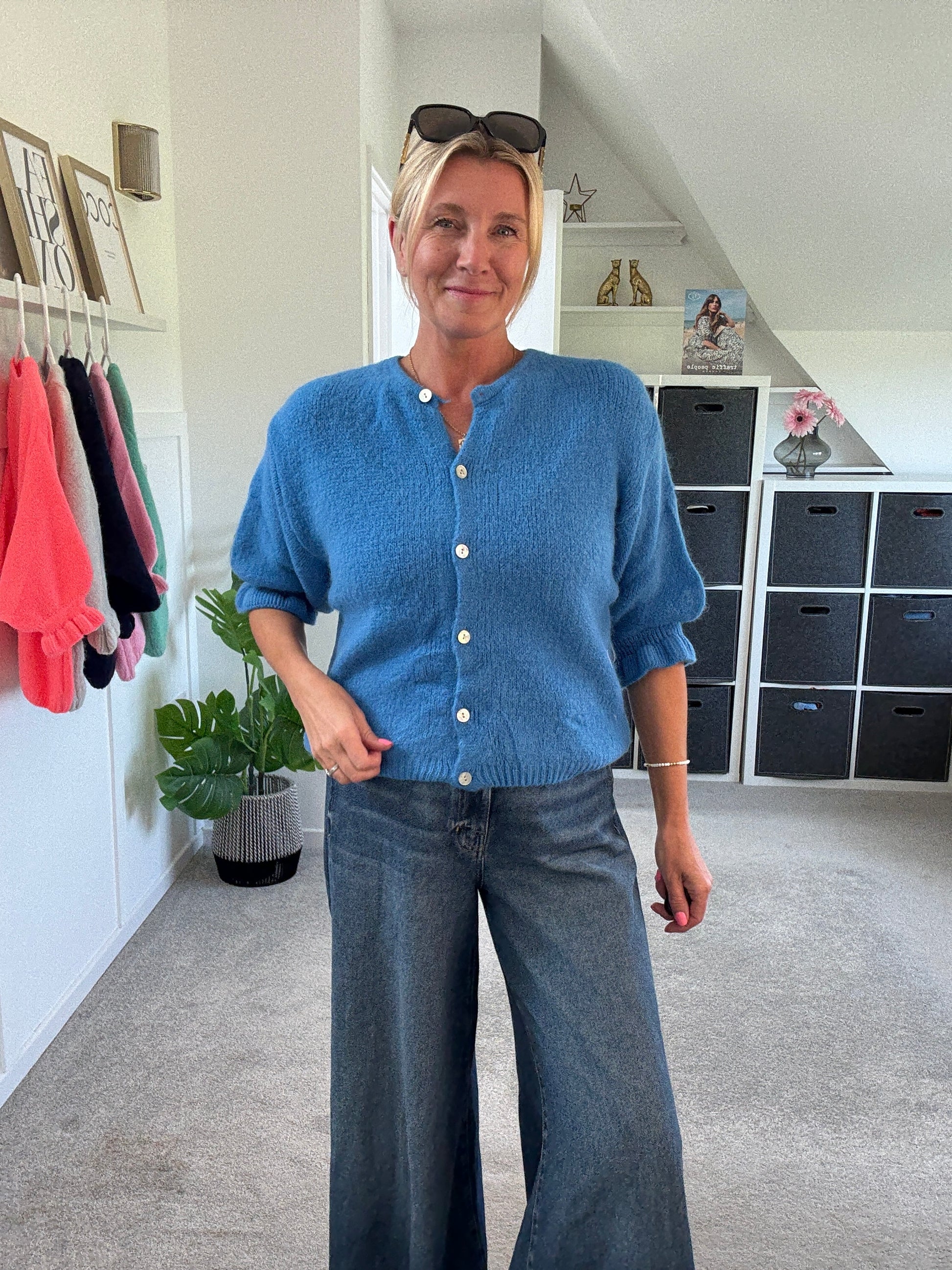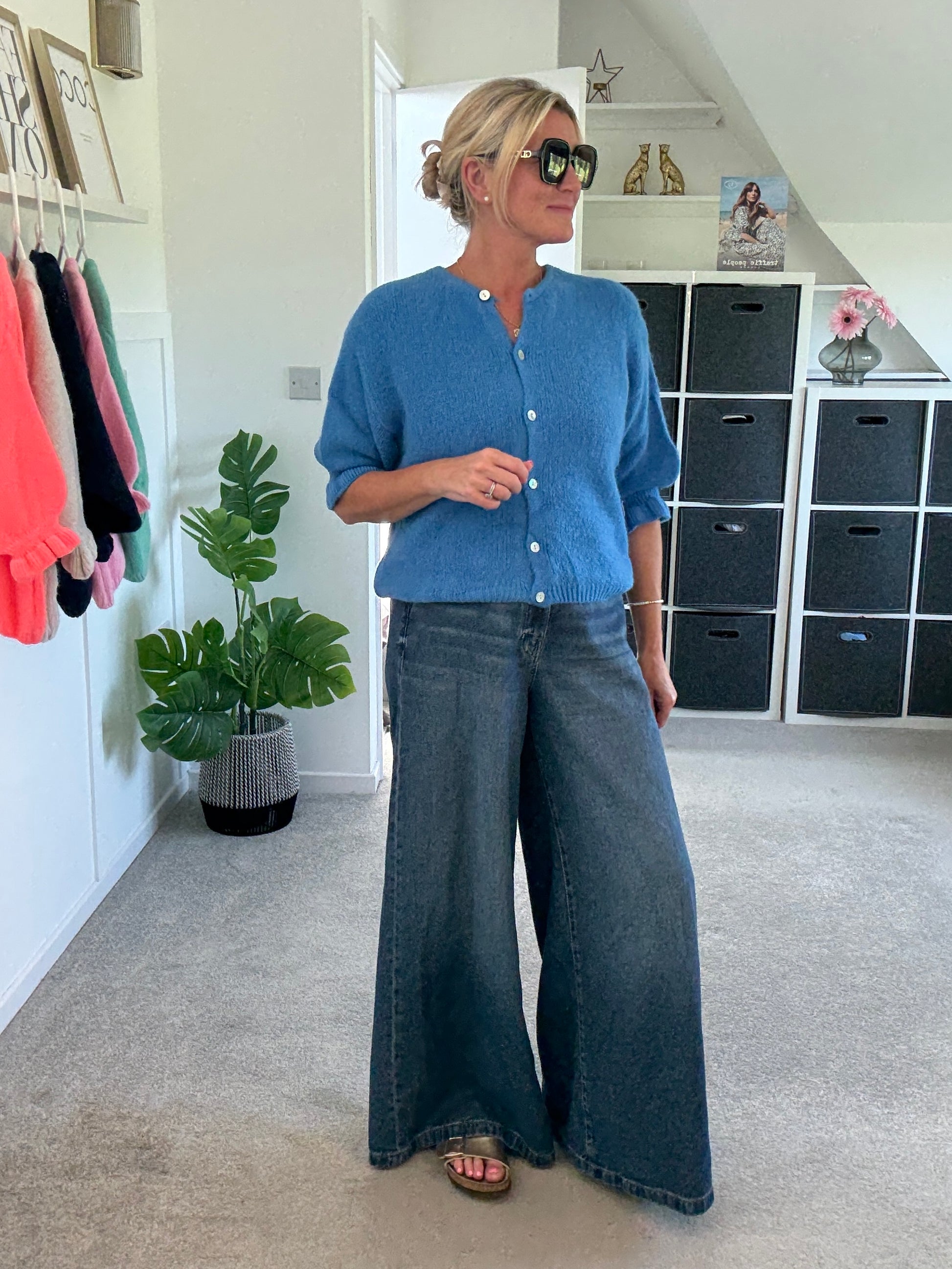 Super lovely alpaca mix fluffy frill sleeve cardigan. So cute with the frill sleeve detail on the sleeves. A regular one size fit and looks great style with the barrel leg jeans.