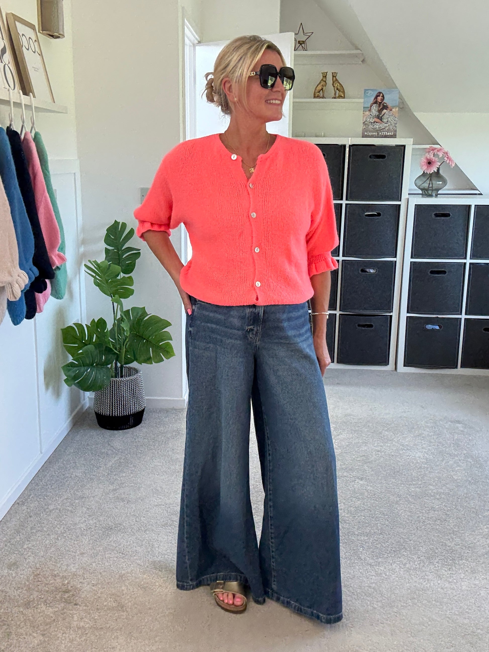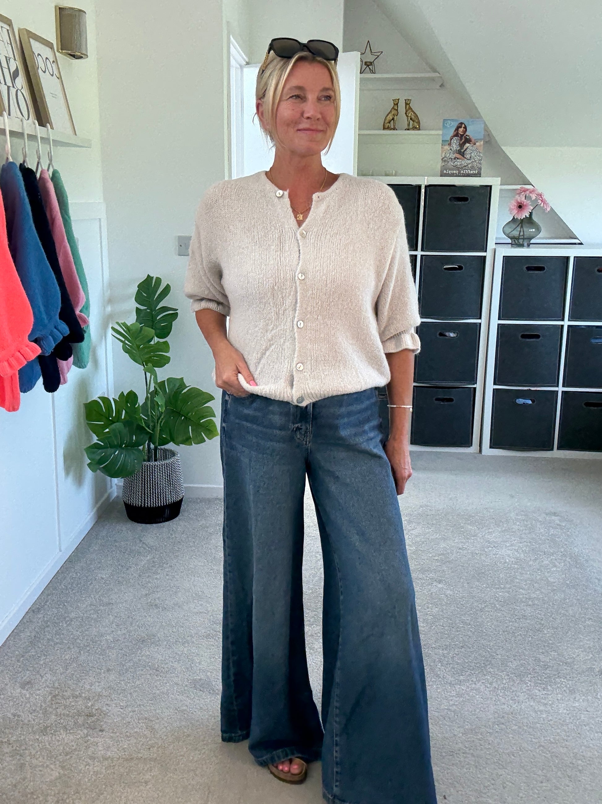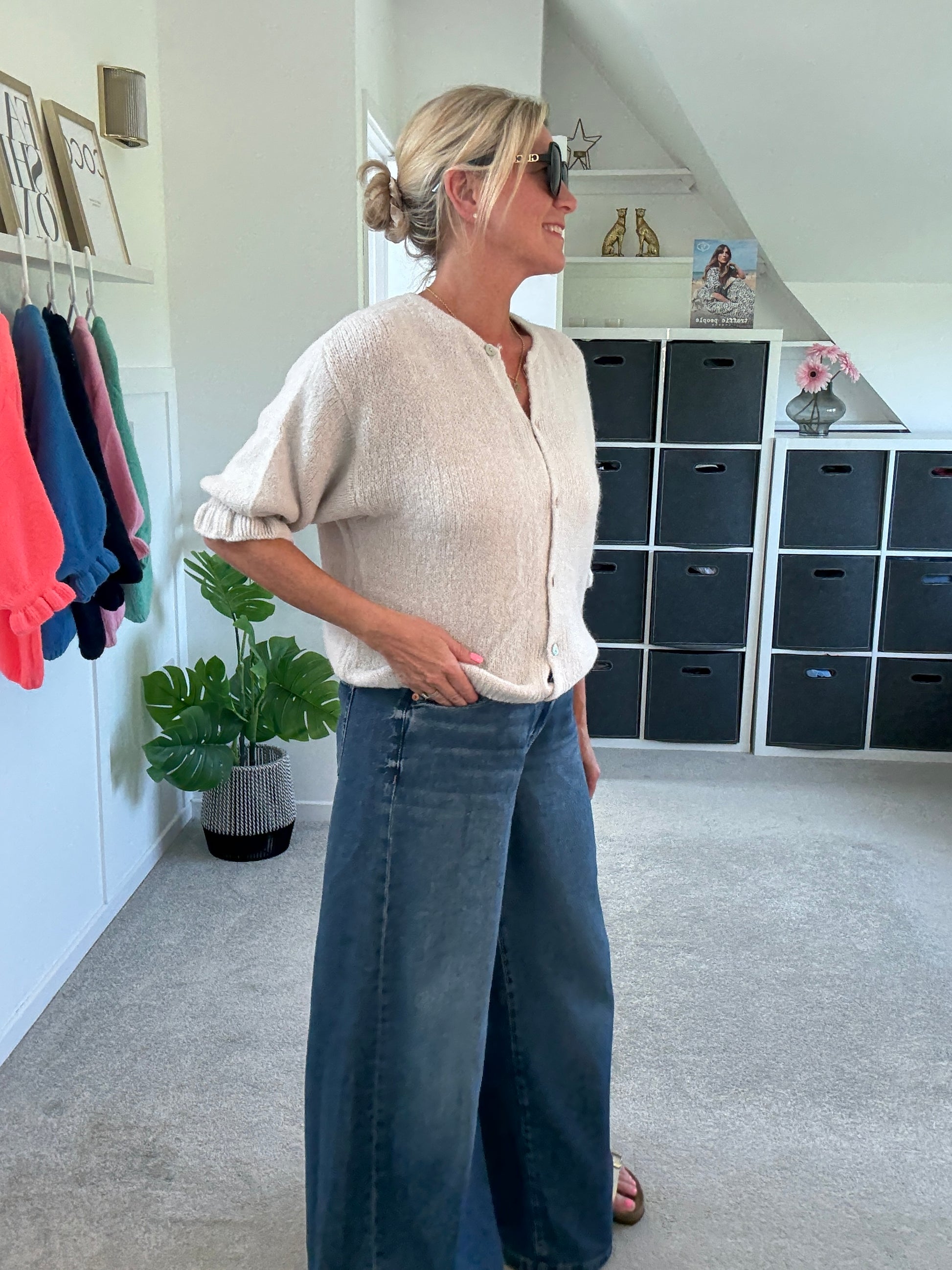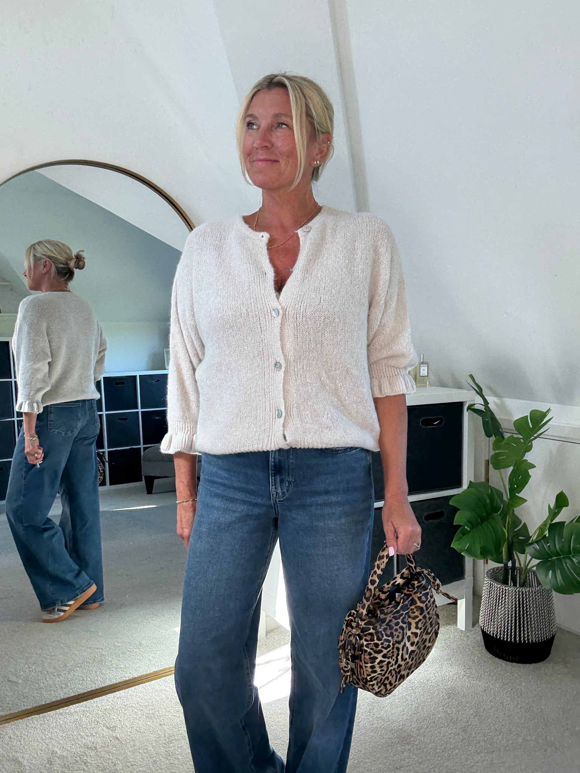 Super lovely alpaca mix fluffy frill sleeve cardigan. So cute with the frill sleeve detail on the sleeves. A regular one size fit and looks great style with the barrel leg jeans.
