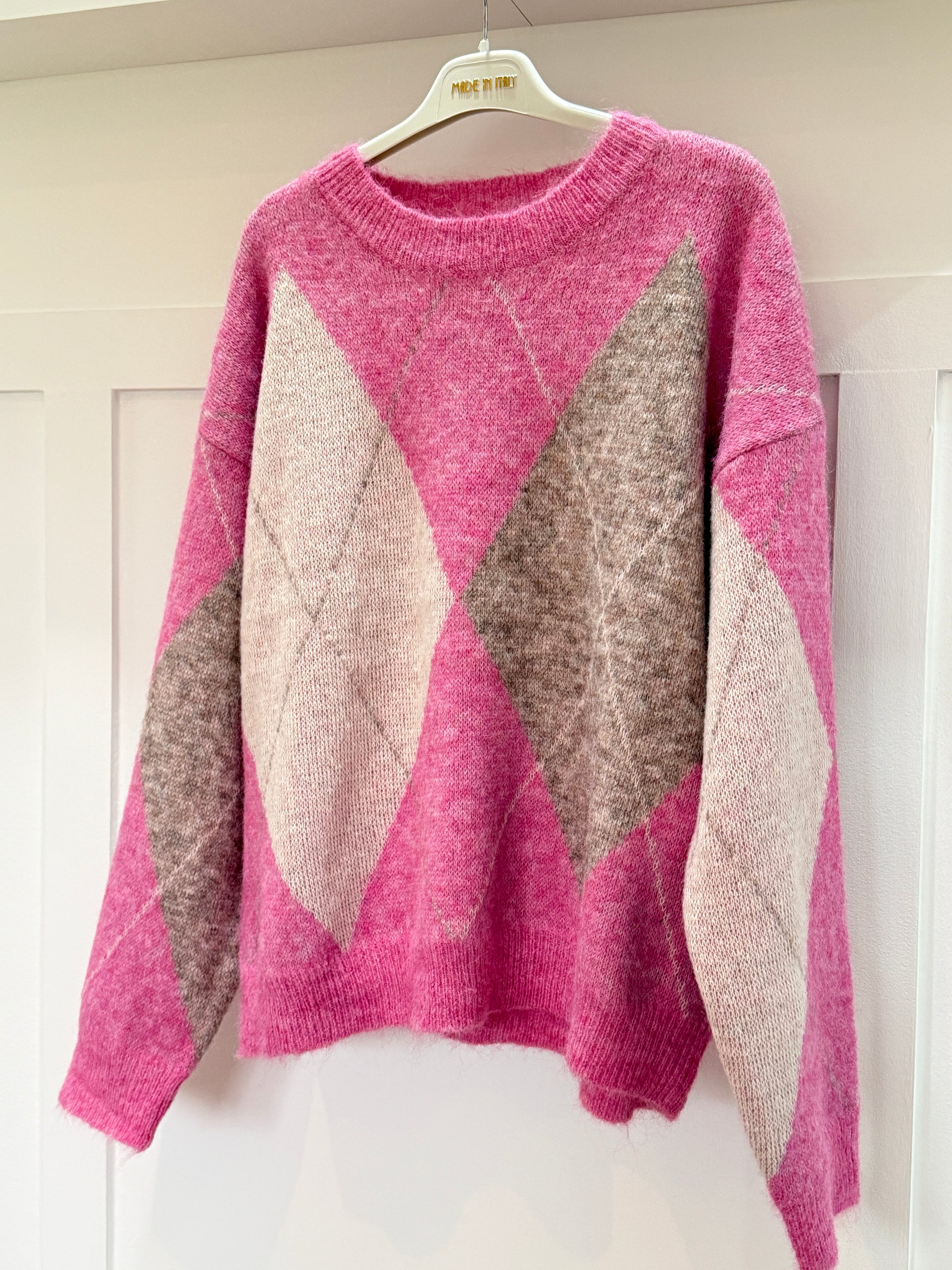 In shades of pink, cream, and mocha, this classic crew neck jumper brings a playful yet timeless edge to your cold-weather wardrobe. Made with a touch of stretch for comfort and a hint of wool for warmth.