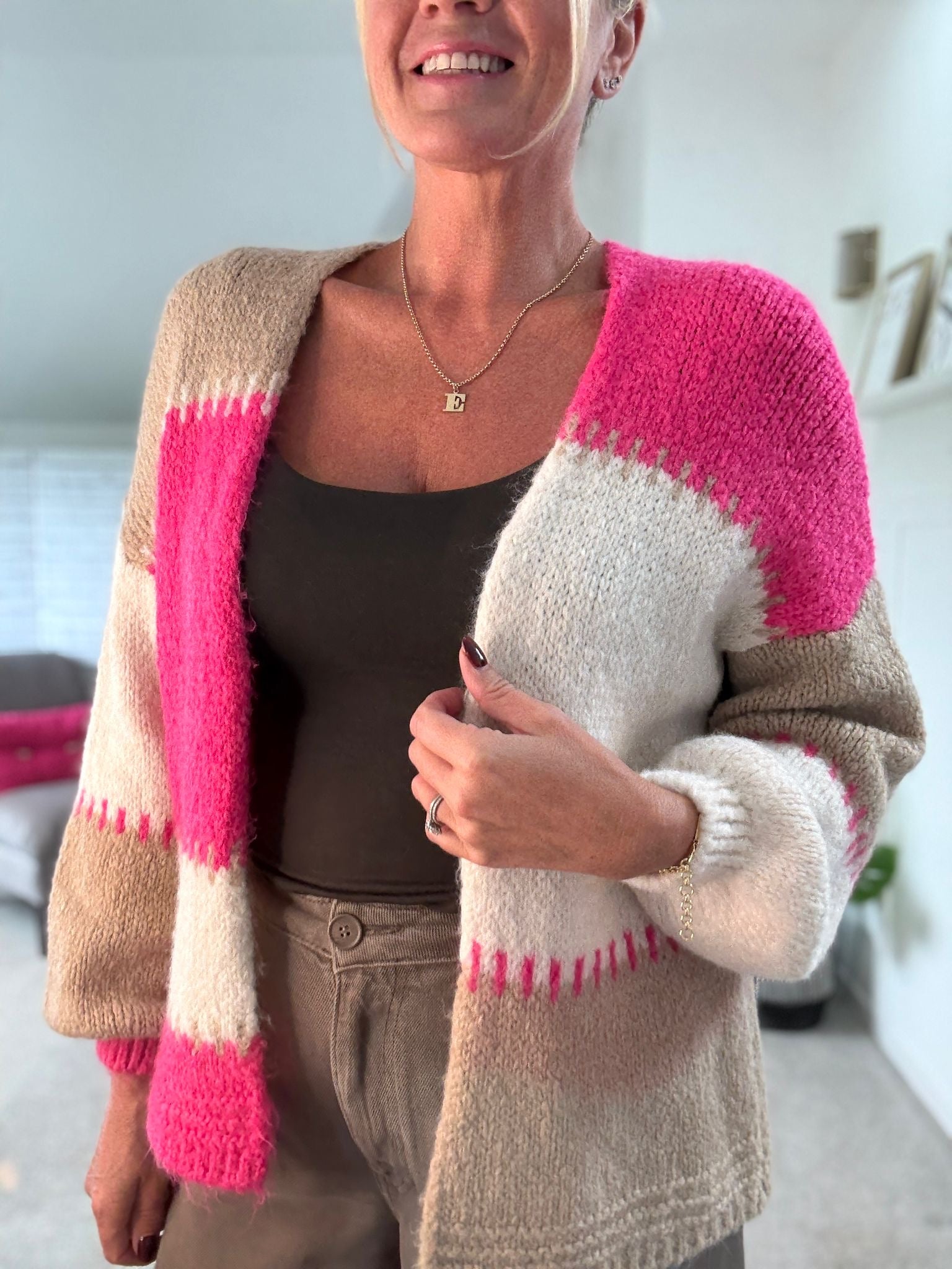 Pink/Mocha Patchwork Contrast Stitch Cosy Cardigan