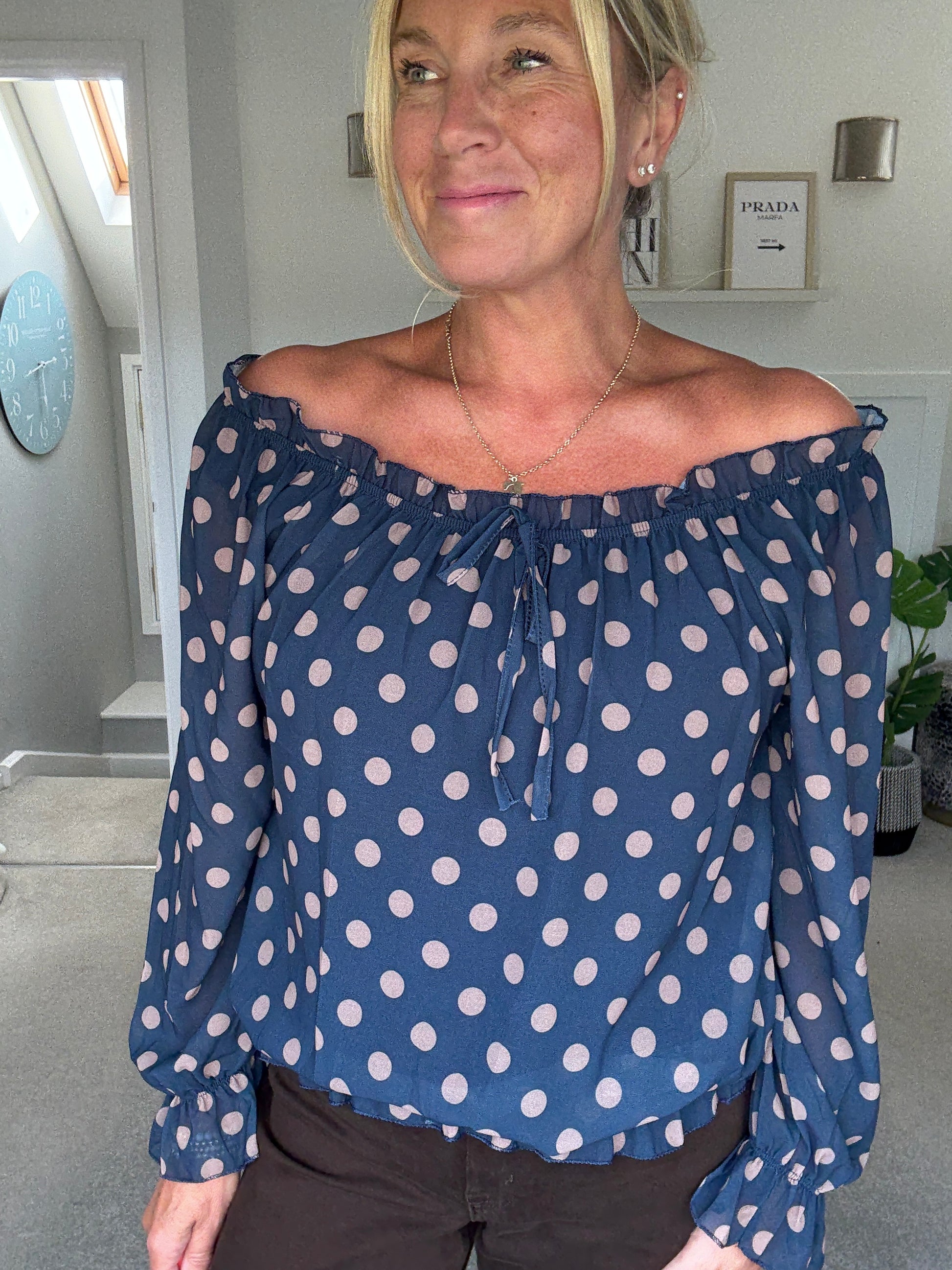 On trend polka dot blouse with ruffle elasticated stretch neckline which can be worn on or off the shoulder. Faux tie fastening and long sleeves with stretch ruffle cuffs and stretch hem. Perfect to wear with jeans and heels for an evening out or with trousers for a smarter look.