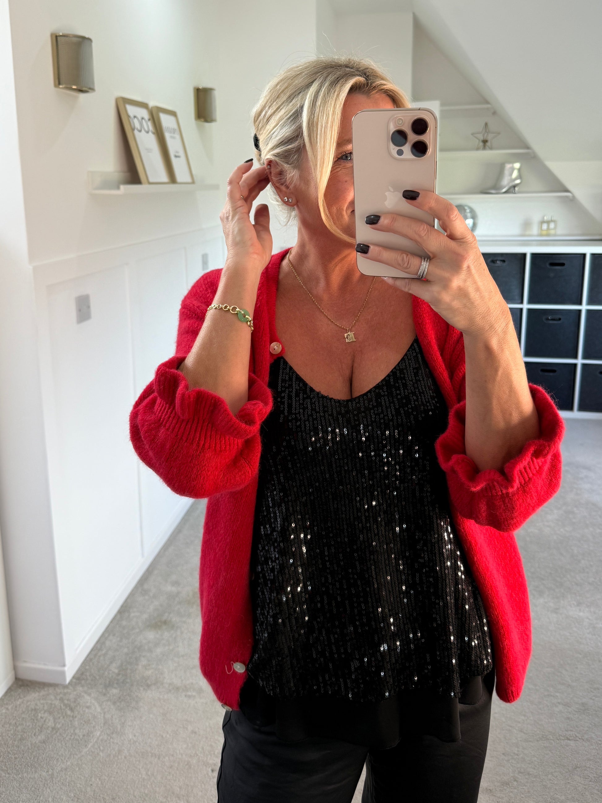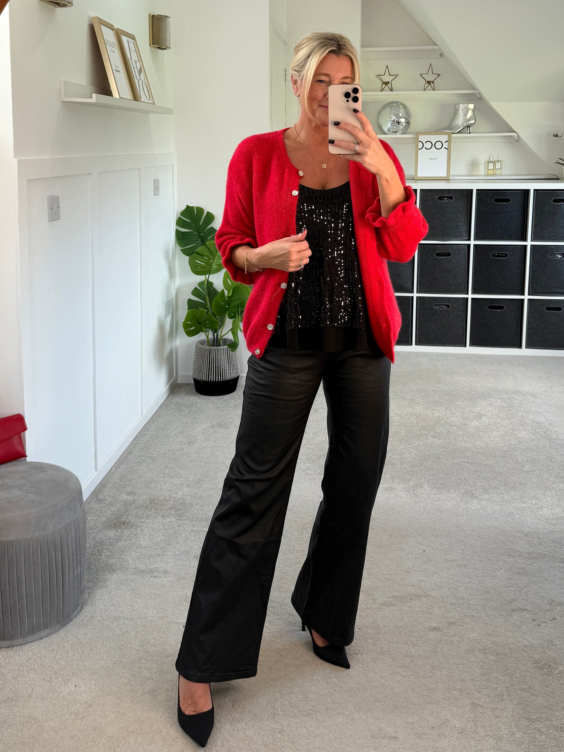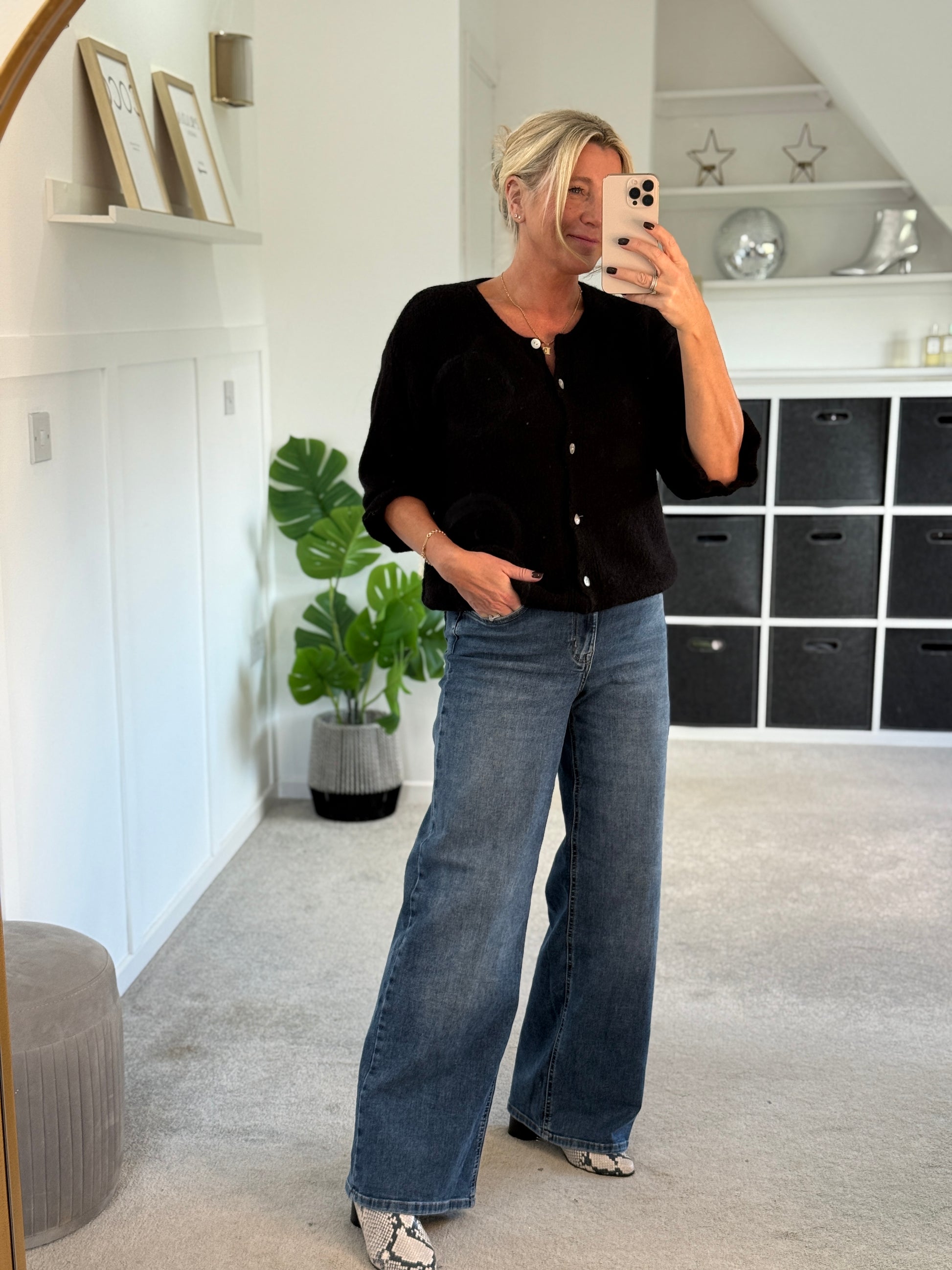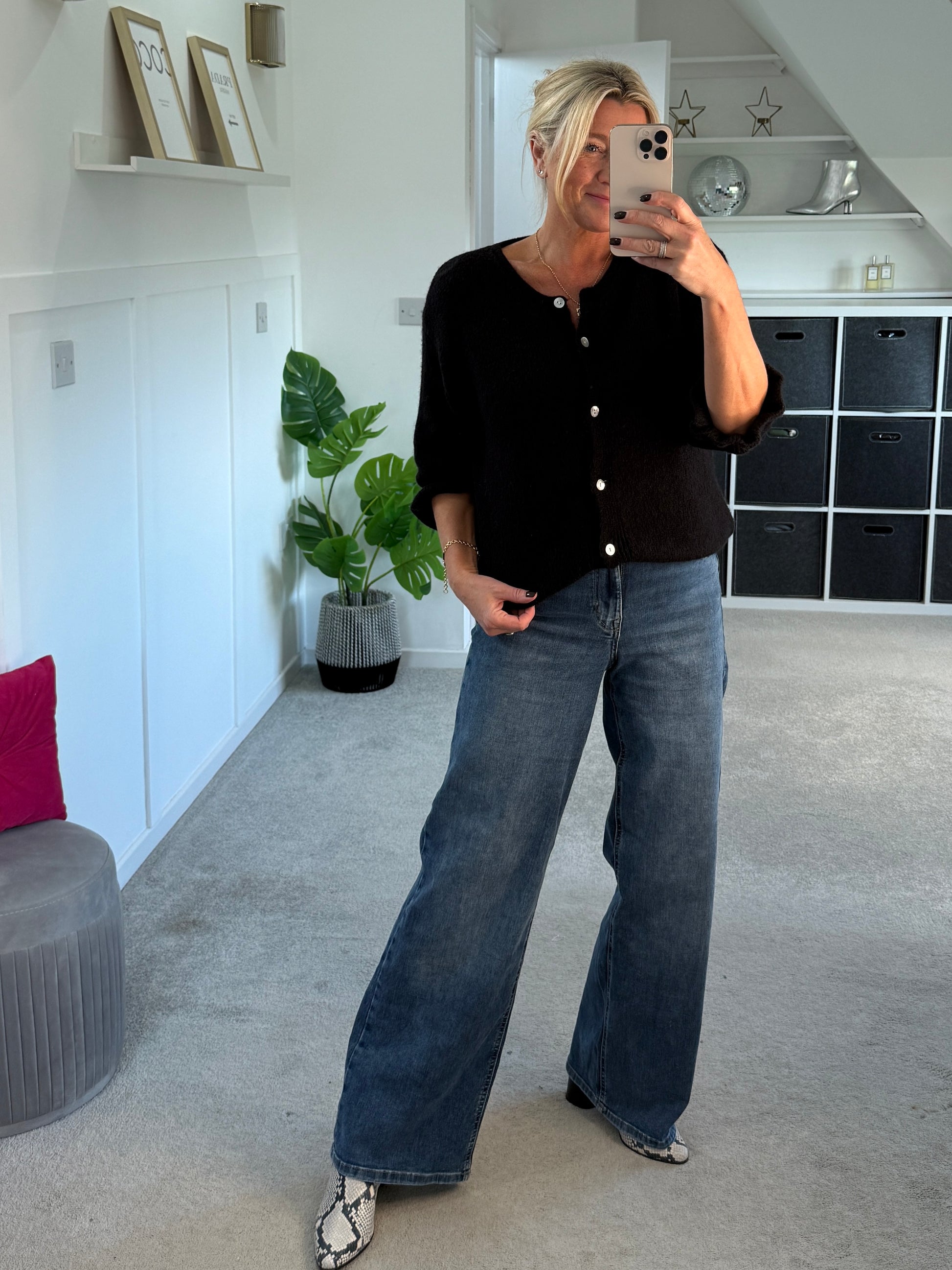 Super lovely alpaca mix fluffy frill sleeve cardigan. So cute with the frill sleeve detail on the sleeves. A nice one size fit and looks great style with the new barrel leg jeans. Such a gorgeous colour.