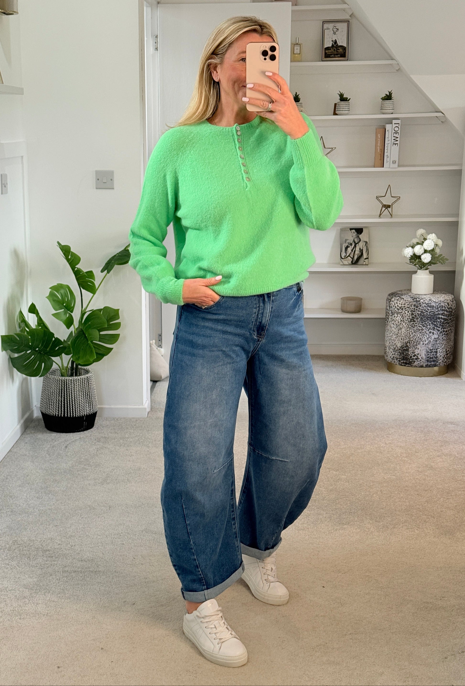 Gorgeous New Spring Green Alpaca Mix fluffy jumper with lovely button detailing (these can be undone), available in 5 colours. A nice one size fit and a nice weight going into Spring. Super easy to wear casually over jeans. So cosy and soft.