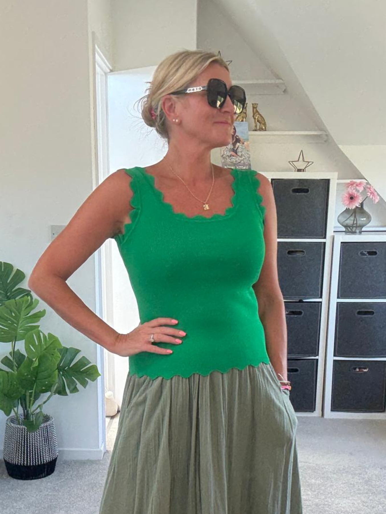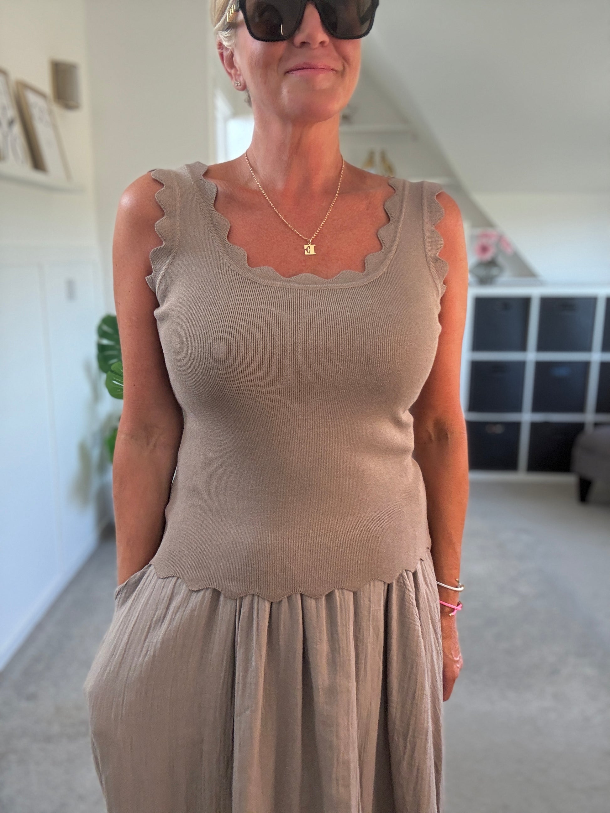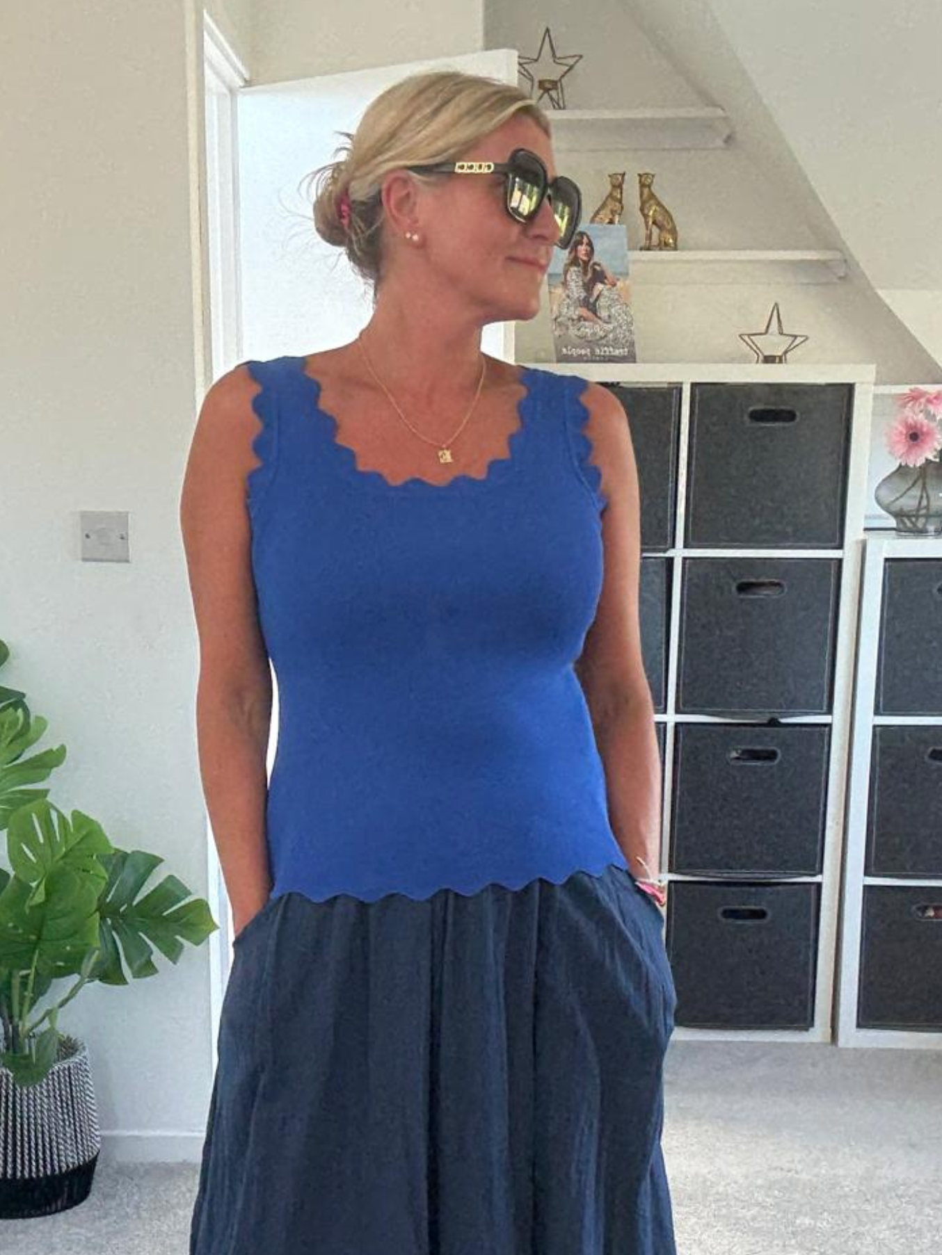 A wardrobe staple with a twist. This knitted vest top features delicate scallop edging along the neckline and hem. The soft stretch knit hugs the body for a flattering, comfortable fit. A perfect top for mixing and matching with maxi skirts and floaty trousers.