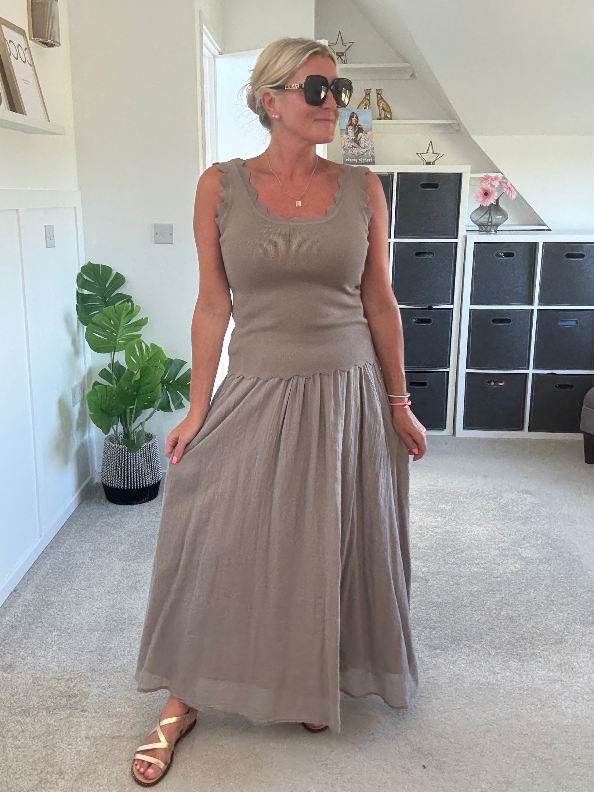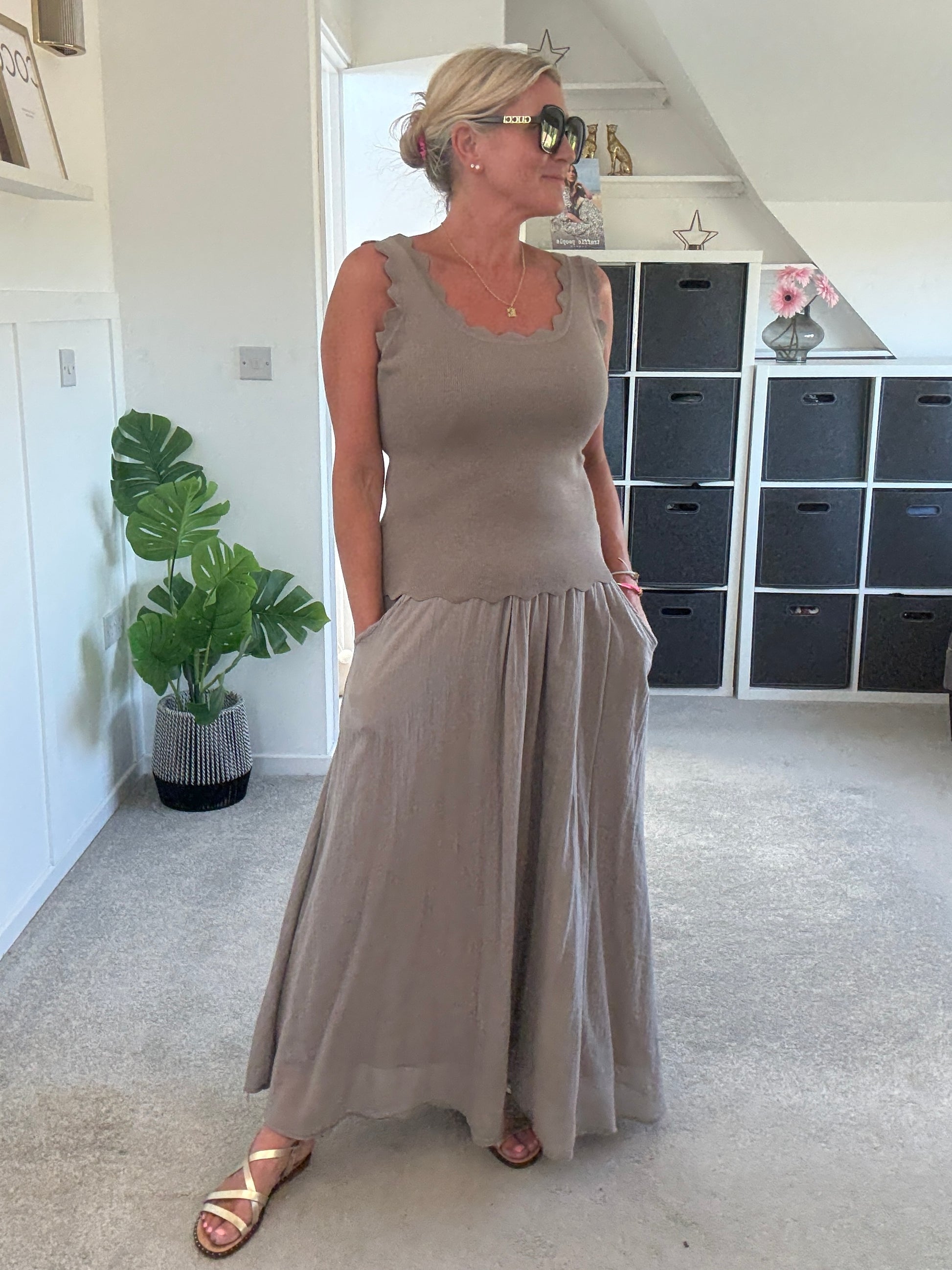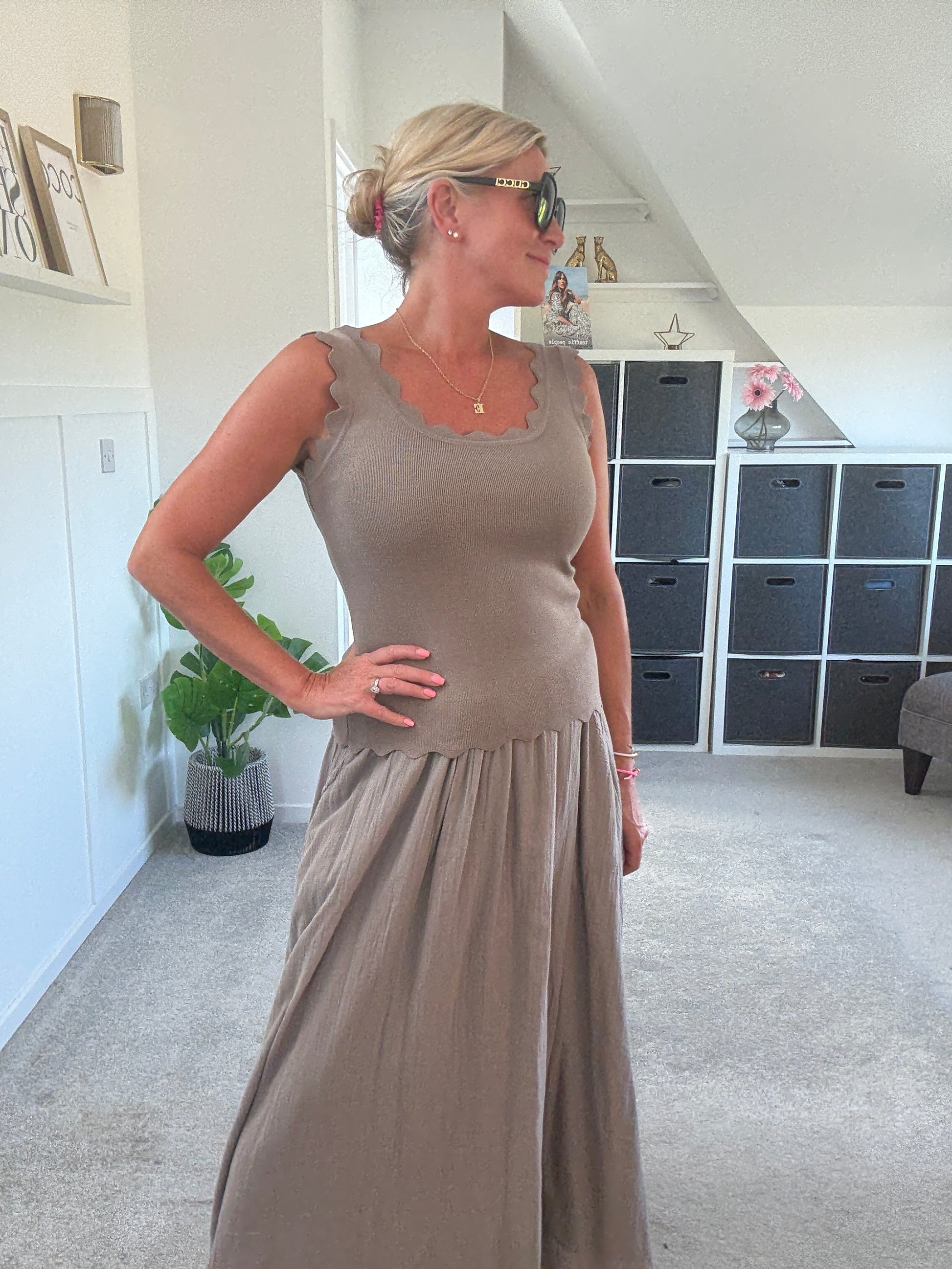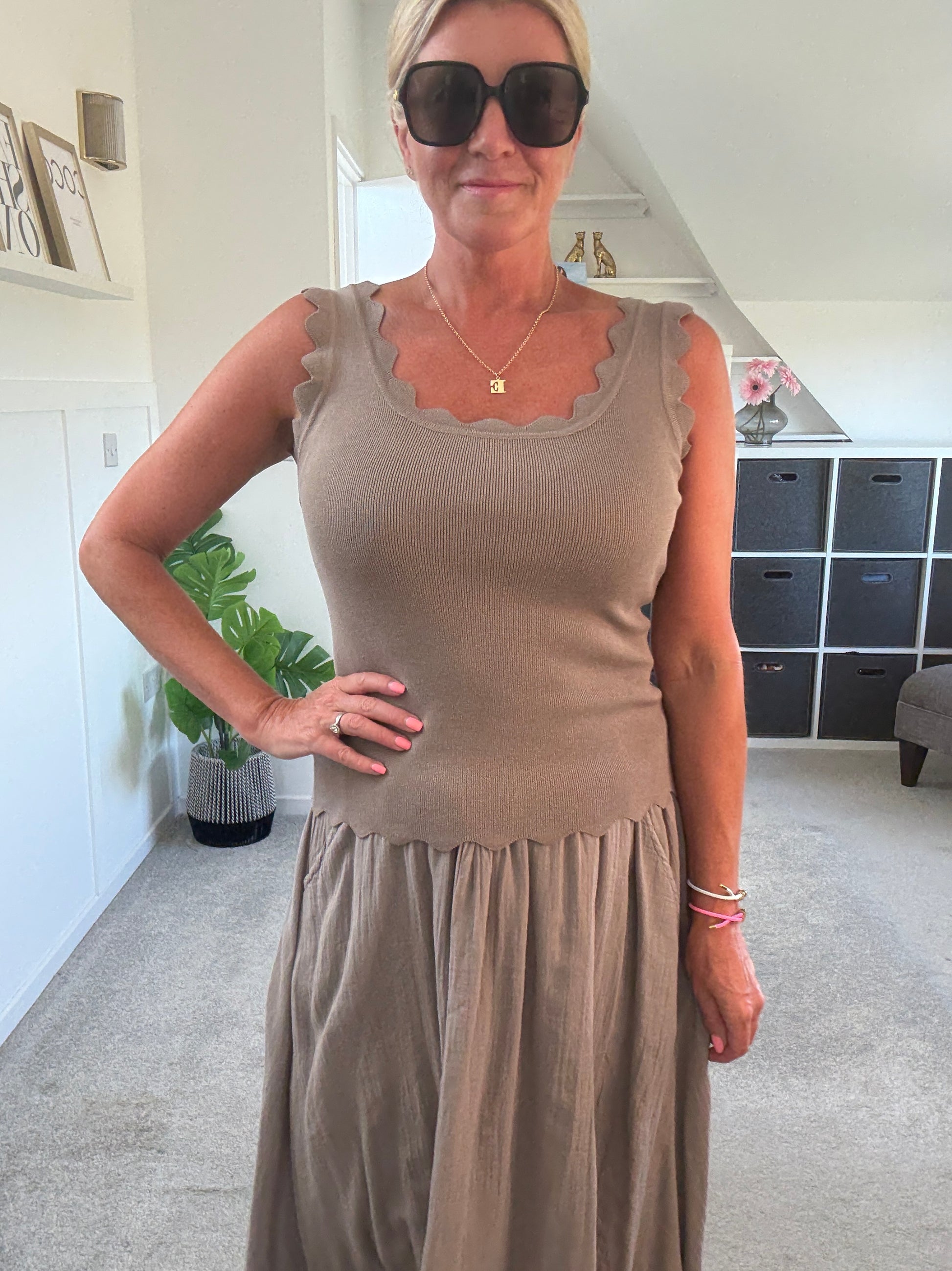 A wardrobe staple with a twist. This knitted vest top features delicate scallop edging along the neckline and hem. The soft stretch knit hugs the body for a flattering, comfortable fit. A perfect top for mixing and matching with maxi skirts and floaty trousers.