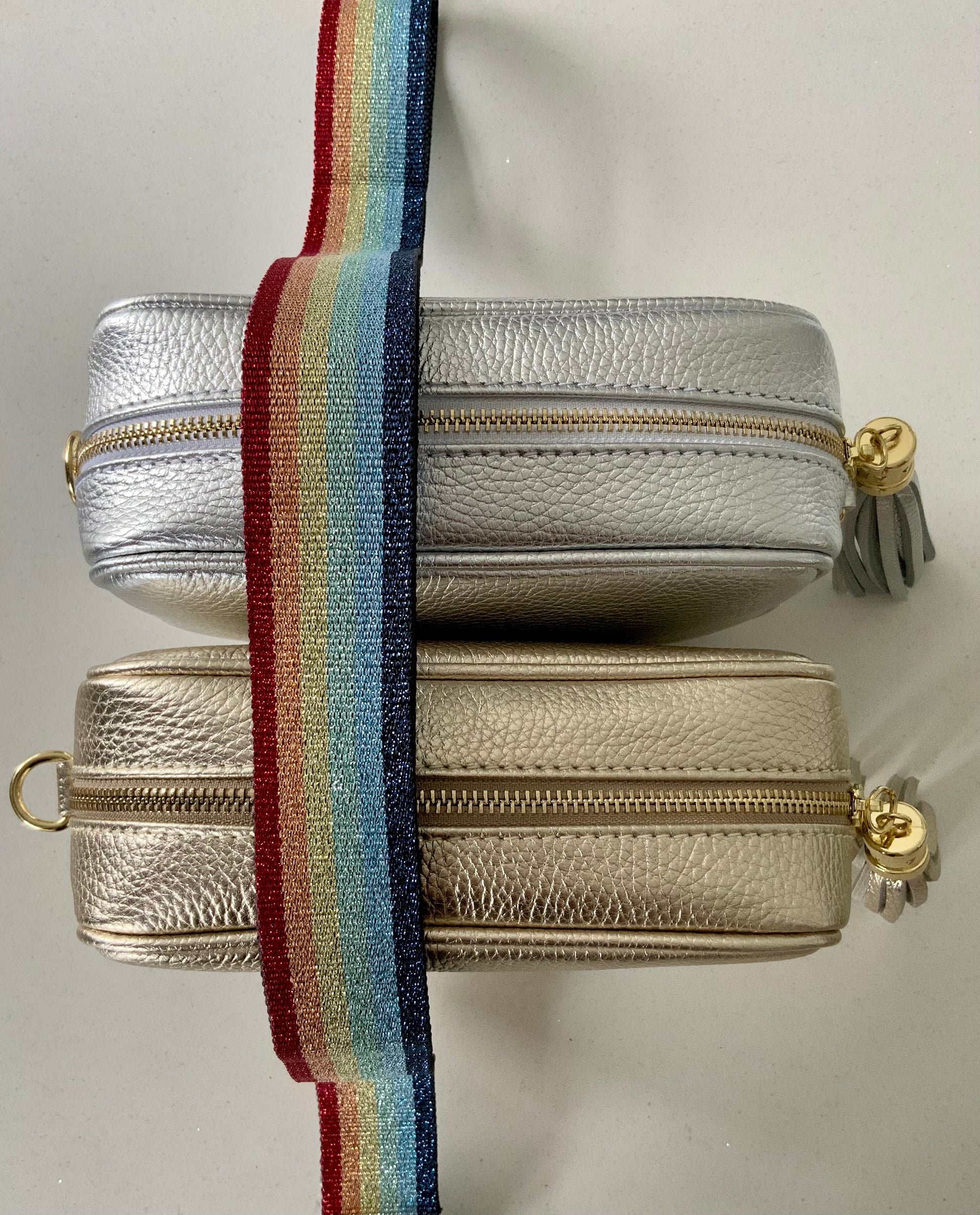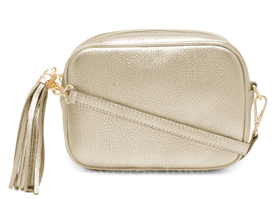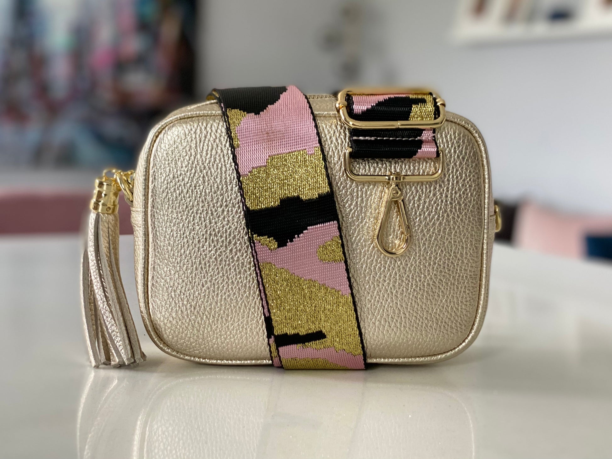 Fabulous real Italian Leather box bag with tassel in a gorgeous gold! The bag has a detachable, adjustable leather strap in the same colour as the bag or you can jazz it up with one of the statement bag straps!