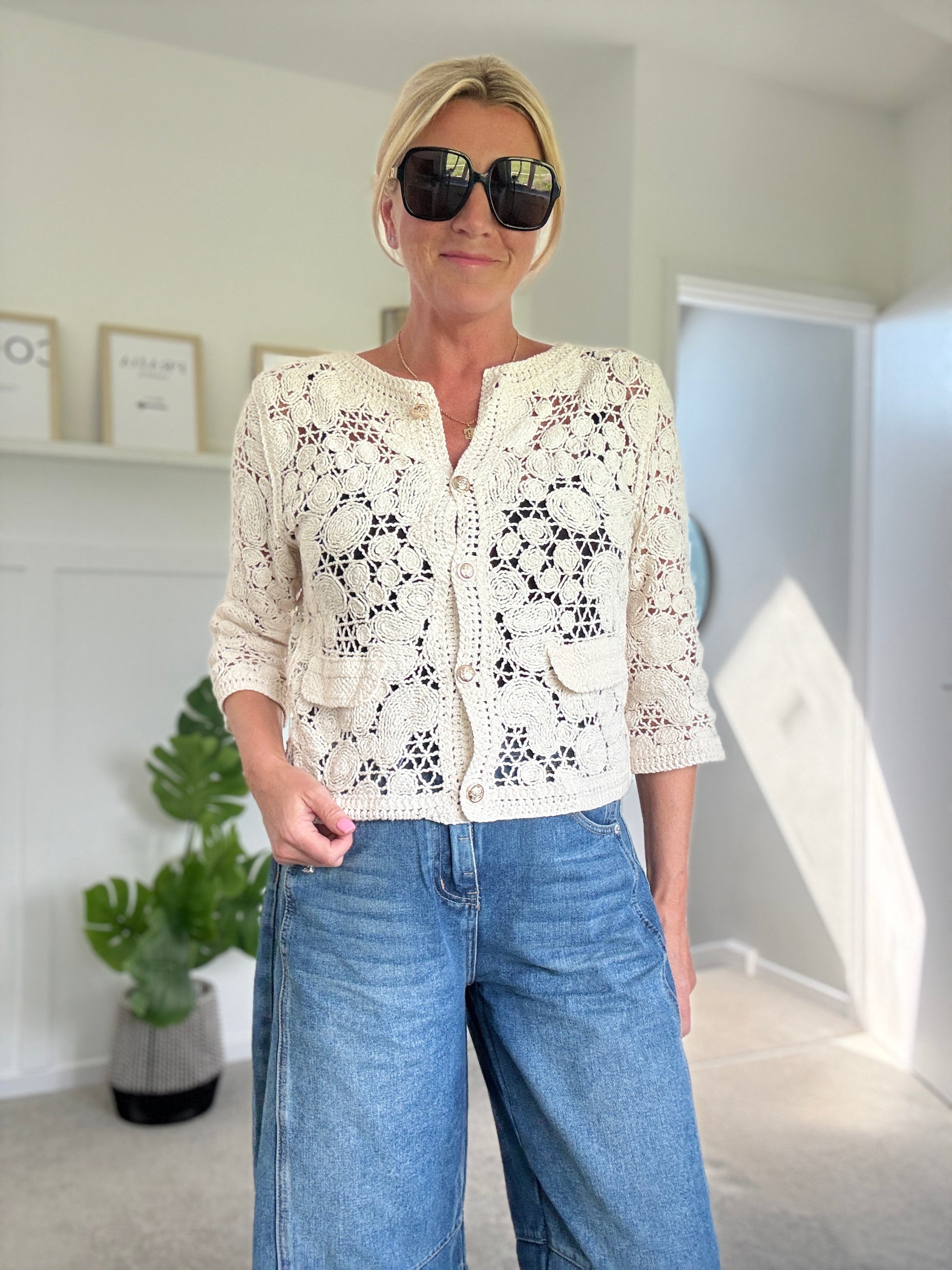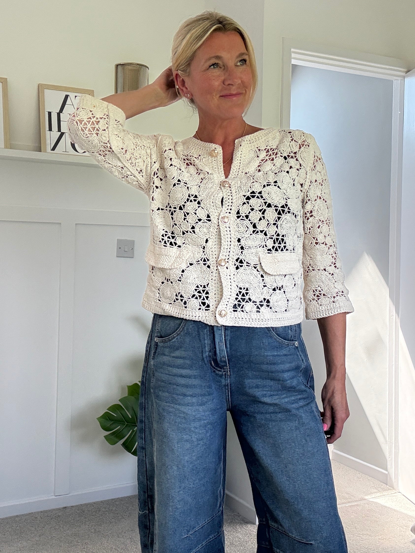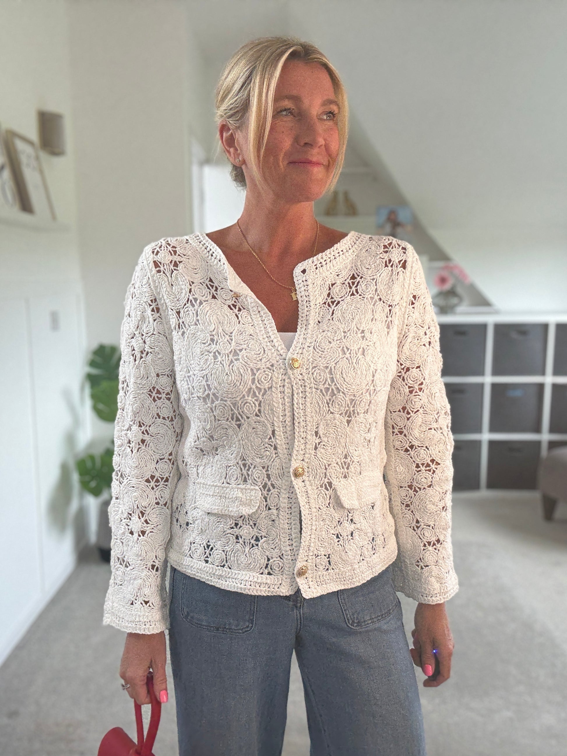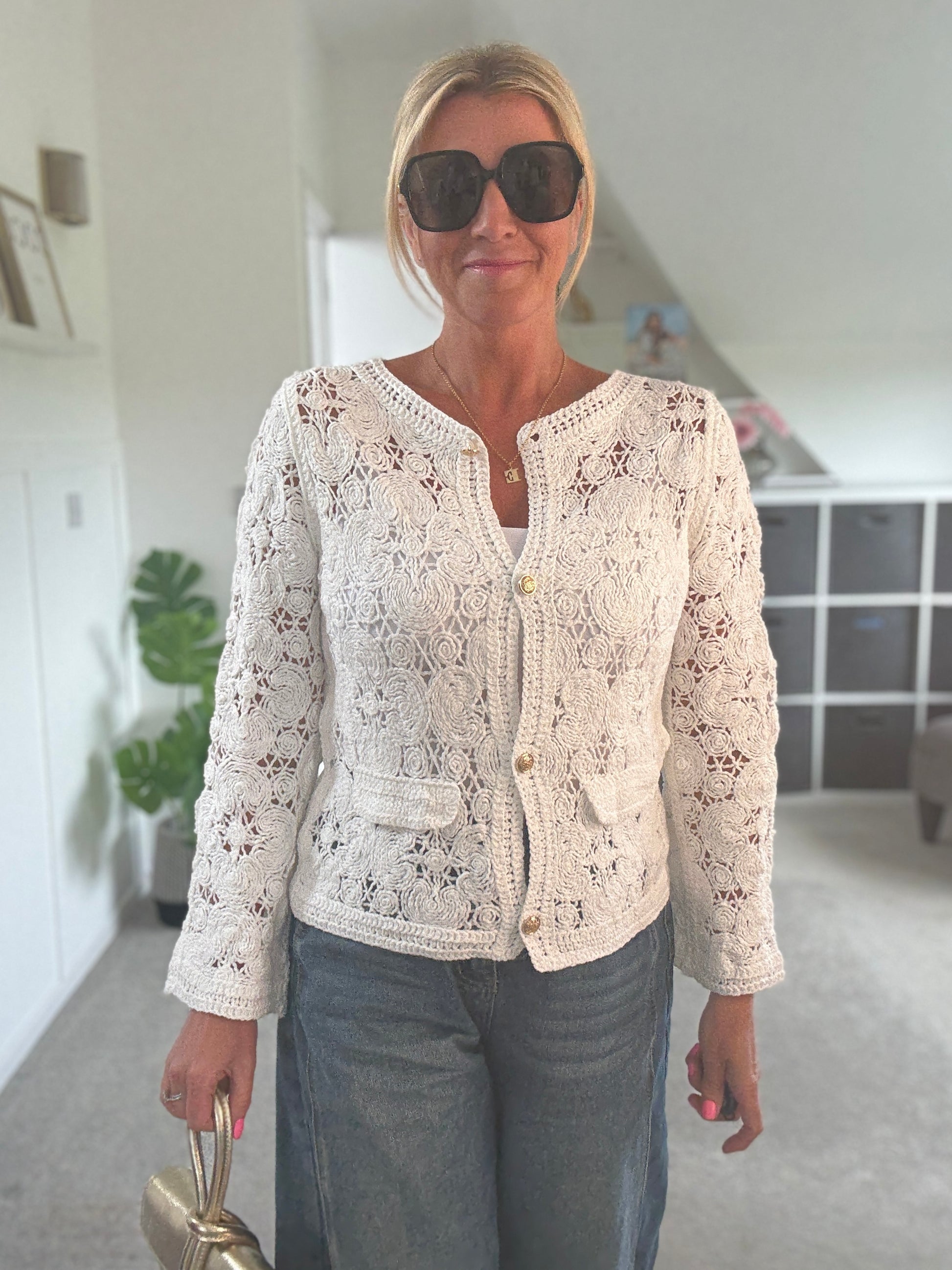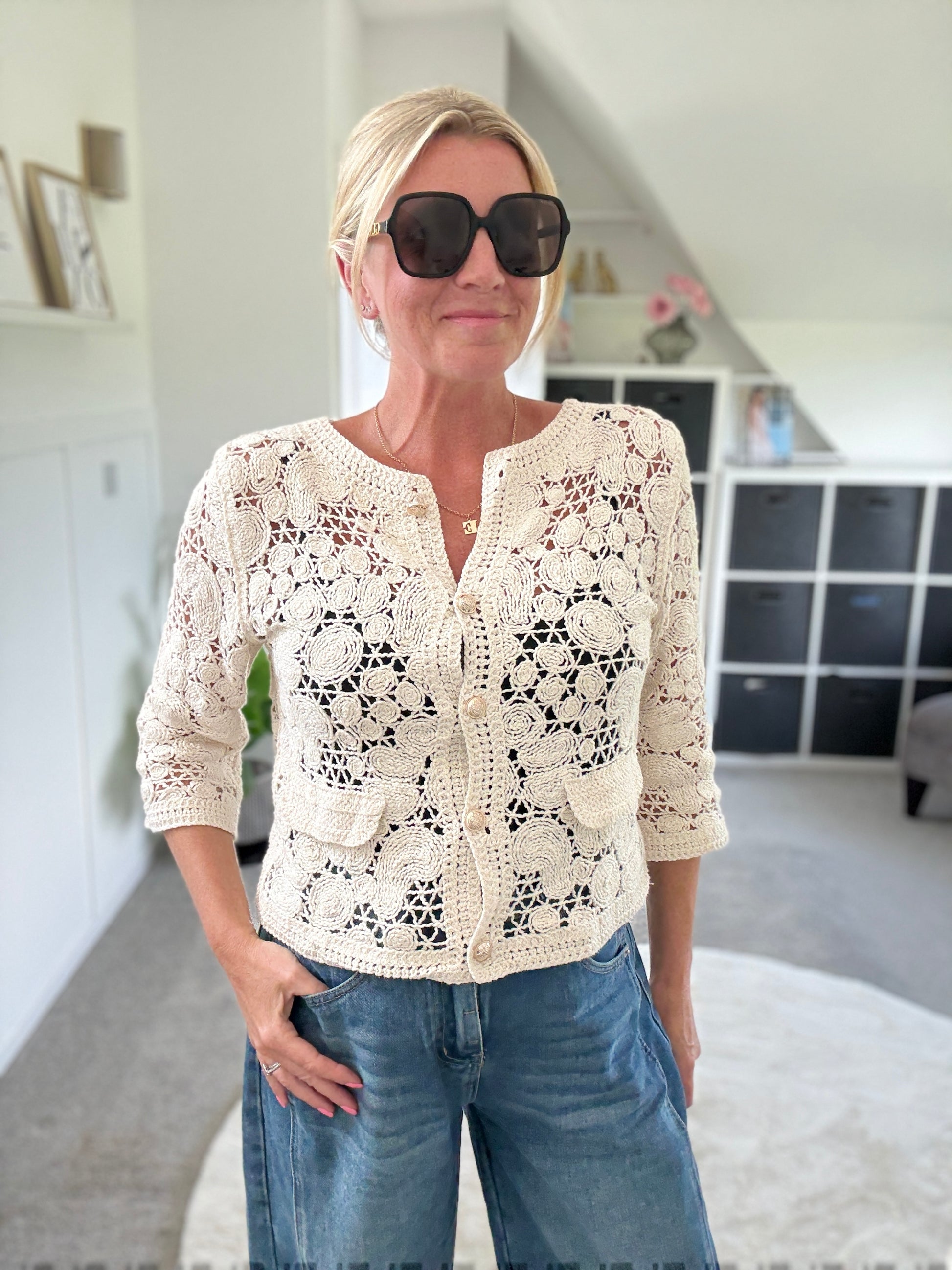 Super pretty crochet cardigan with gorgeous gold buttons and faux pocket detail. Wear with a co ordinating vest underneath and team with denim.