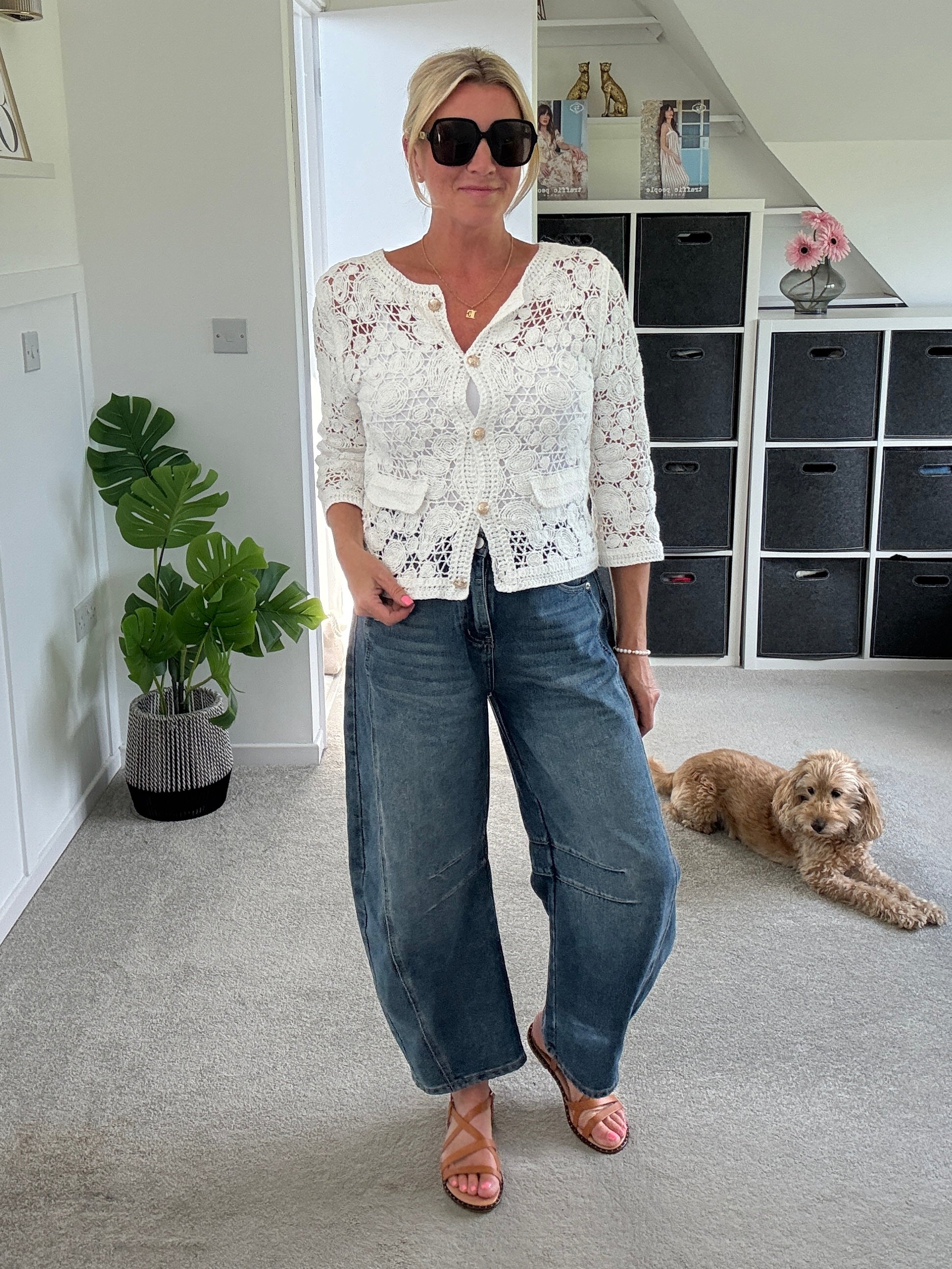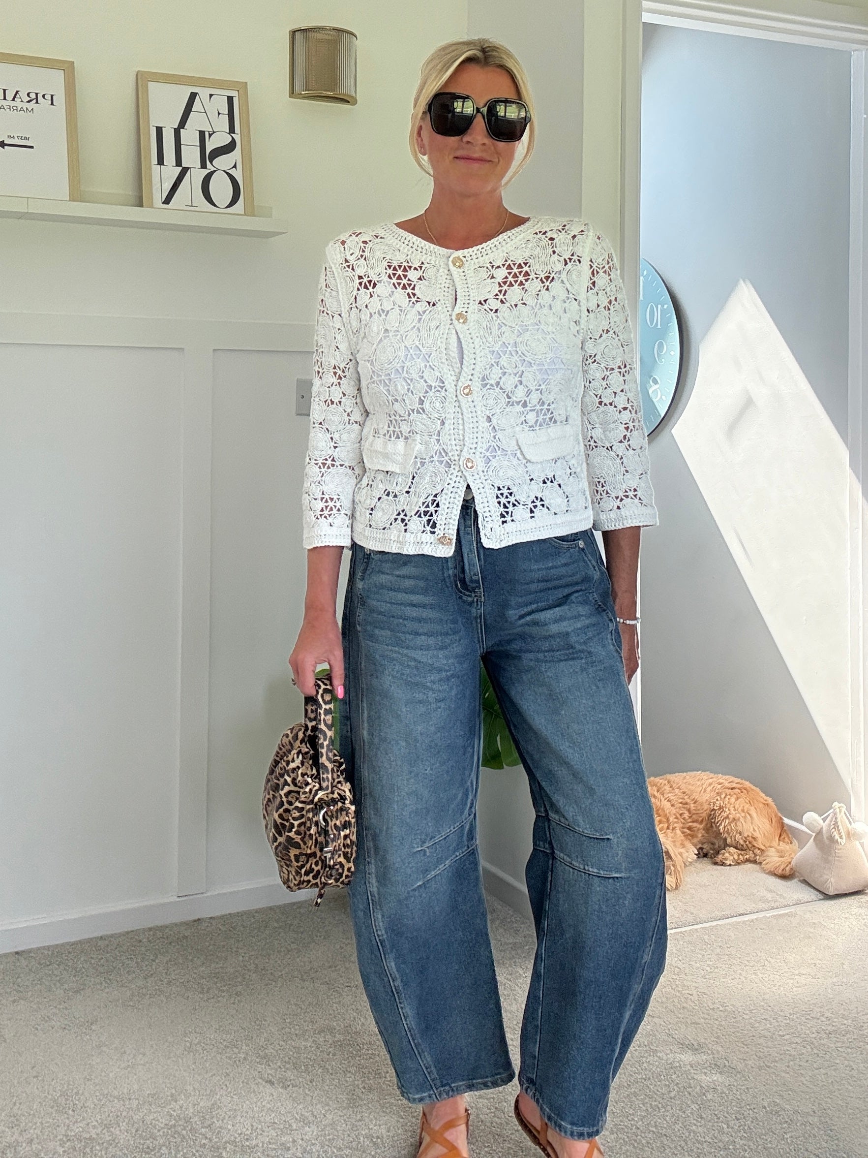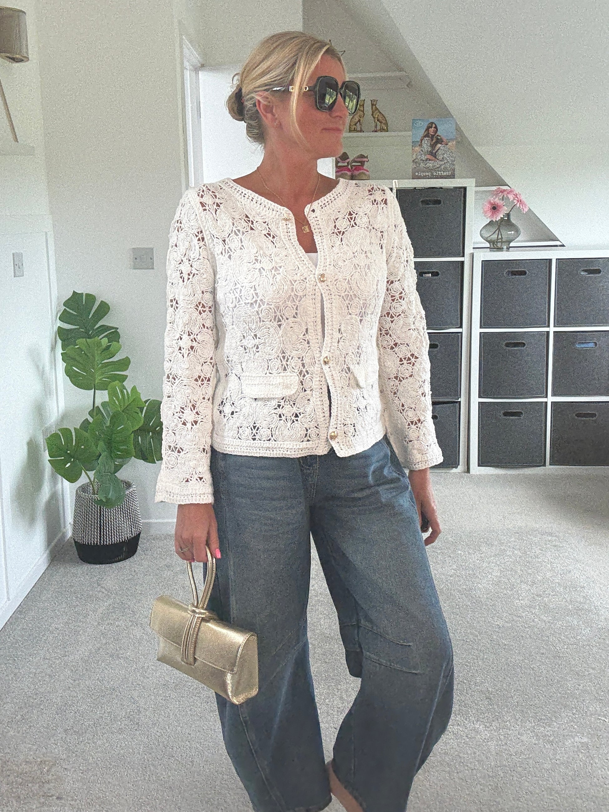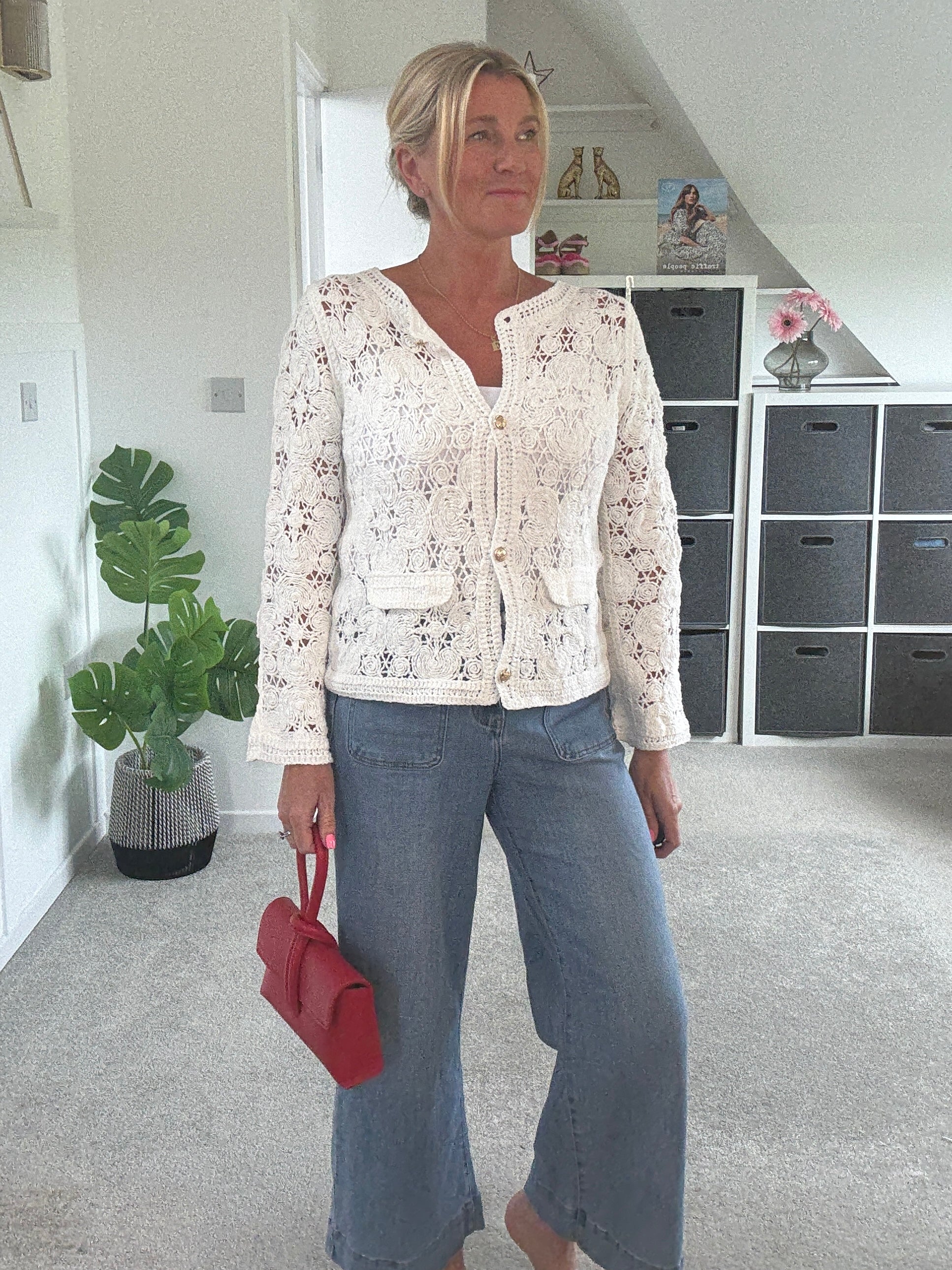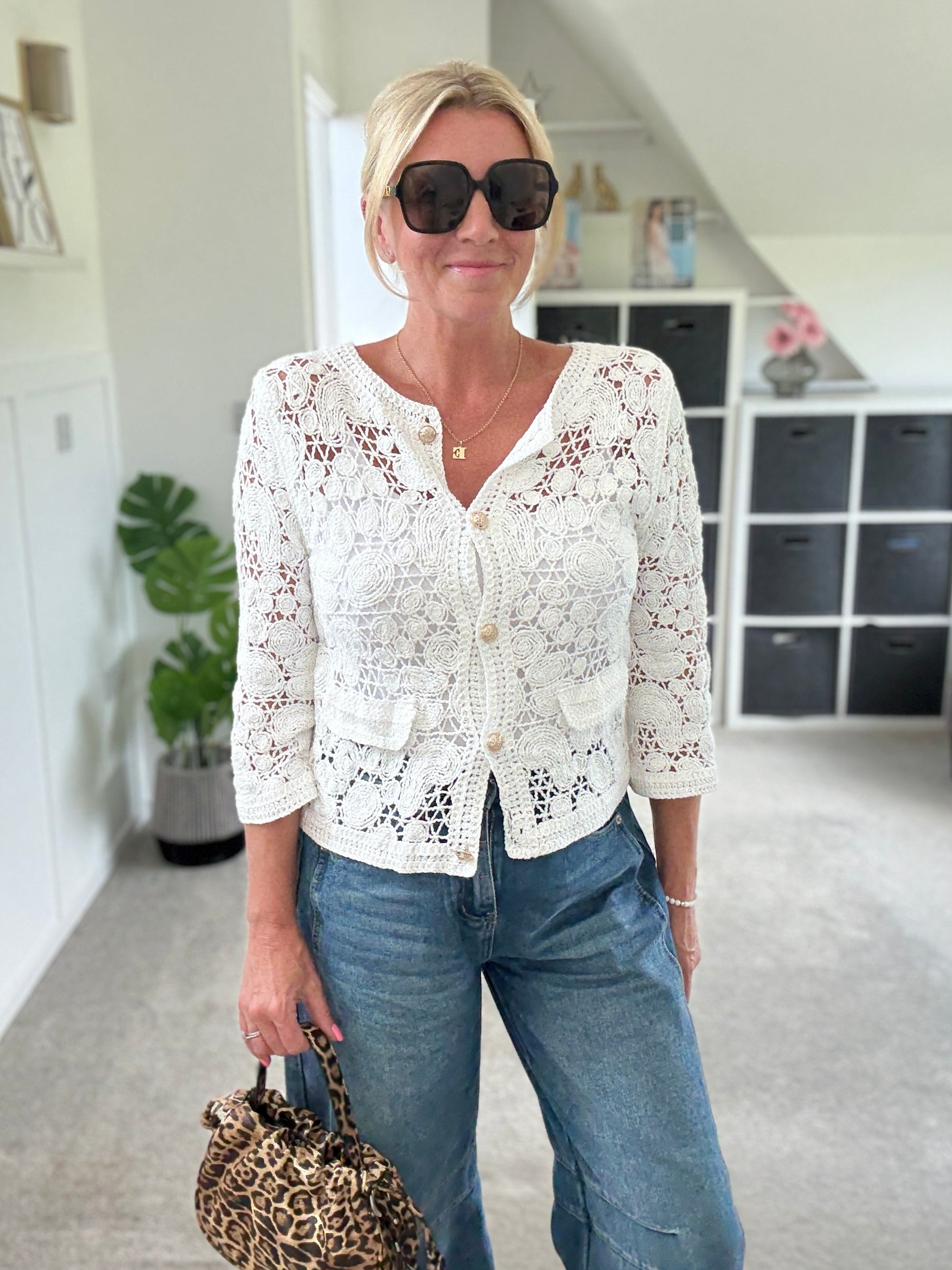 Super pretty crochet cardigan with gorgeous gold buttons and faux pocket detail. Wear with a co ordinating vest underneath and team with denim.