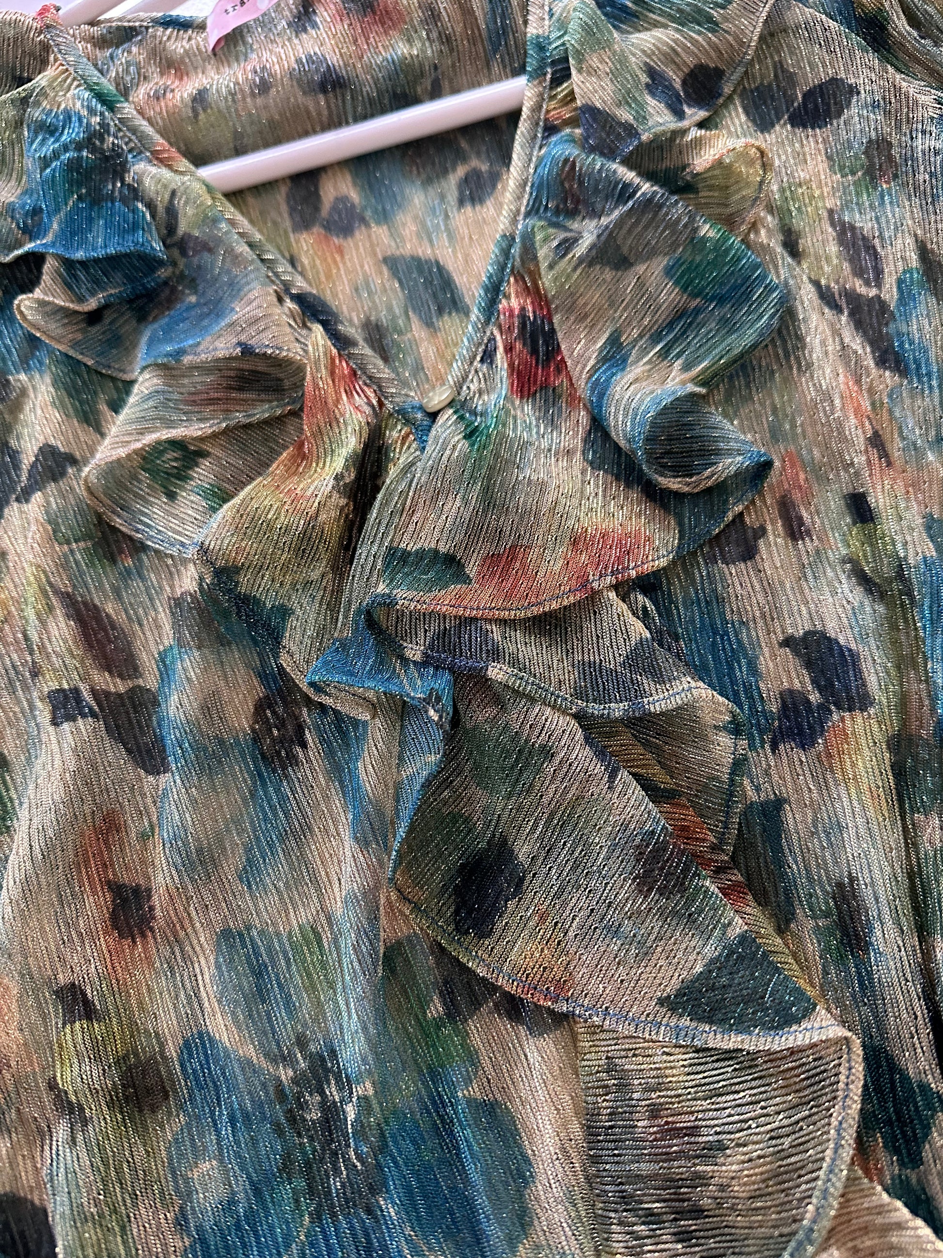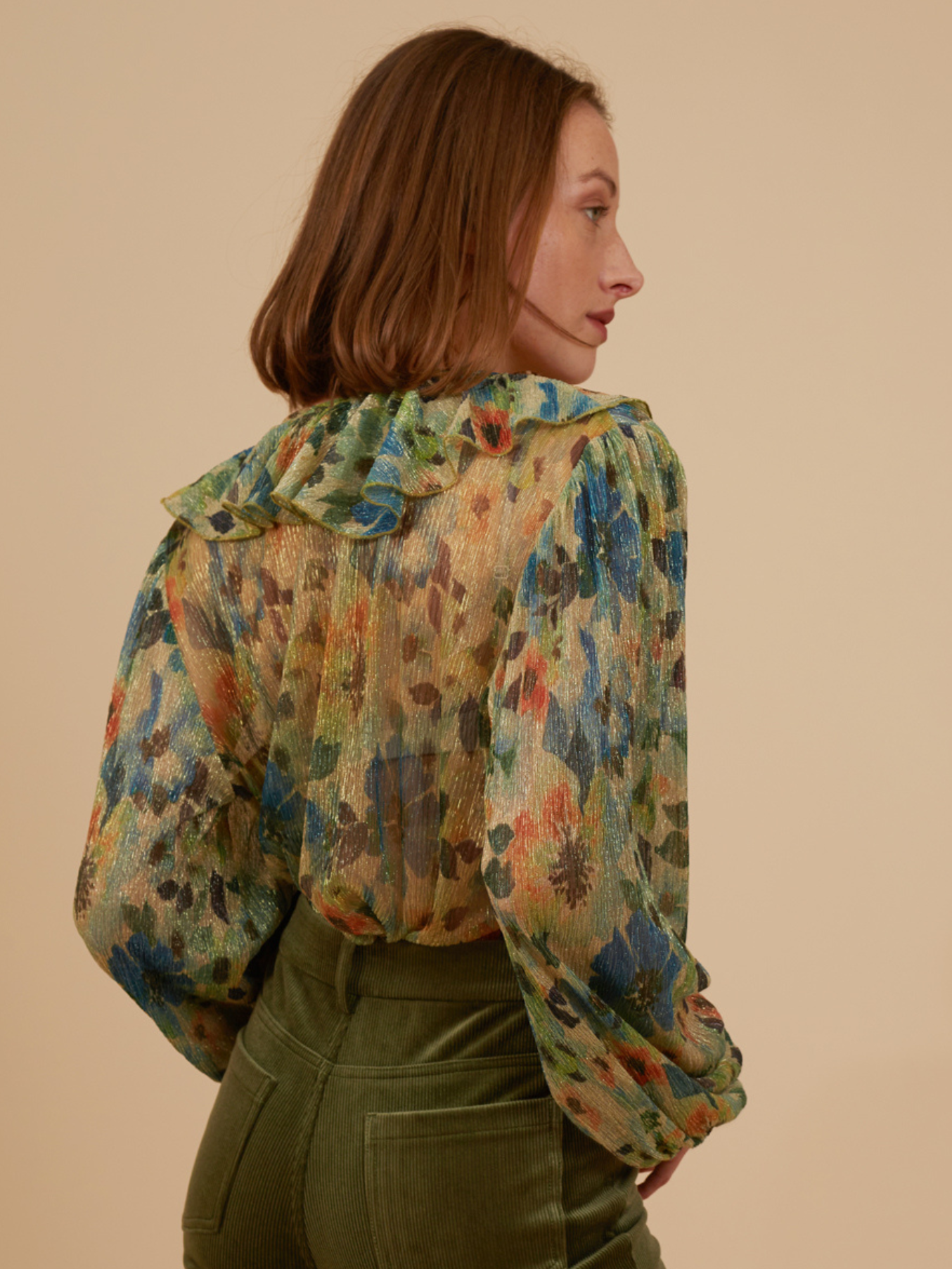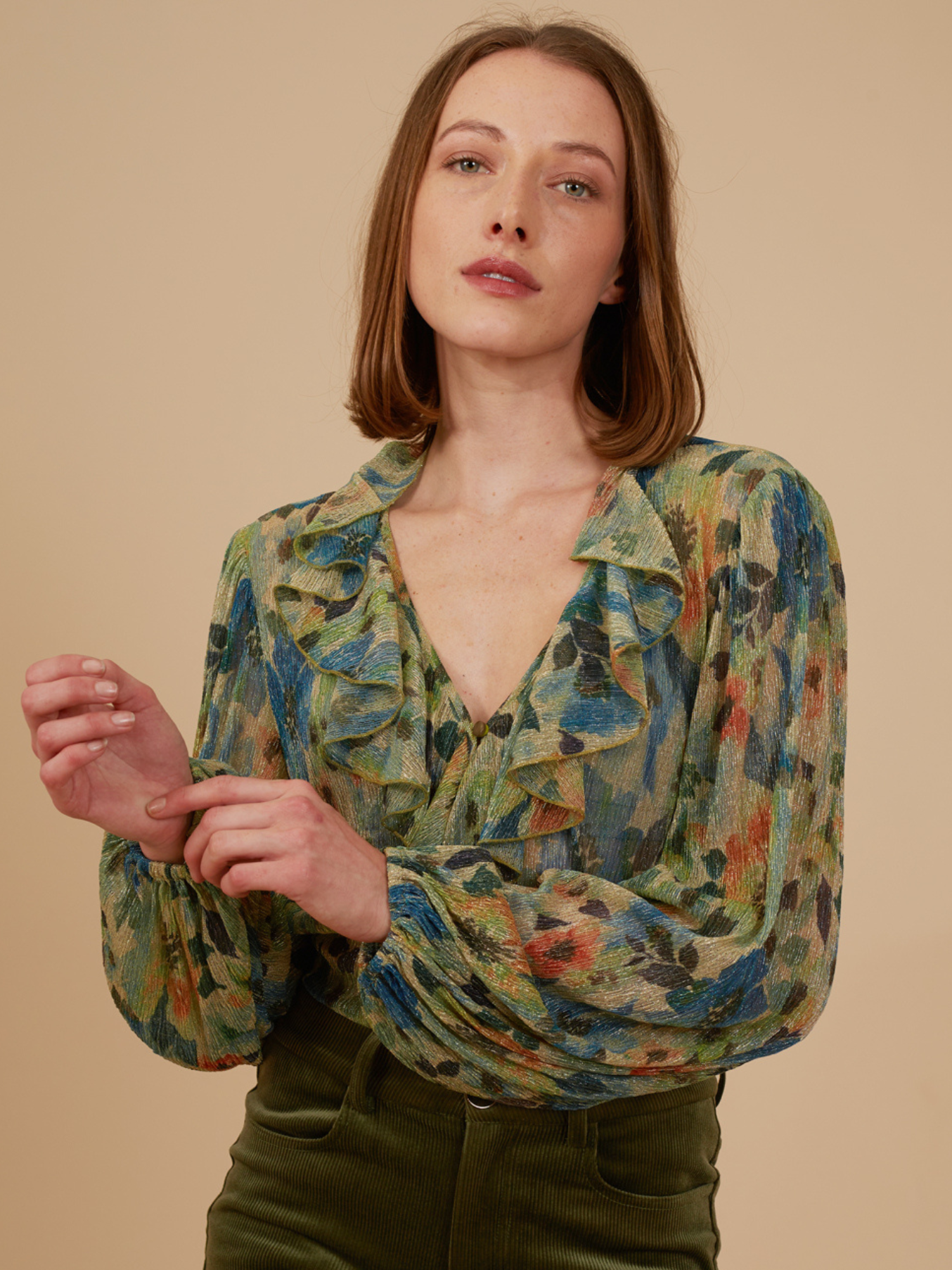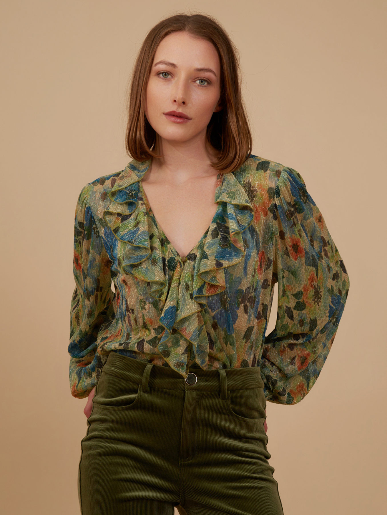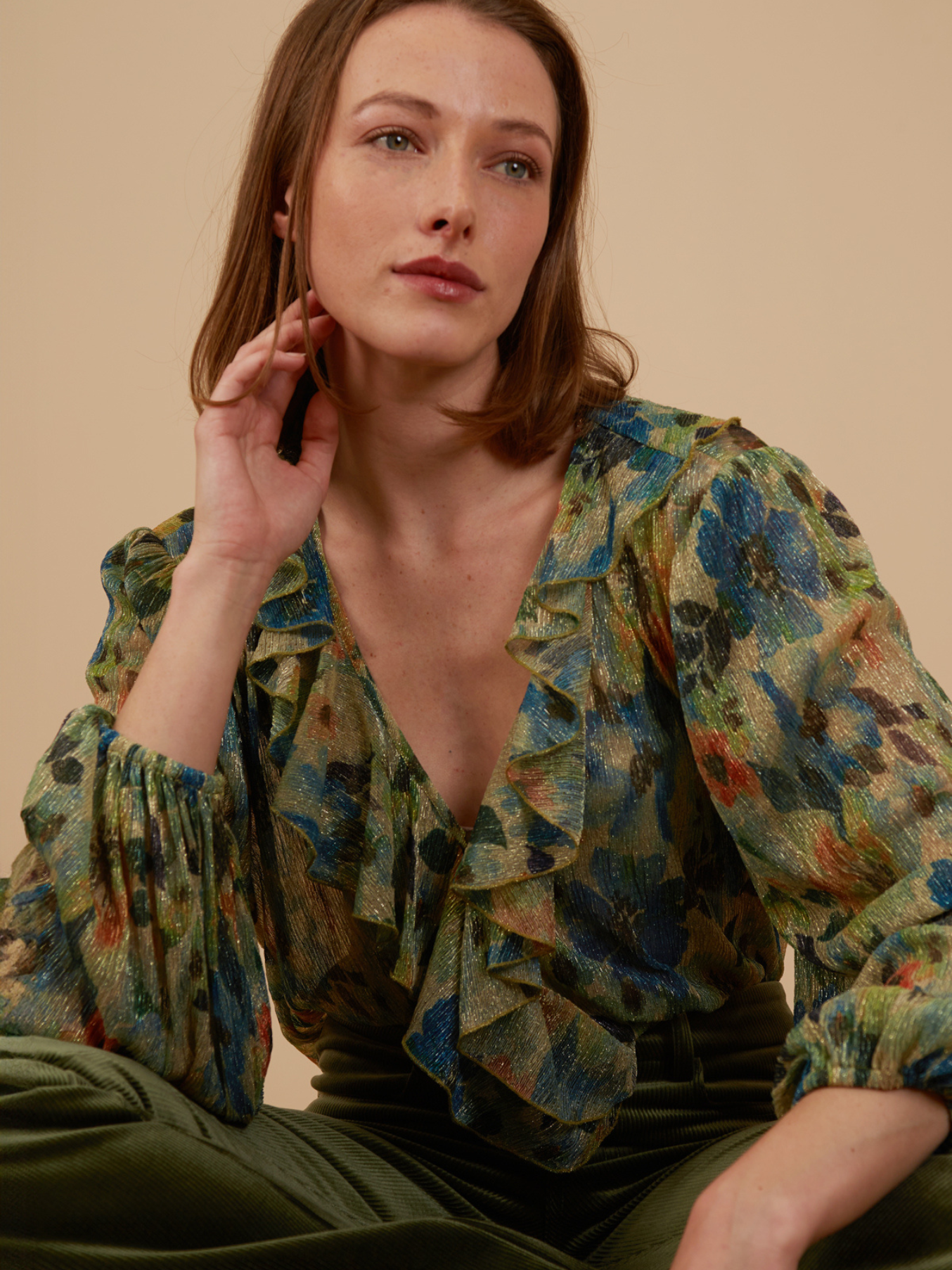 This long sleeved blouse has a beautiful frill collar following the neckline, with a stunning deep V-neck. Featured in this beautiful blue and green print with a gorgeous gold shimmer to it.