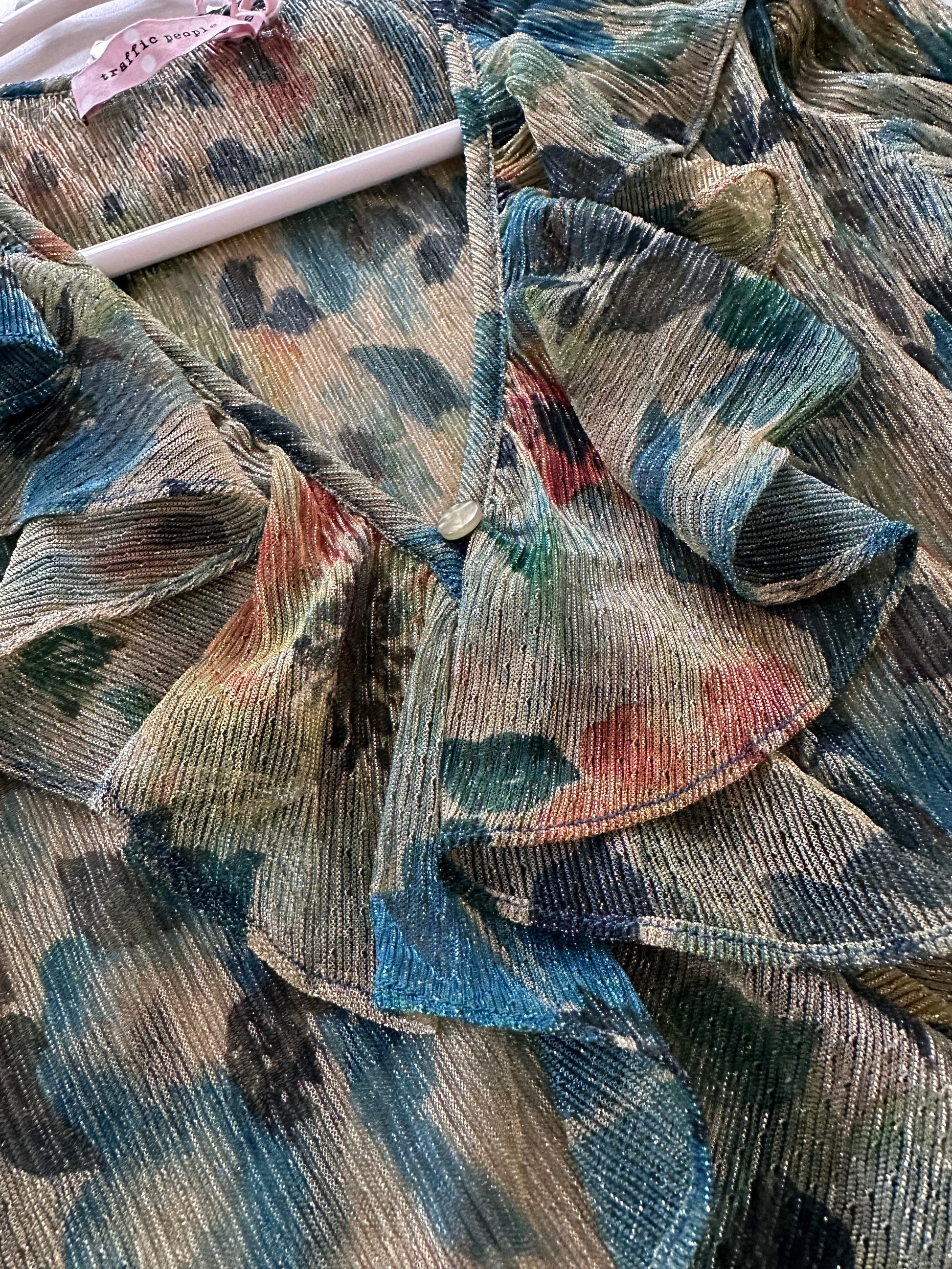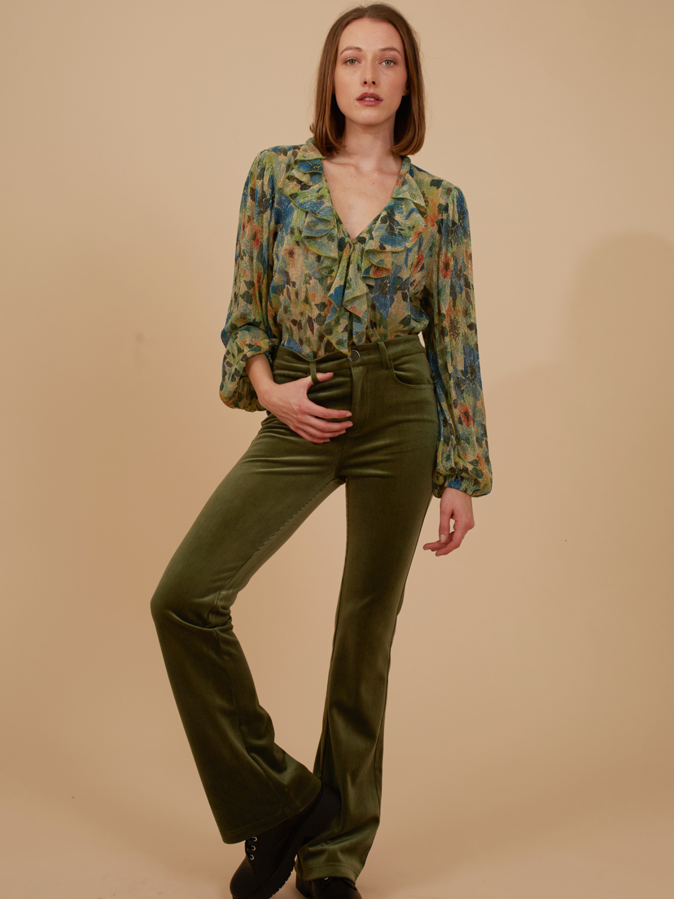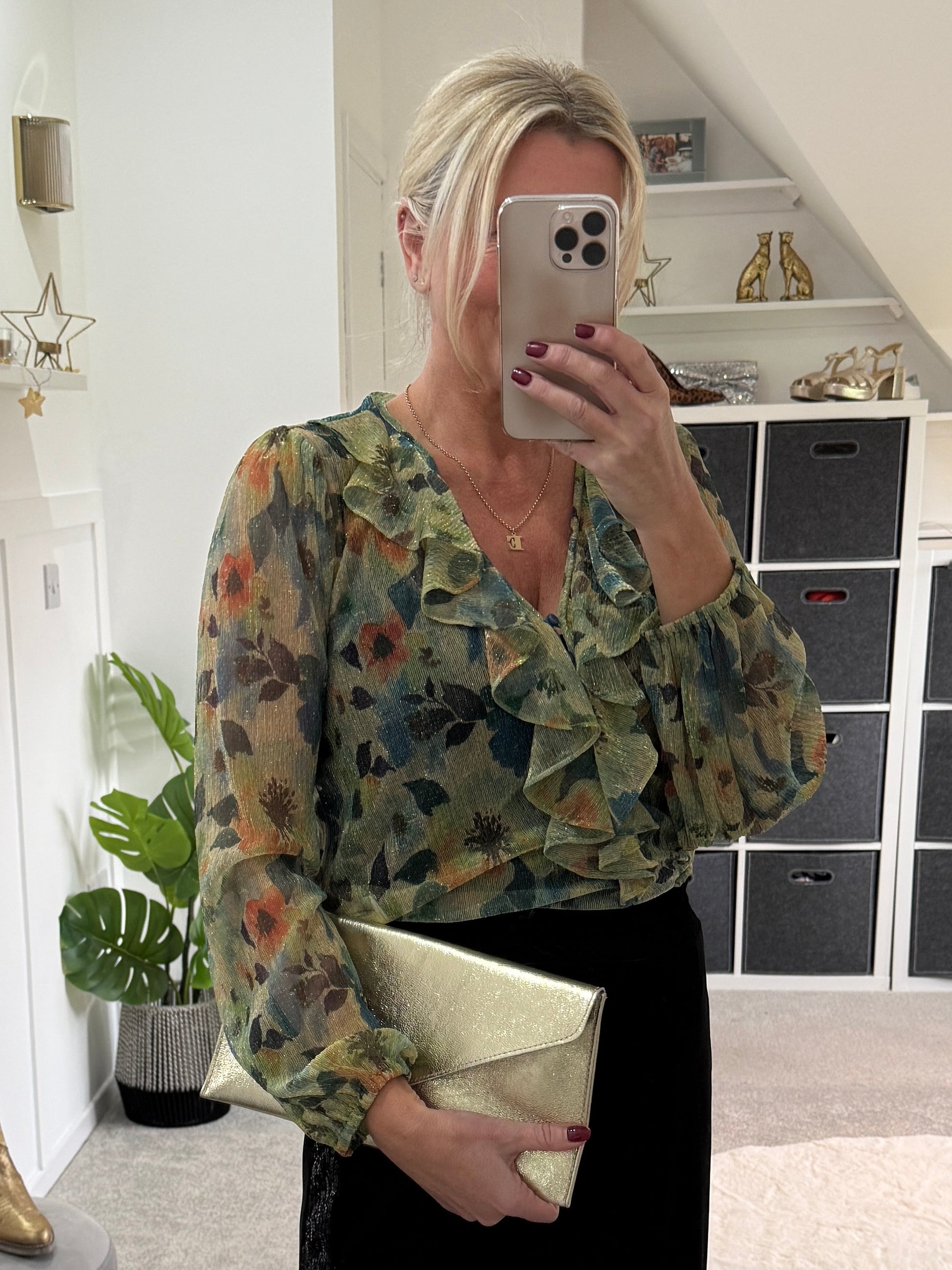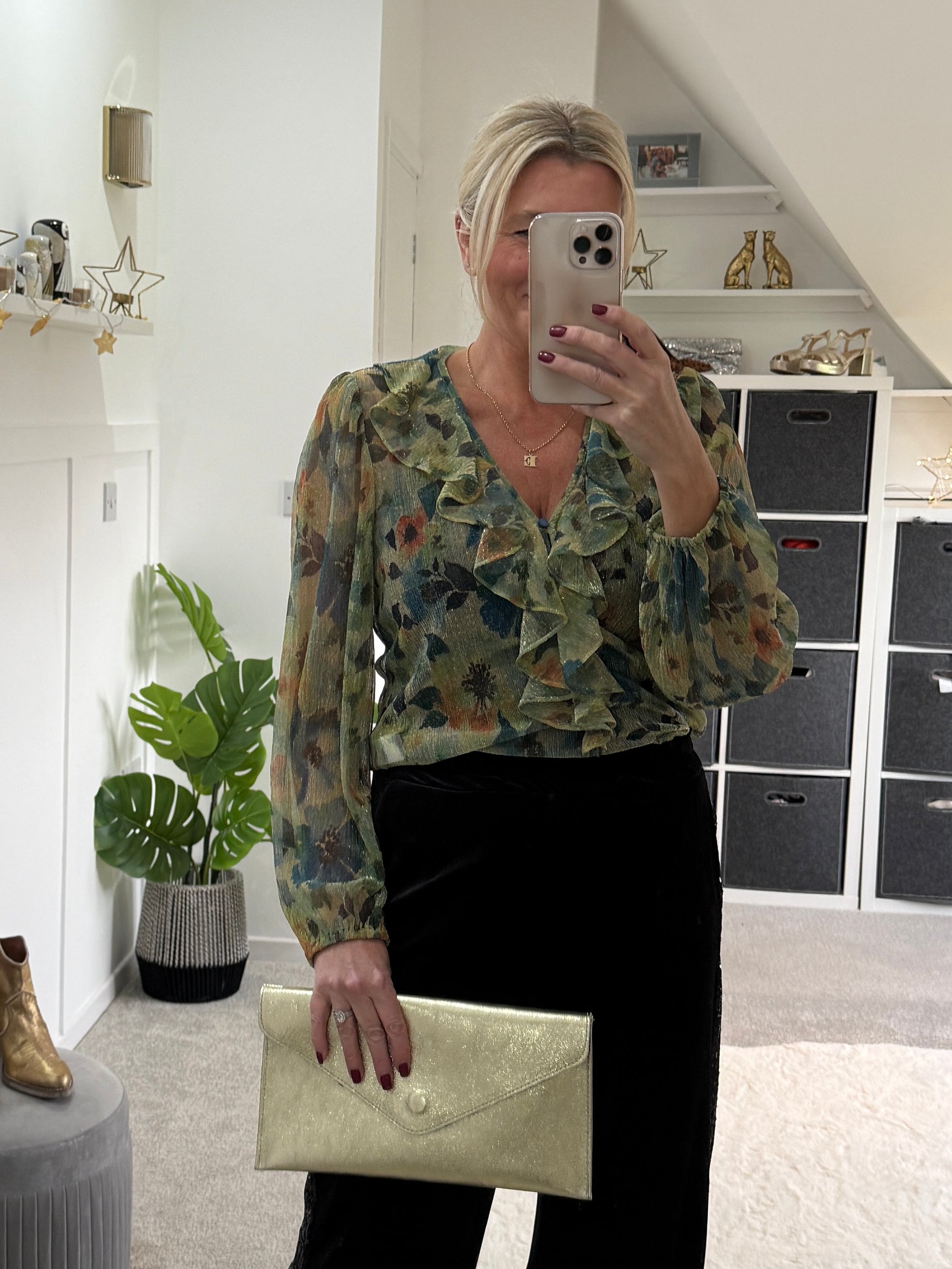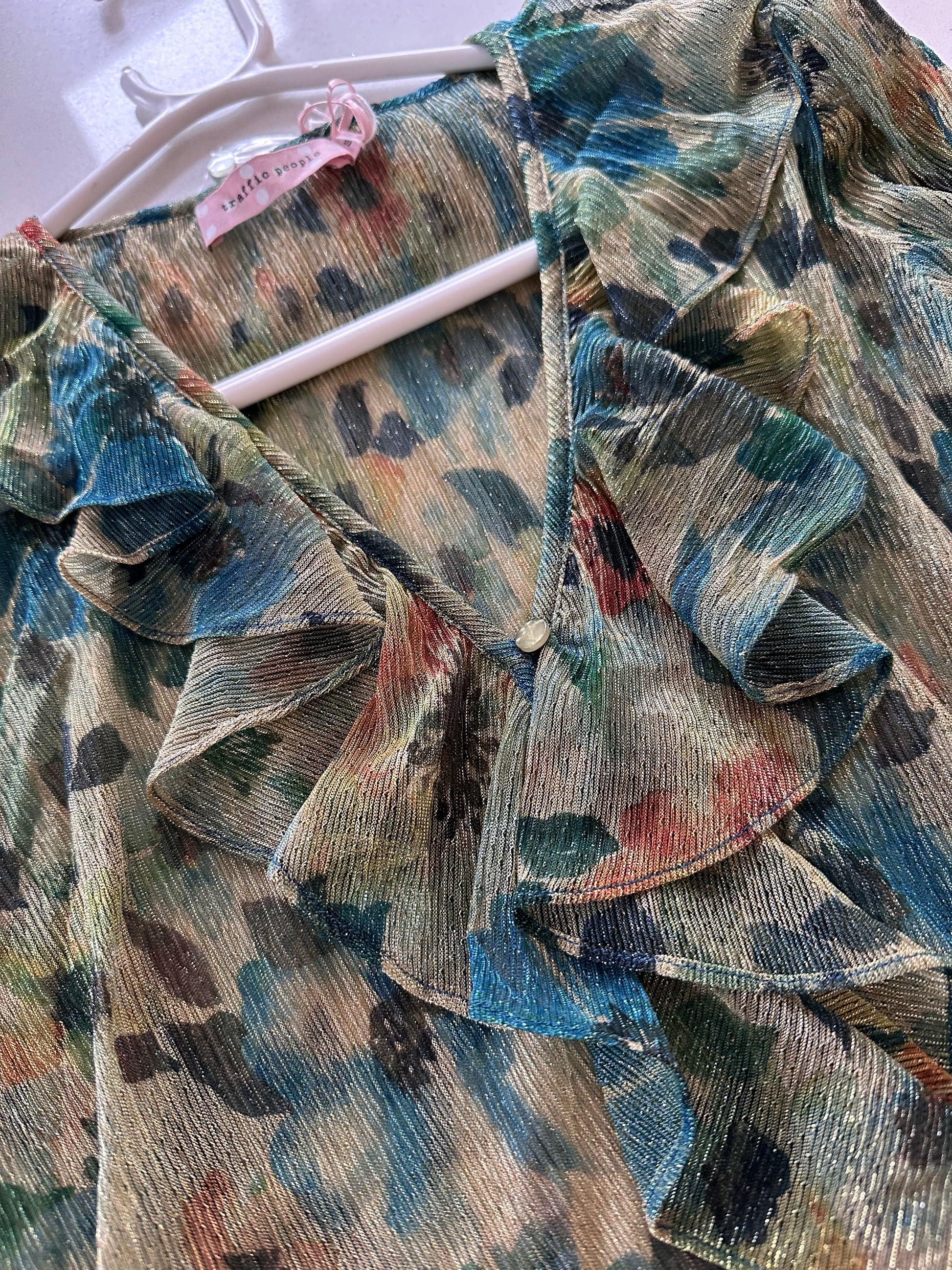 This long sleeved blouse has a beautiful frill collar following the neckline, with a stunning deep V-neck. Featured in this beautiful blue and green print with a gorgeous gold shimmer to it.